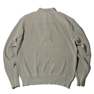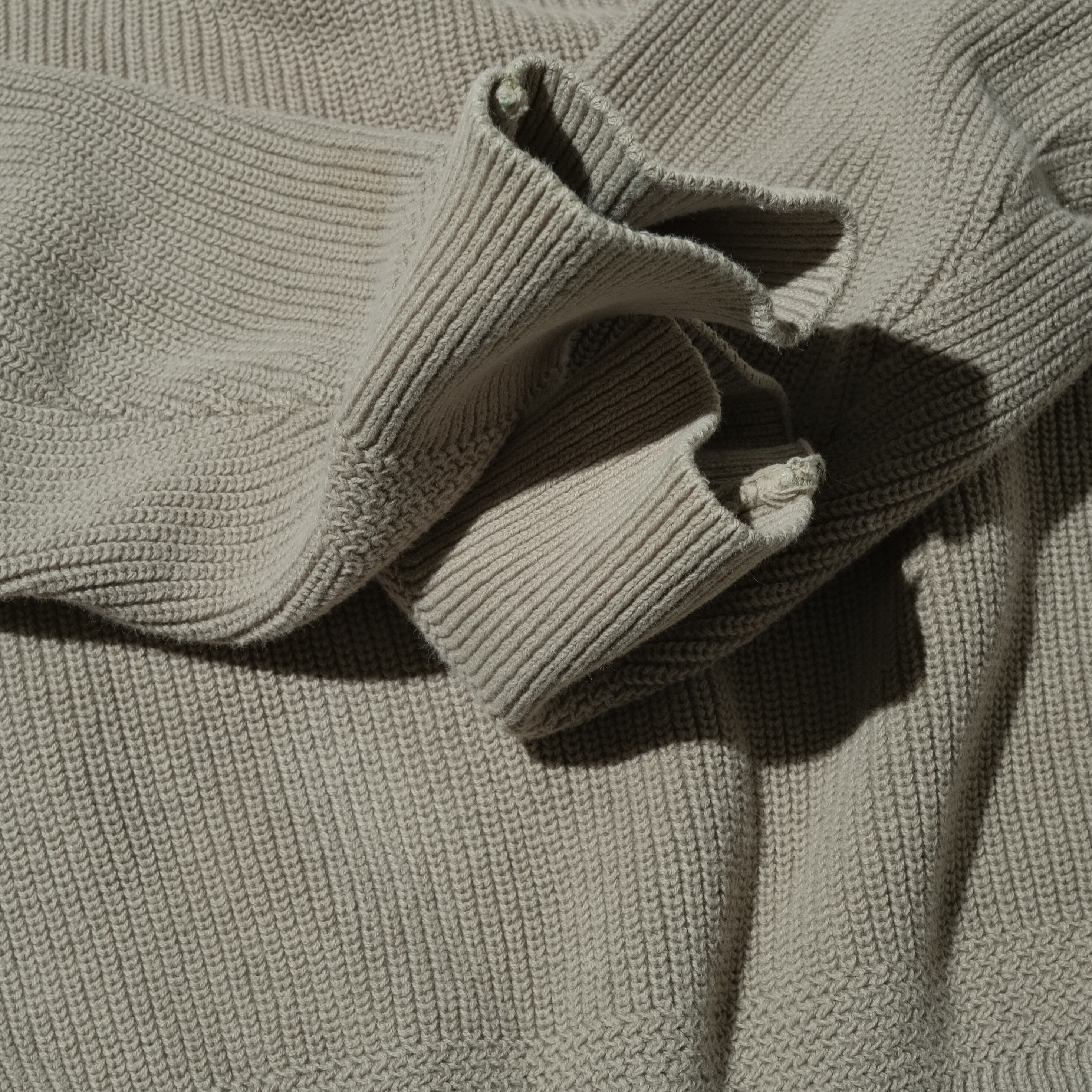 ミリタリーのセーターをデザインソースとした一枚、ミリタリーはウールやウールアクリルですがこちらはコットン100%、ご家庭でのケアもしやすいですし、チヂミも気にしなくていいですからシルエットも安定しています。