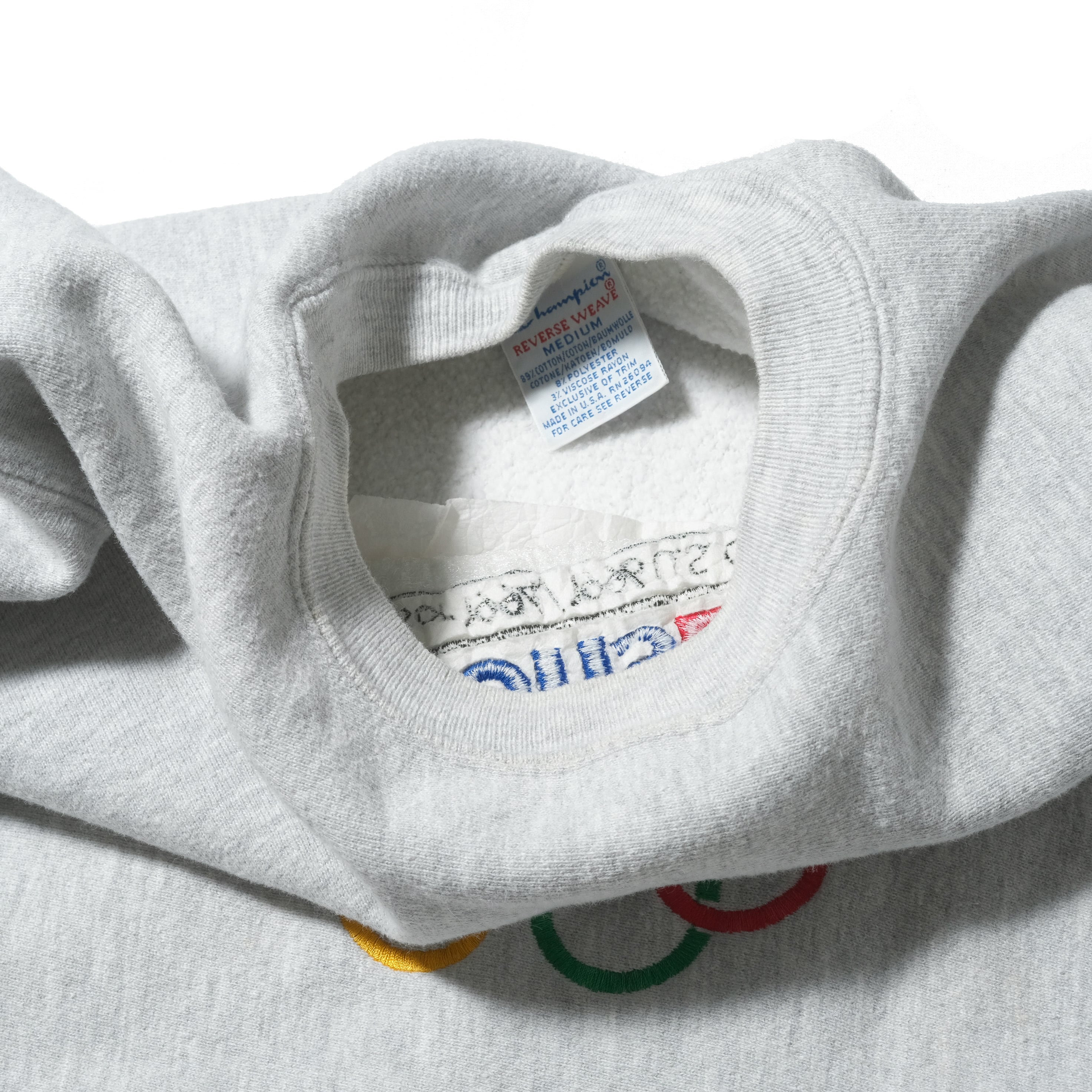 90'sのUSA製のもの、グレーボディにネーションズバンク(今でいうところのバンクオブアメリカといえばお分かりの方も多いでしょうか)の刺繍の入る一枚。USAオリンピックのオフィシャルスポンサーの表記、リバースだと当時の定価がほかブランドより高いため、企業ものの個体は少ない印象ですがさすがですね。