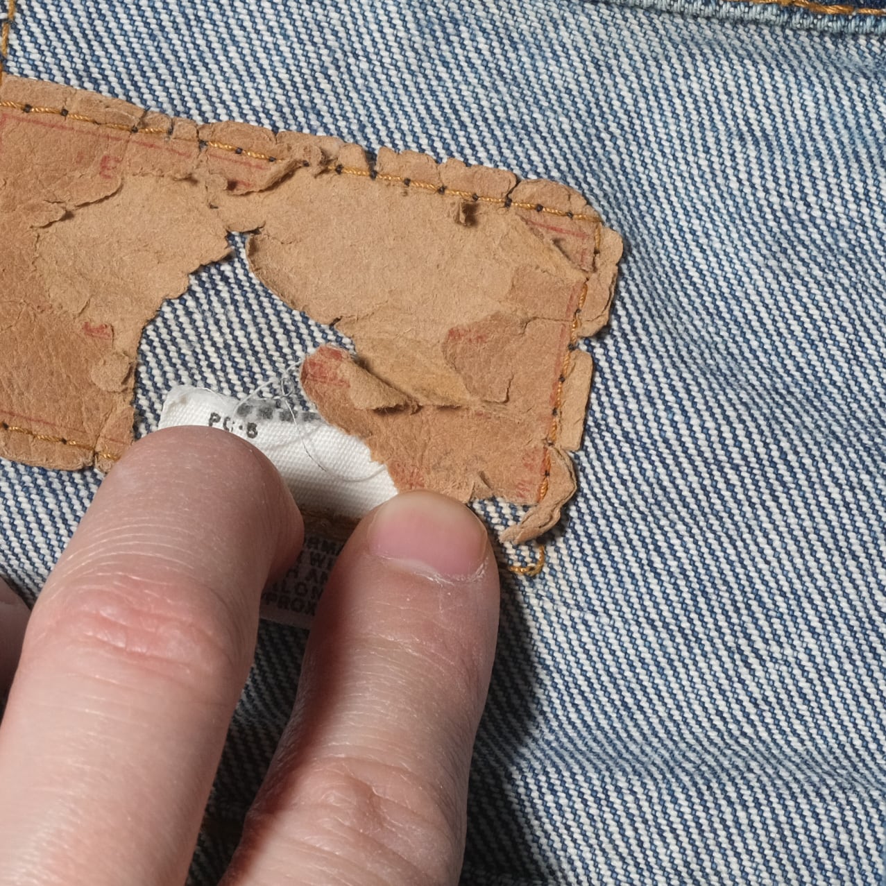 こちらは布のタイプのケアタグのつく個体、赤タブの縦糸が抜けており判別できませんが、BIG-E最終もしくは66前期の年代に製造されたであろう個体です。