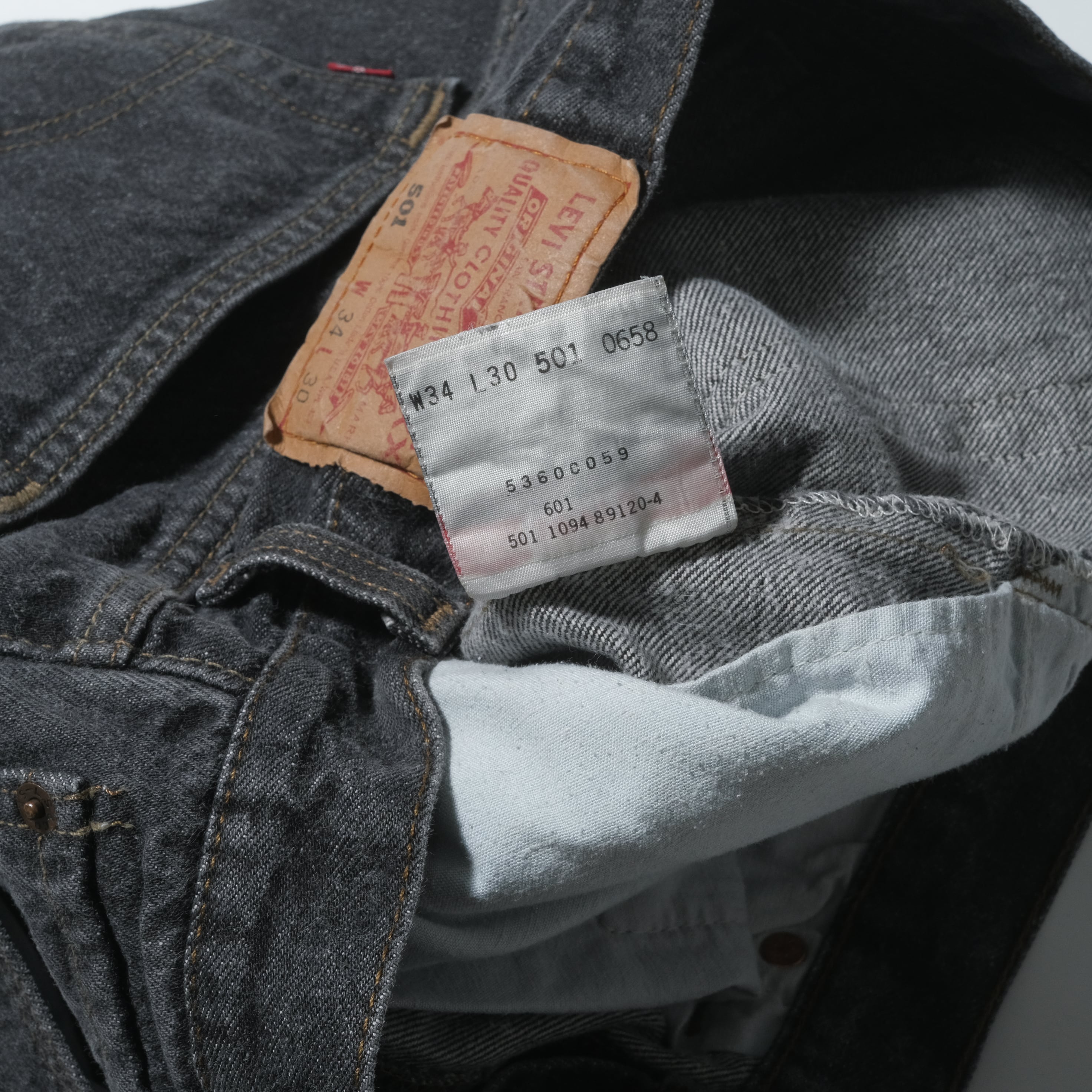 94年、USA製。いわゆる先染めのブラックの個体。かなりしっかりとブラックインディゴが残ったコンディションですが、裾上げされているためこちらのプライスに設定いたしました。