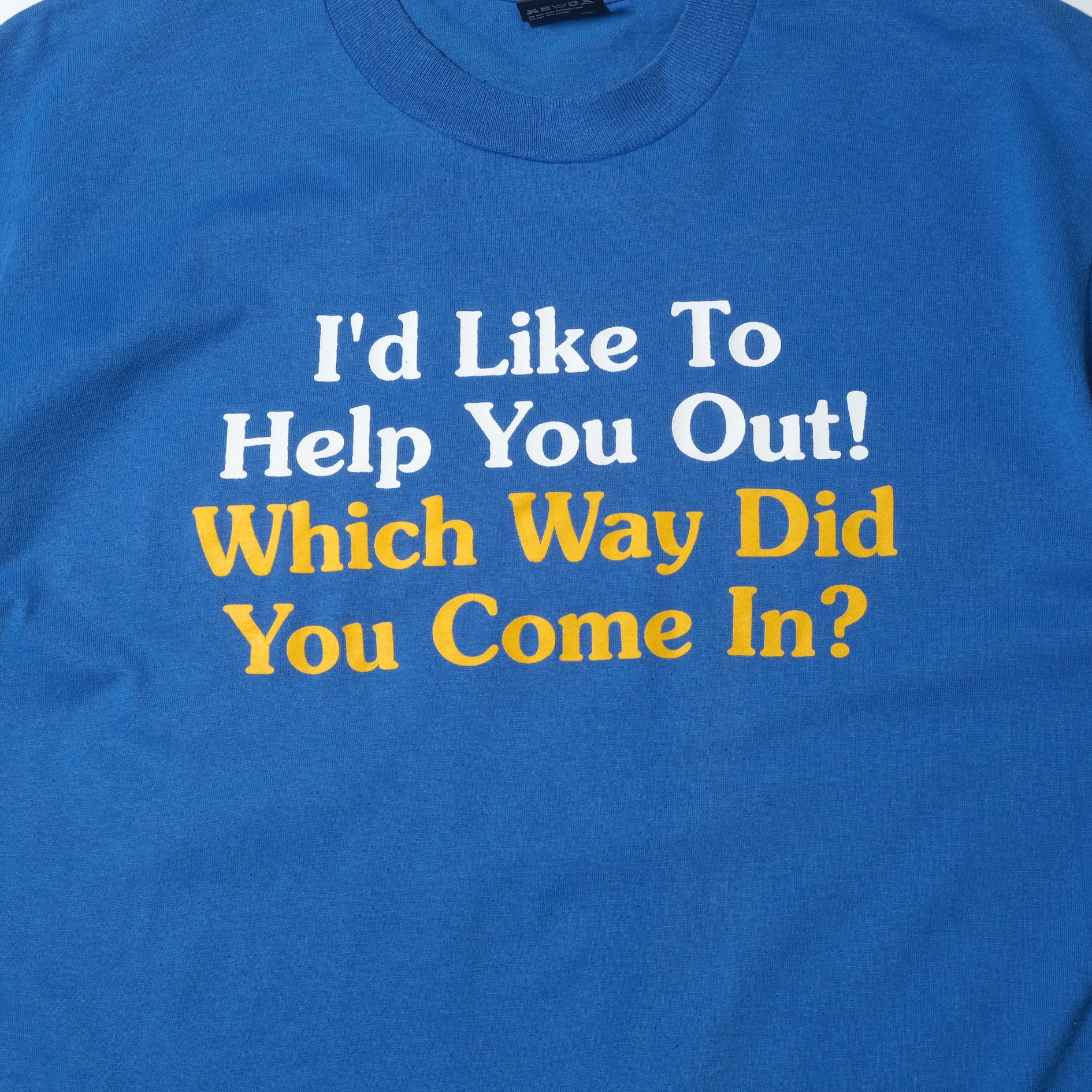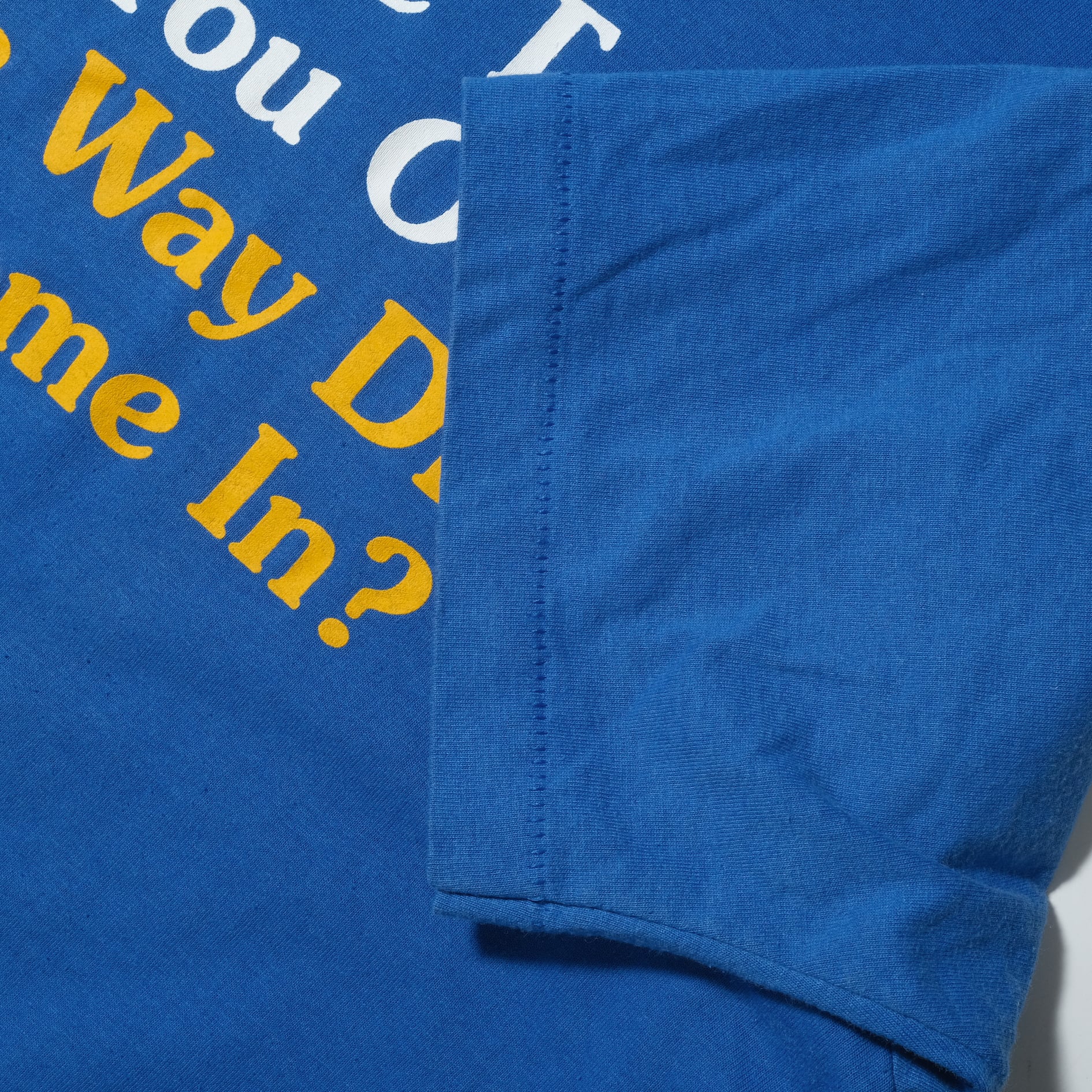 フロントに慣用句的な言葉の記された一枚。直訳するとあなたを"お手伝いしたいです。どこから入って来ましたか?”となるのですが、実際には”なぜここにいるの?”といったニュアンスの言葉のようです。個人的にはこういった一見すると我々日本人からはわからないような言葉がプリントされているTシャツにアメリカらしさを感じ、今年は見つければ仕入れしております。