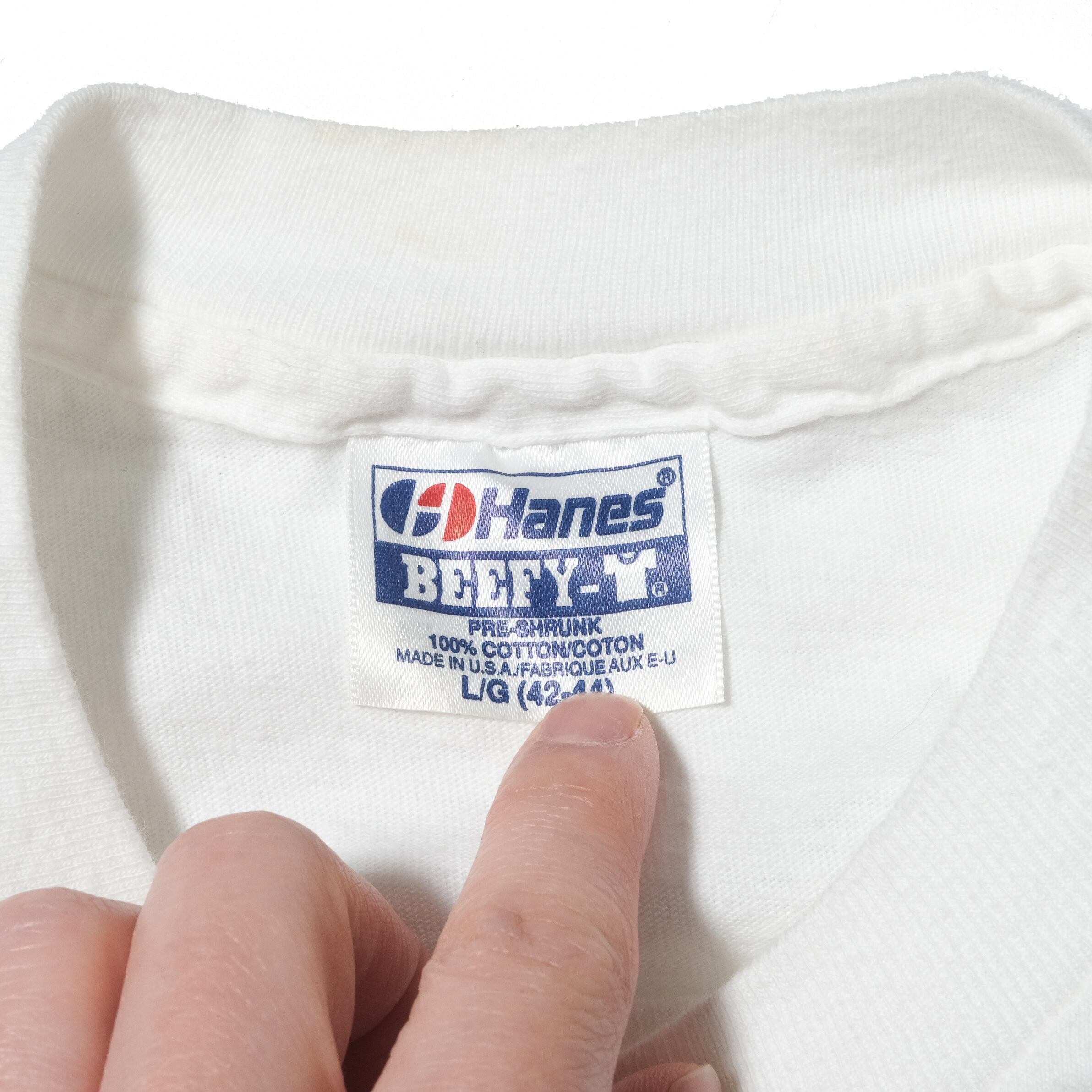 ボディも80'sのHanes BEEFY、コットン100%のタイプでホワイト、そしてサイズもLと完璧です。個人的にもグッとくる一枚です。