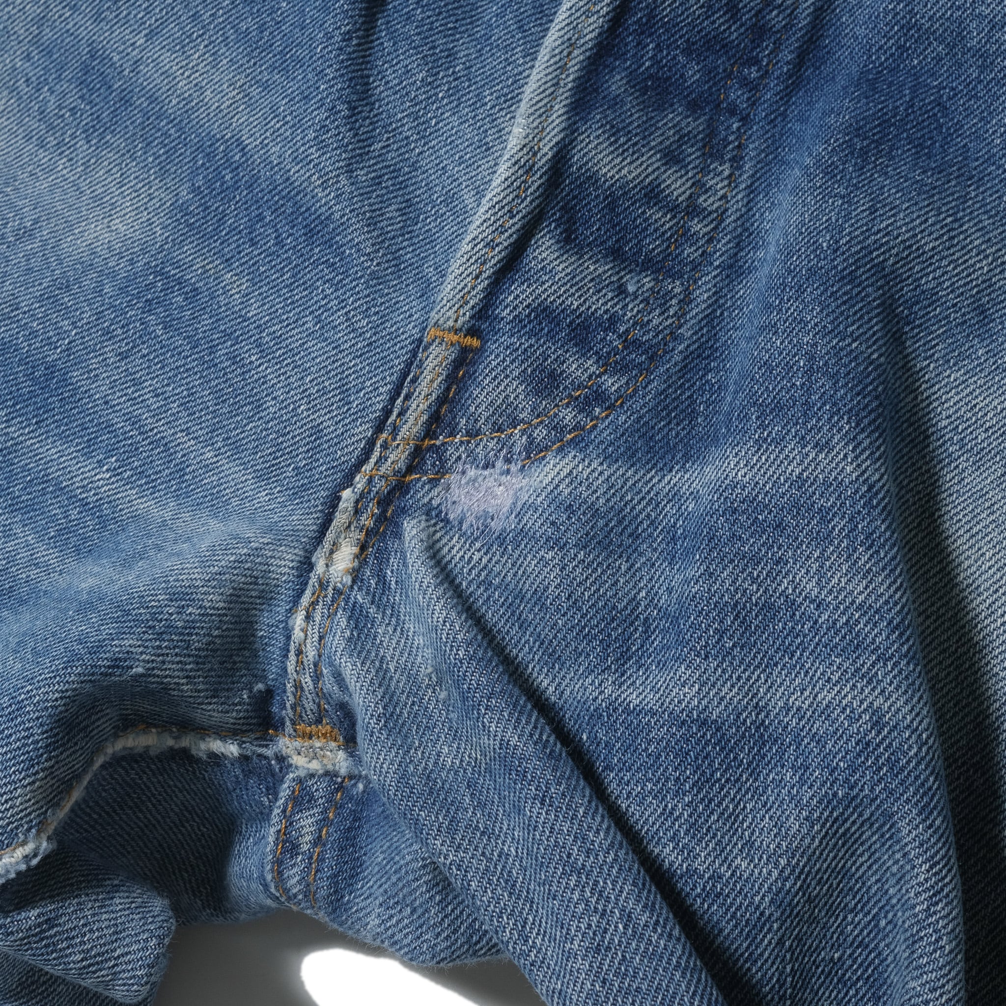 リペアもオリジナルのステッチを活かしつつ目立ちづらいブルーグレーの糸で股のステッチを補強、そして馴染みやすい綿糸でダメージ部分はタタキを入れる方法で直しましたので安心して長く愛用いただけます。