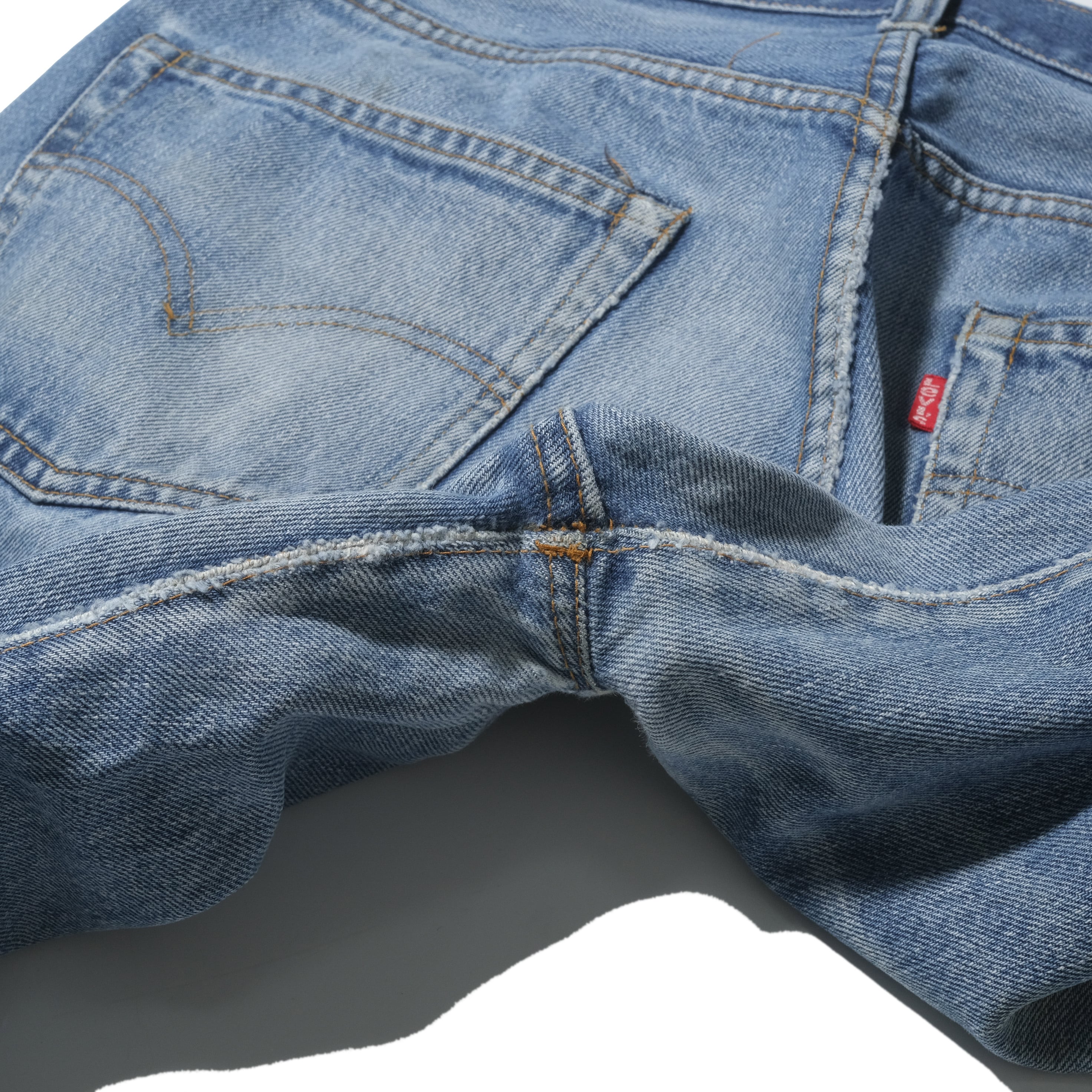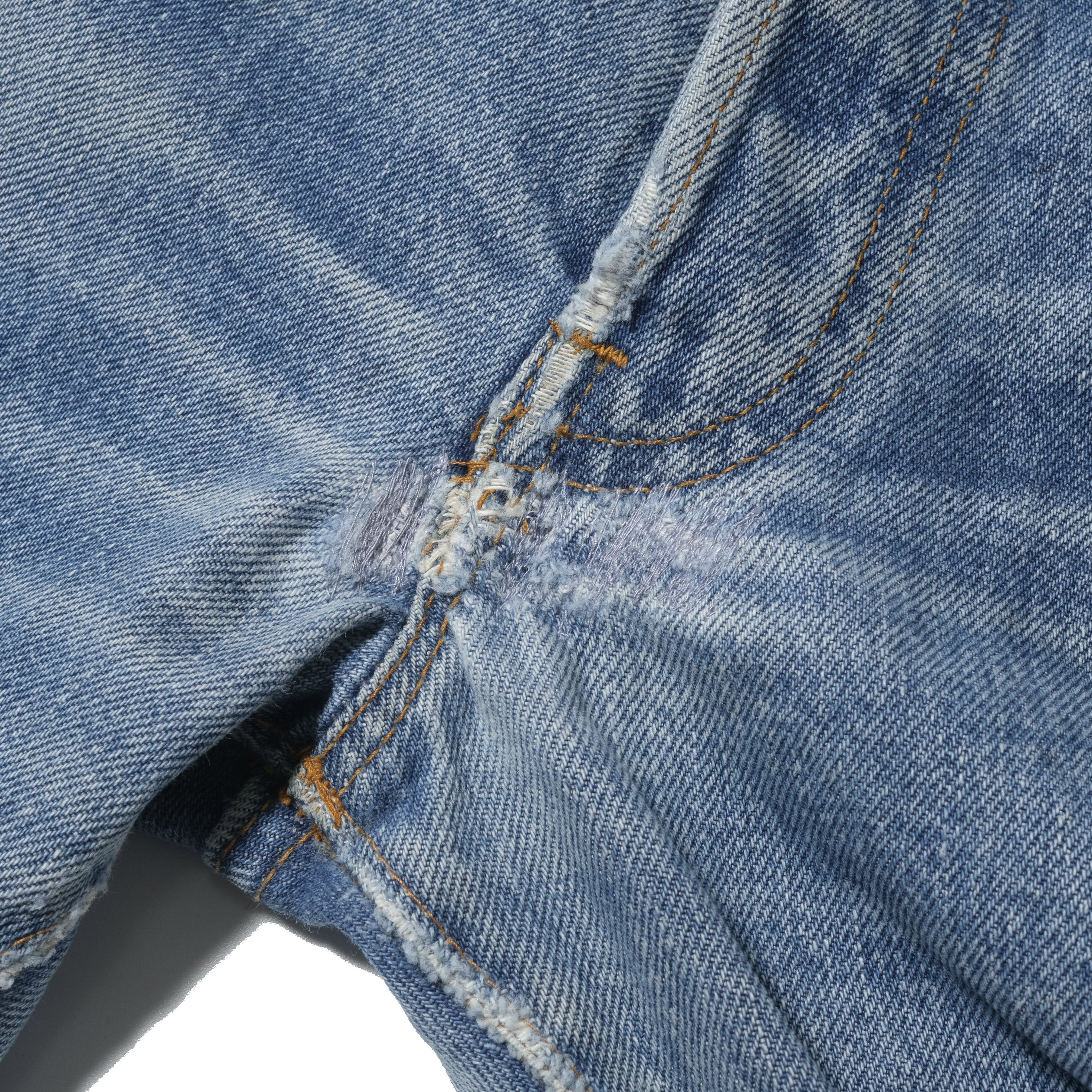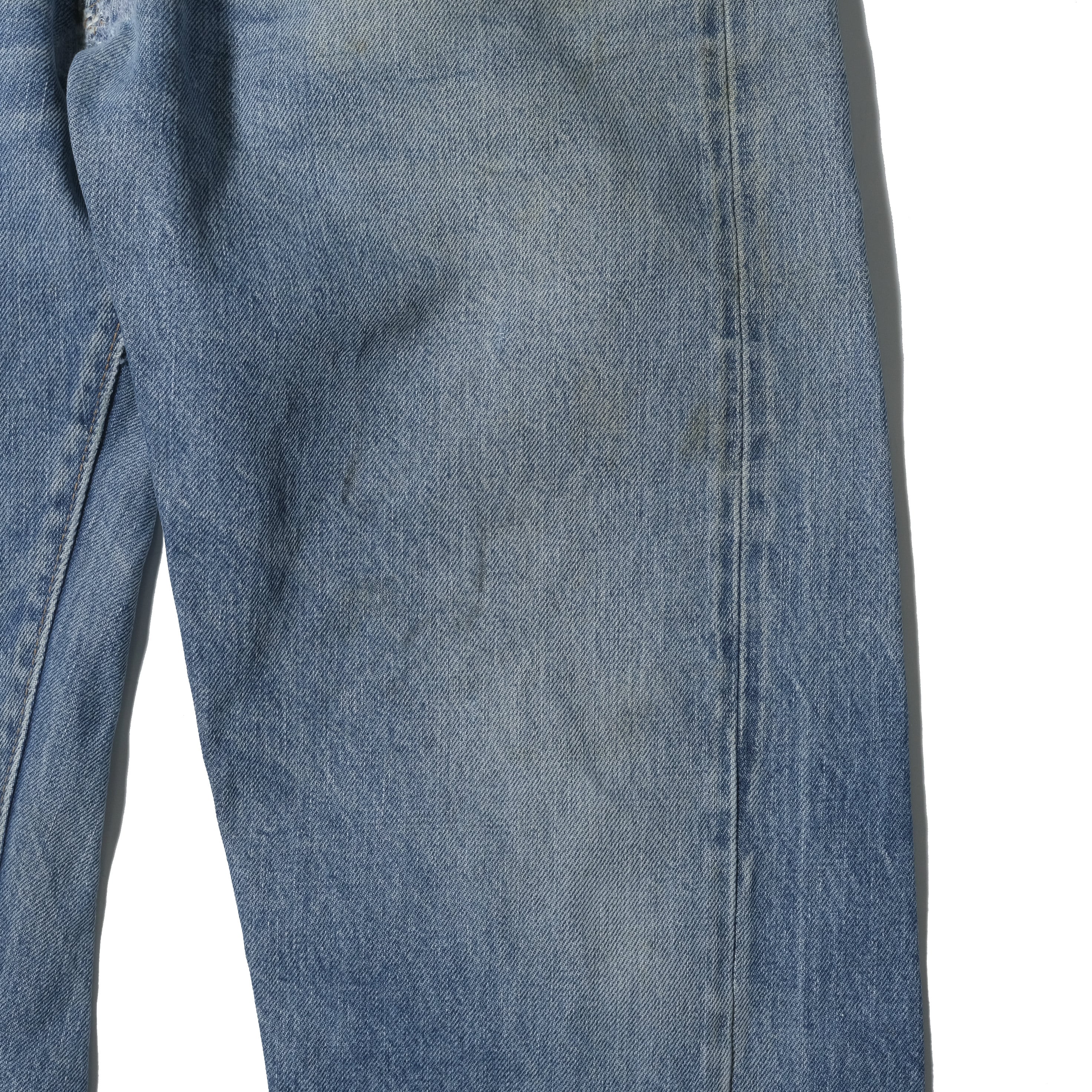 【状態】着用感、スレ。フェード。汚れ。股部にダメージがありましたので当店にてリペアいたしました。また、股部にステッチのほつれがありましたので目立たないようブルーグレイのステッチで補強しております。目立つダメージやヨゴレなど見当たりません。