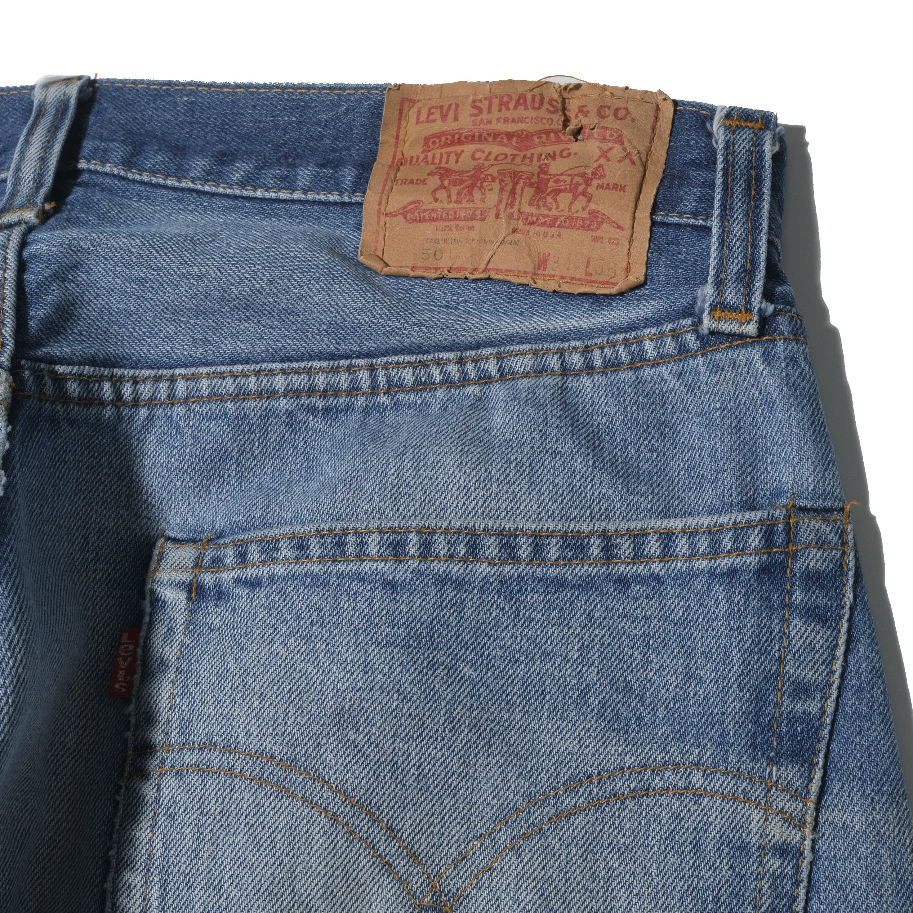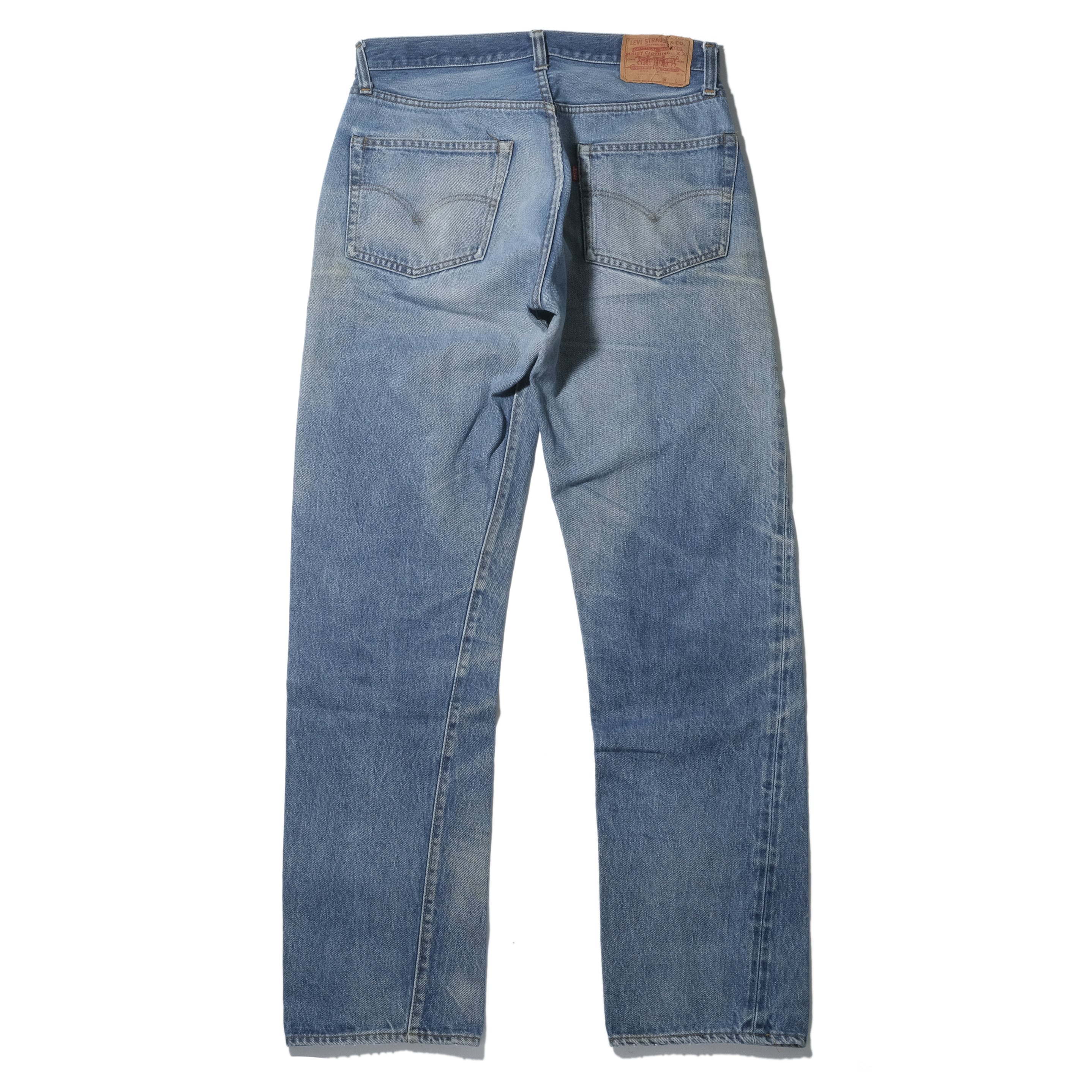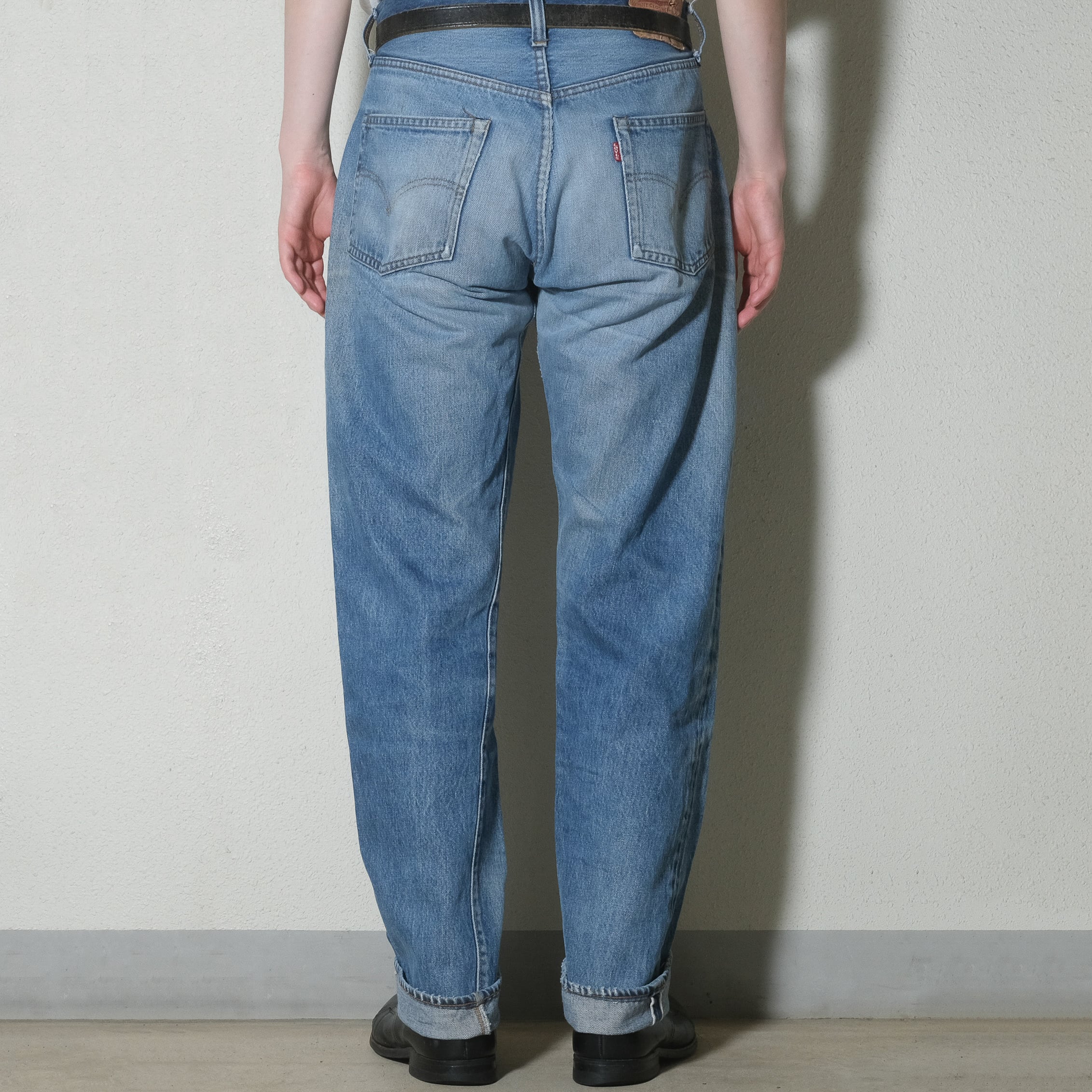 フロントにヒゲの入った素晴らしい色落ちのもの、サイズはヴィンテージらしくしっかりと縮みが入って実寸で32.5x32、せっかく耳がついておりますので耳を見せて着用されたい方には非常に好条件の一本と言えるかと思います。
