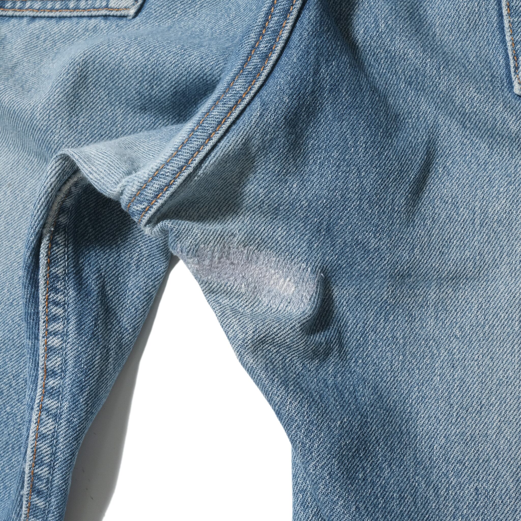 穿き込まれていることにより股部分にダメージがありましたので当店にてリペアを入れ、それを加味したプライスに設定しております。