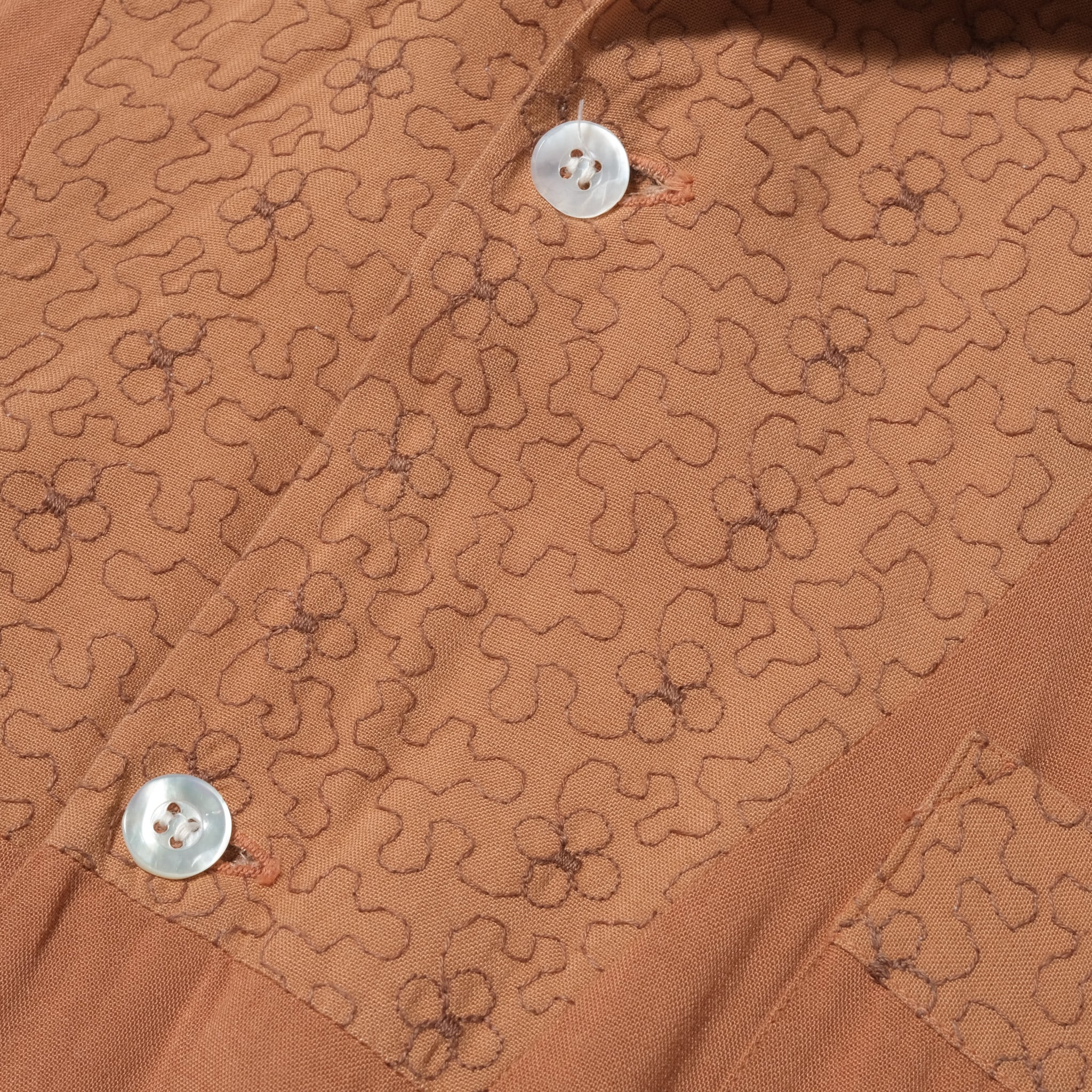 ブランドはWaldorf。フロントとポケットに切り替え生地、そして花柄の刺繍が入った非常にクールな一枚。こう言った装飾の入るものの中では無地にも近く合わせやすさも兼ね備えた一枚かと思います。