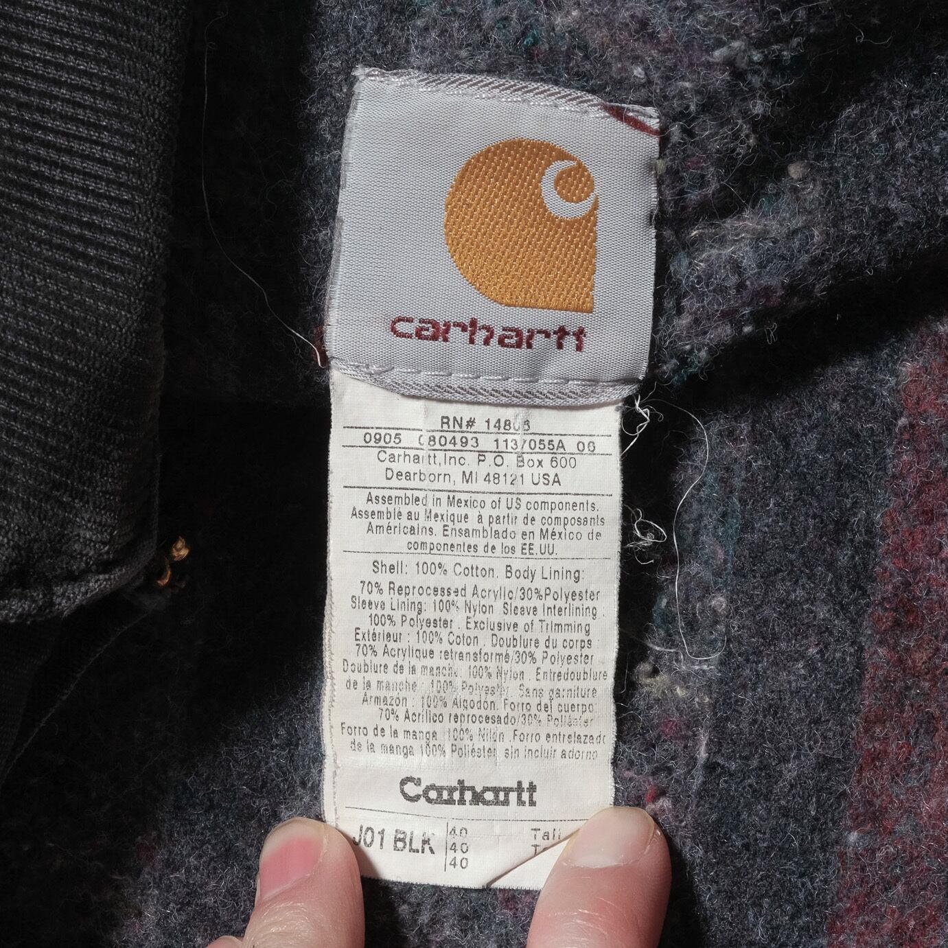 05年、メキシコ製のもの。ブラックのカーハートですと2010年以降のものが多い中、メキシコ製の年代ながらこちらは比較的古めの個体になります。