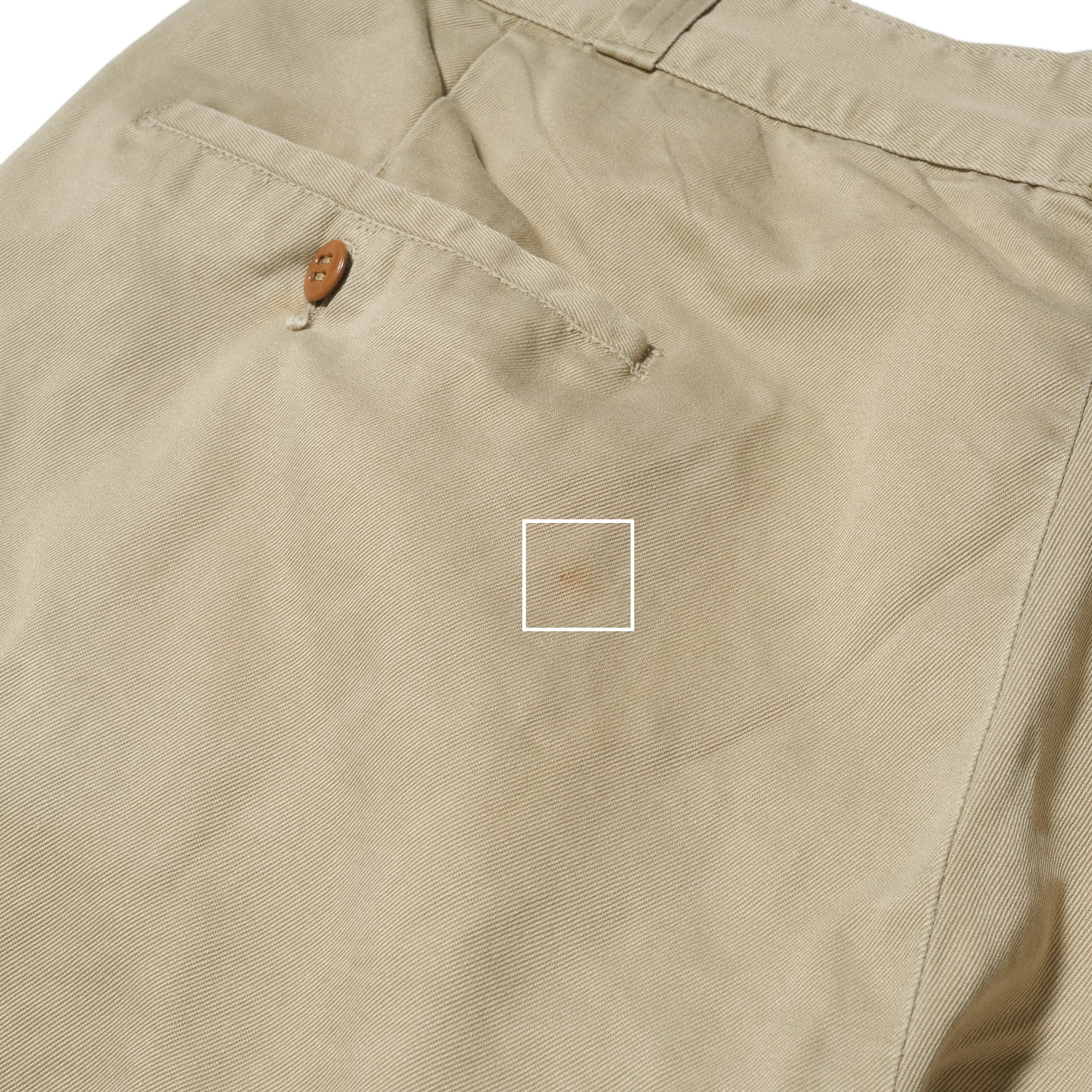 【状態】着用感、スレ。ところどころヨゴレ。腰、腰部サイドのステッチにほつれが見られましたので当店にてリペアいたしました。ヒップにリペア。大きく目立つダメージやヨゴレなど見当たりません。