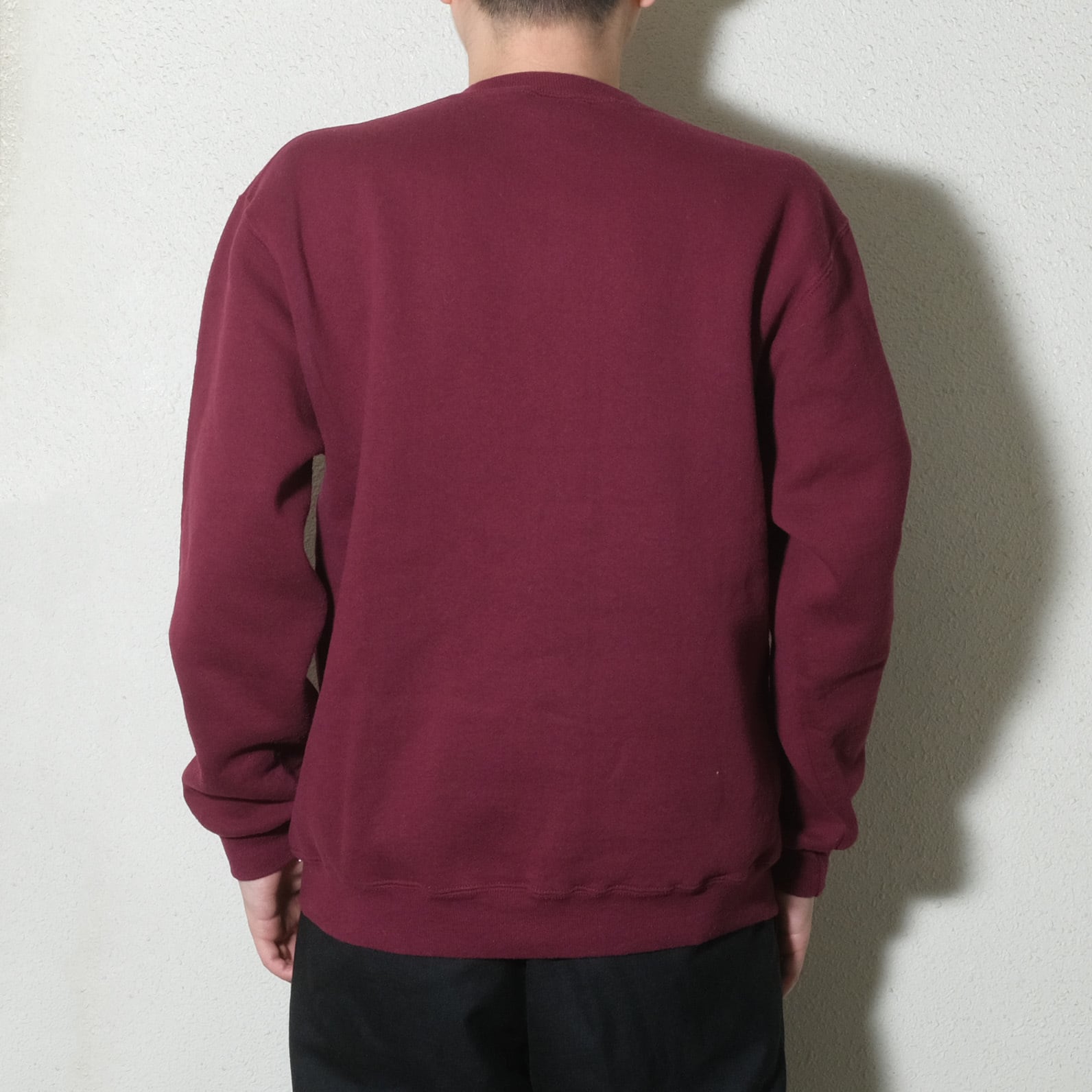 90'sのUSA製、まだまだ生地にハリの残るバーガンディカラーのもの。この落ち着いたカラーでリブが伸びてない個体は少し襟が詰まって綺麗めに着用いただけます。