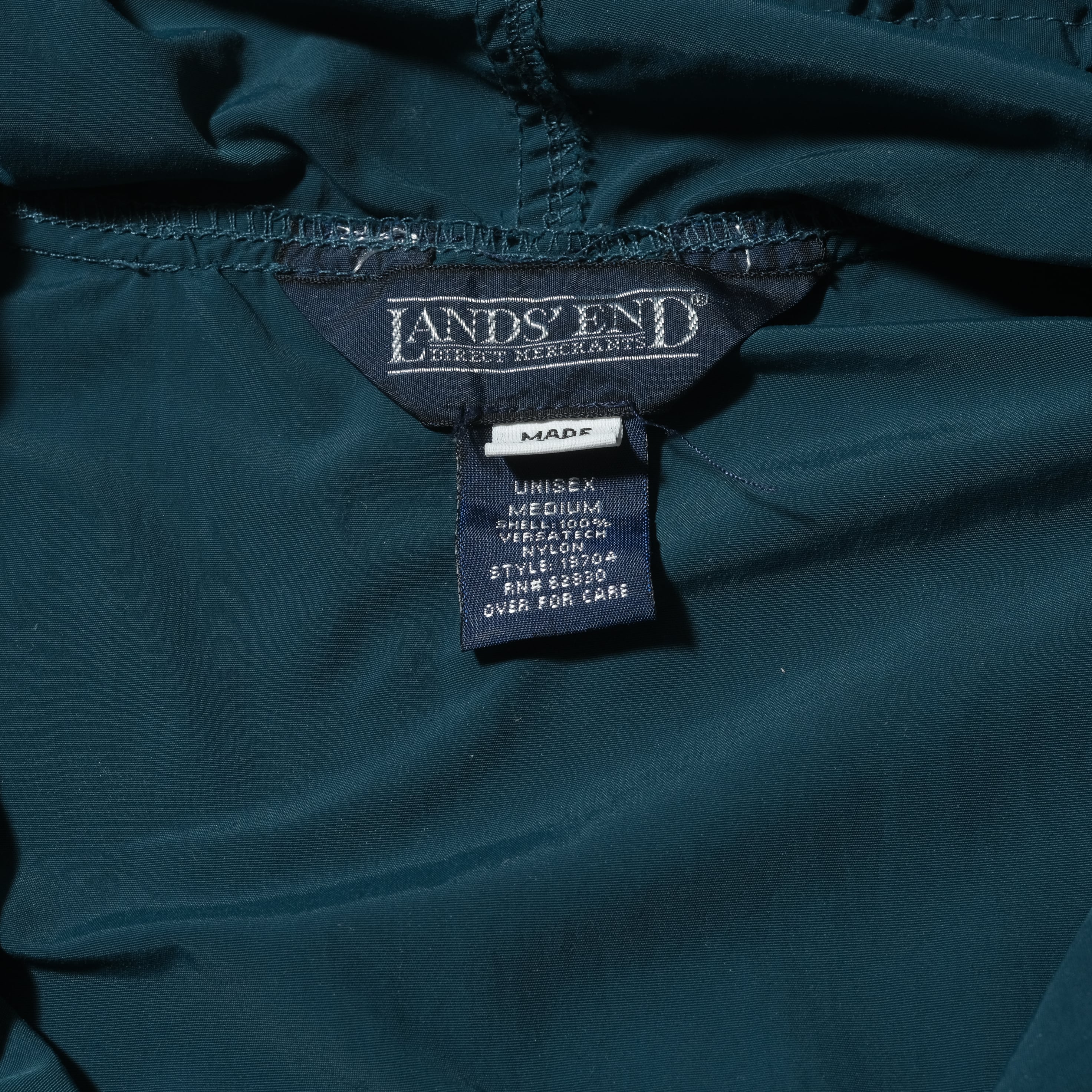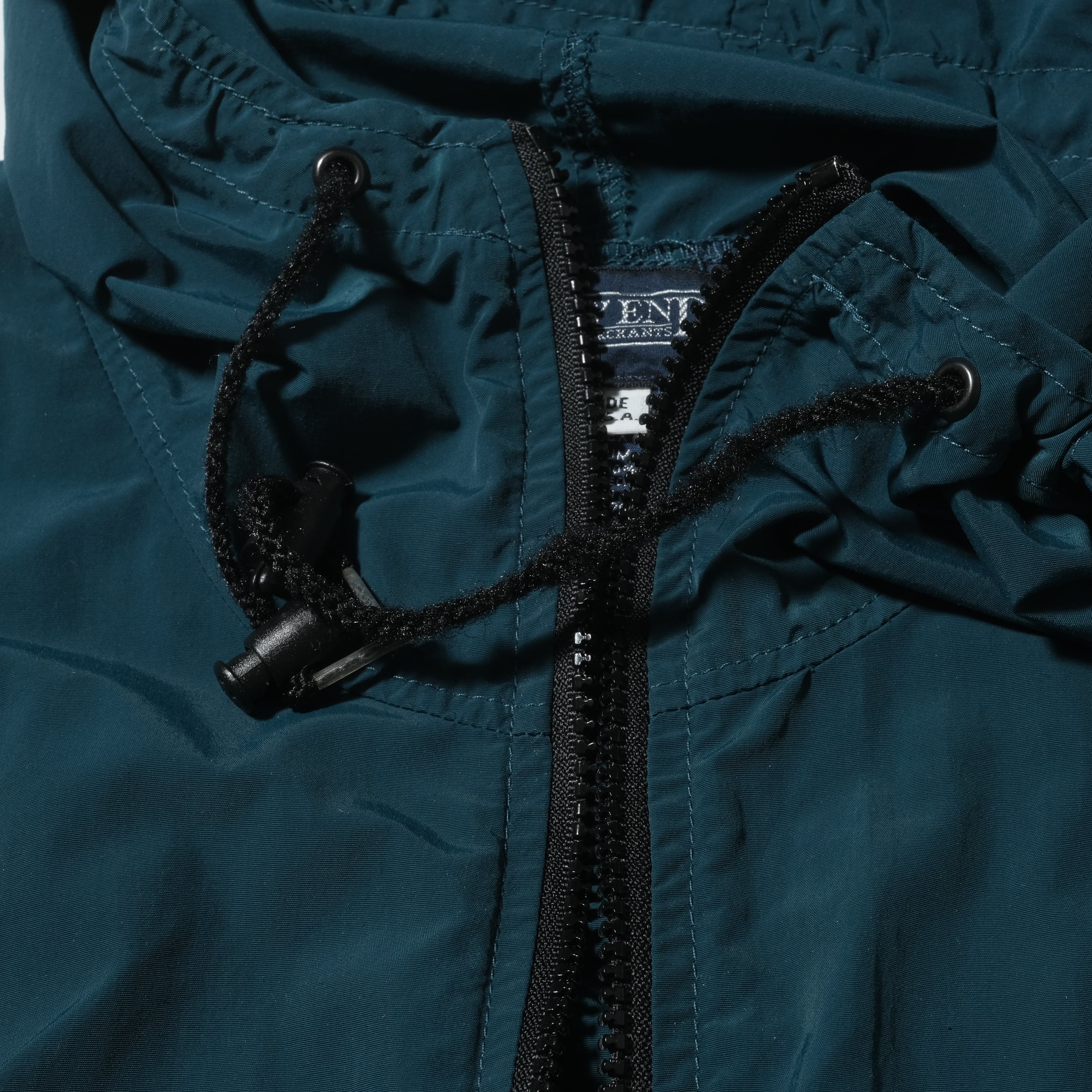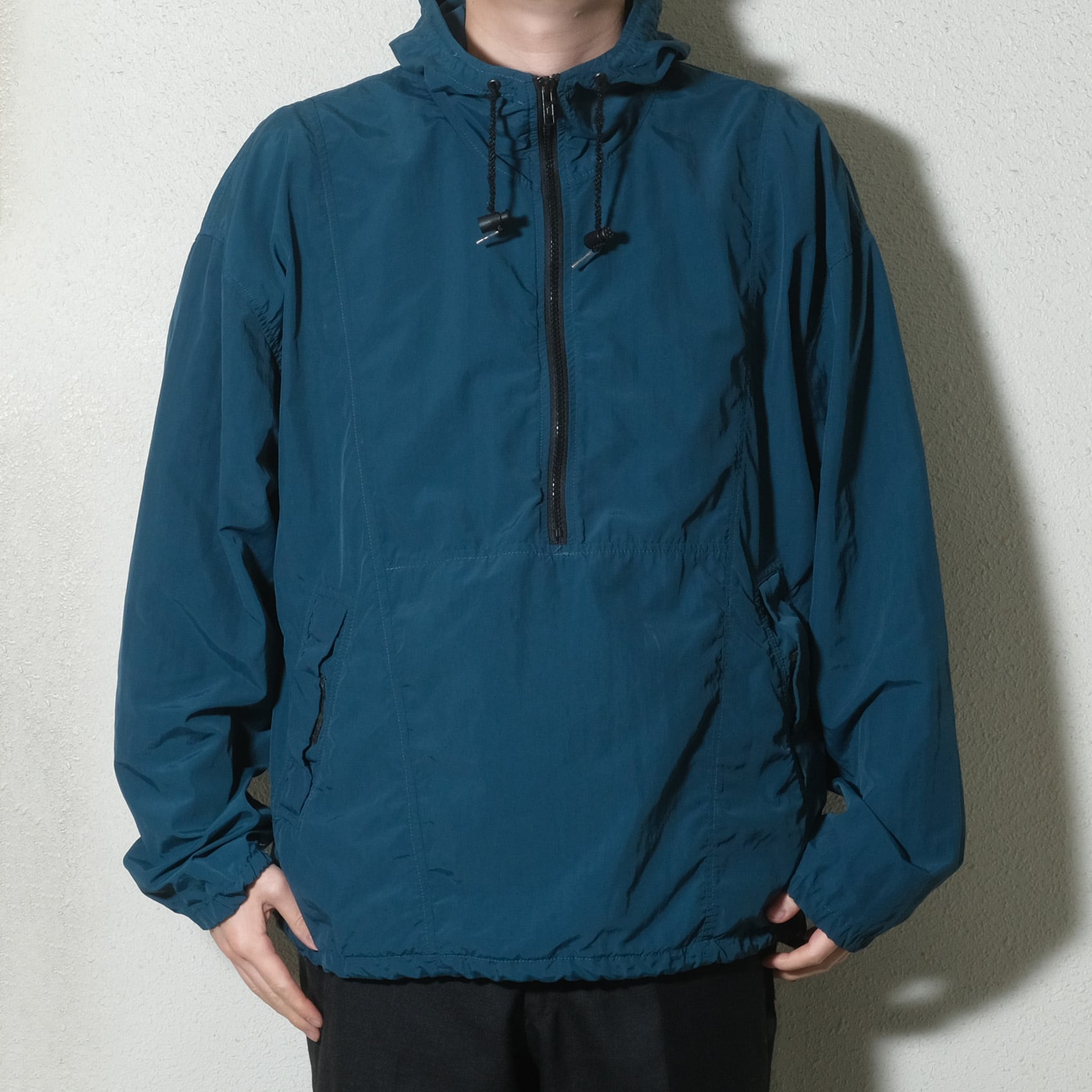 80'sごろ、LANDS'ENDのもの。暗めのブルーとグリーンの中間のような色味、いわゆるティールといった感じでしょうか。パッカブルタイプでしっかりとUSA製。ドローコート付きで裾を絞って着用できるもポイントです。