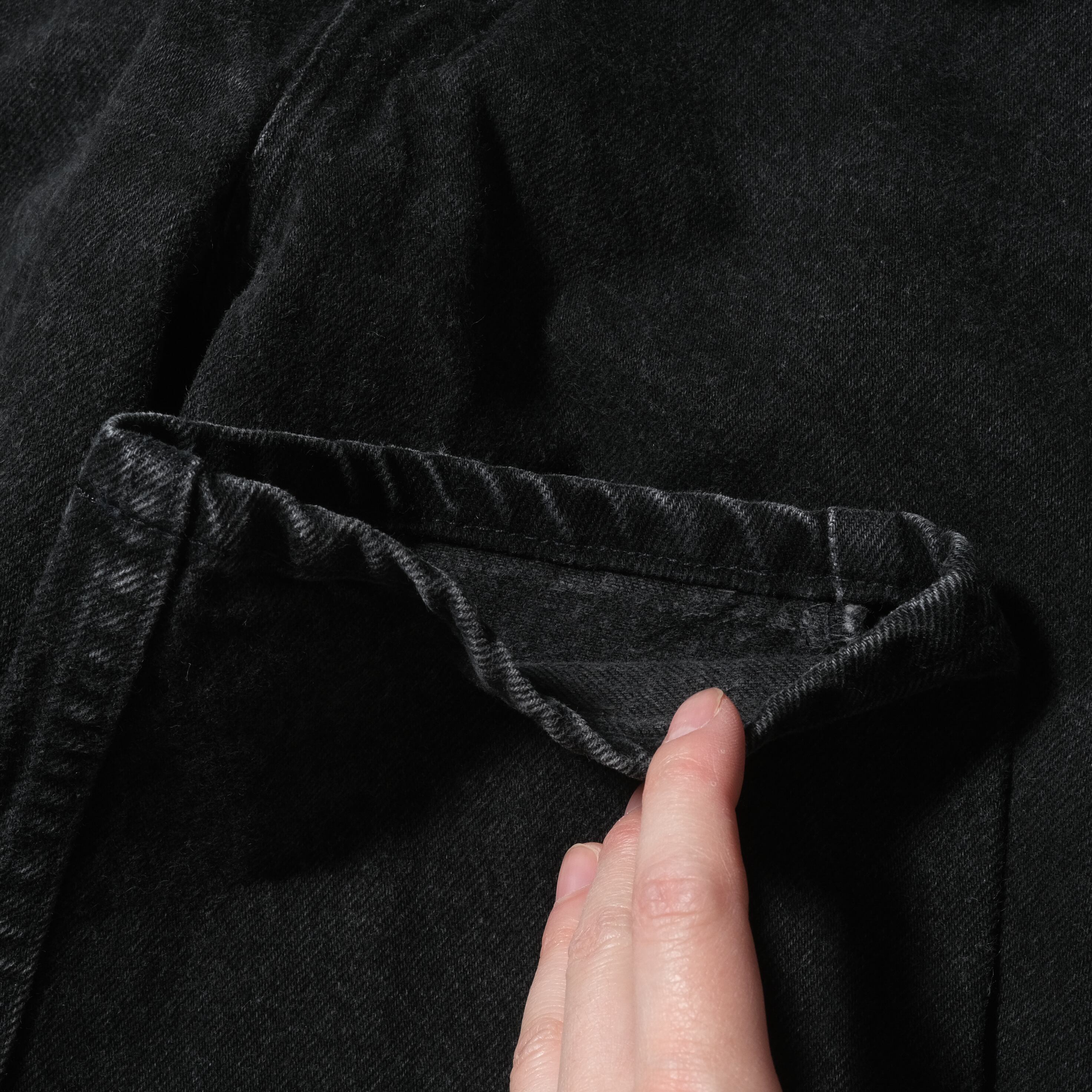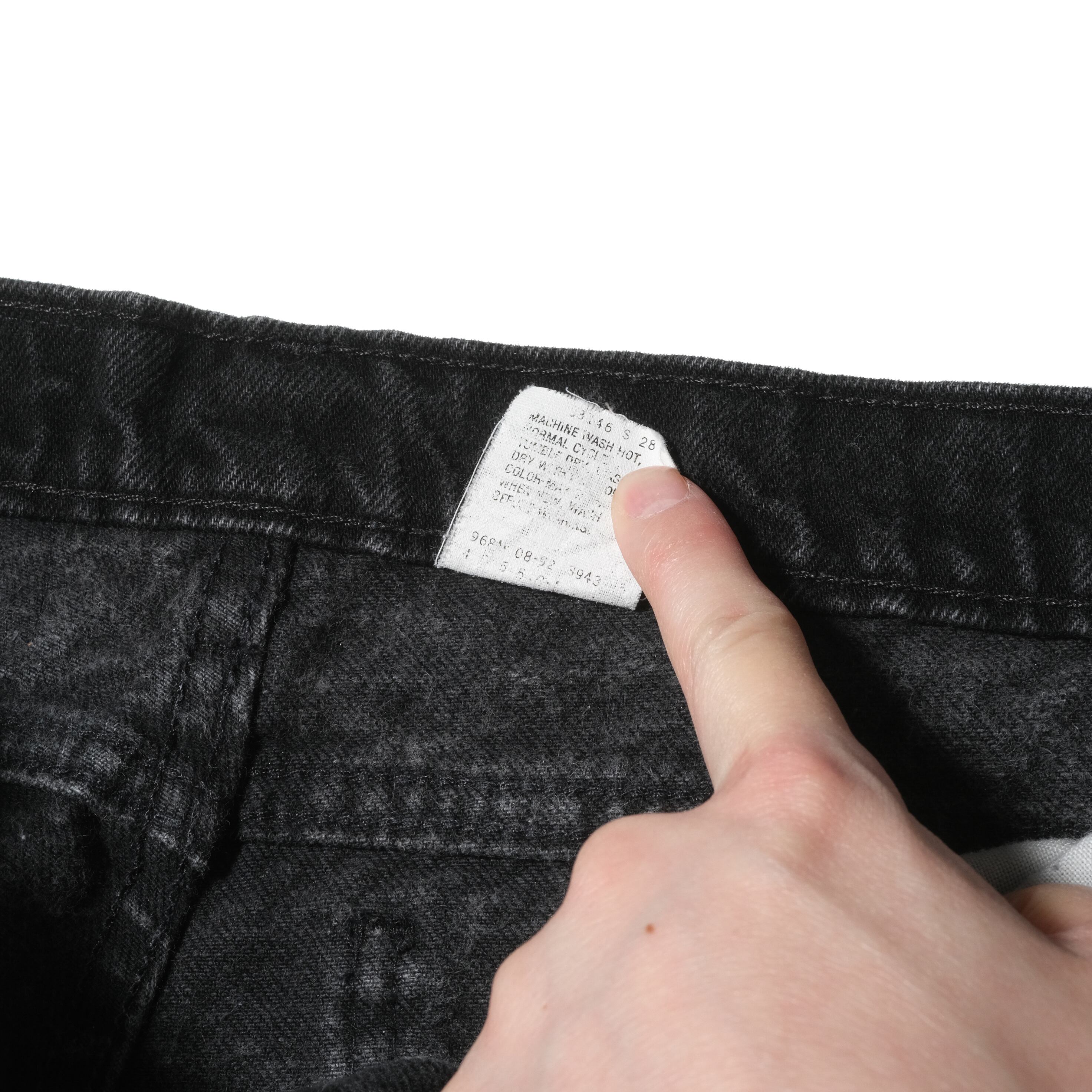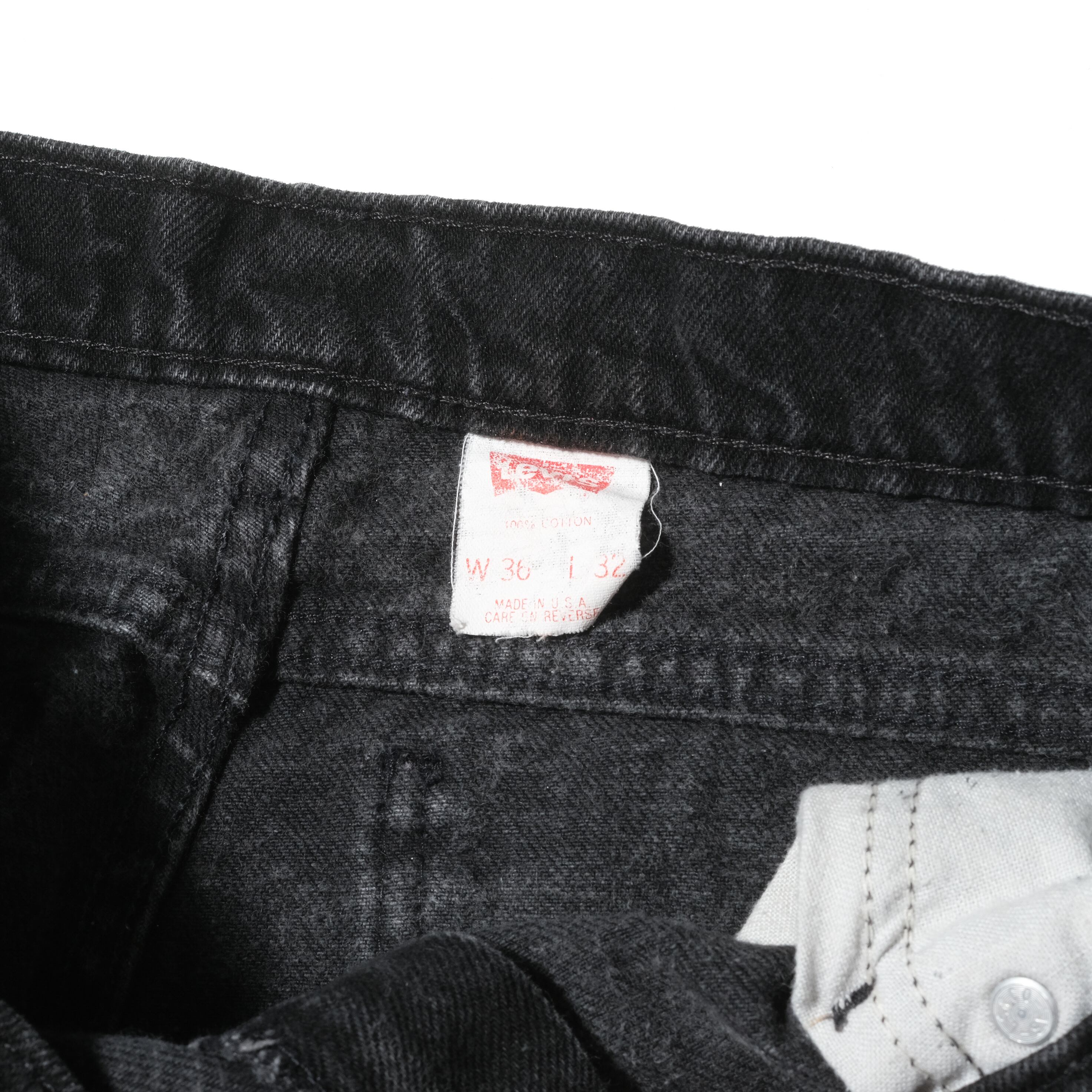 92年、USA製のもの。リーバイスの後染めブラックのデニム、とりわけ550としては初期にあたる、タブがブラックのもの。この年代のものは染めも濃く、生地もより立体的な質感をしており非常にクールです。