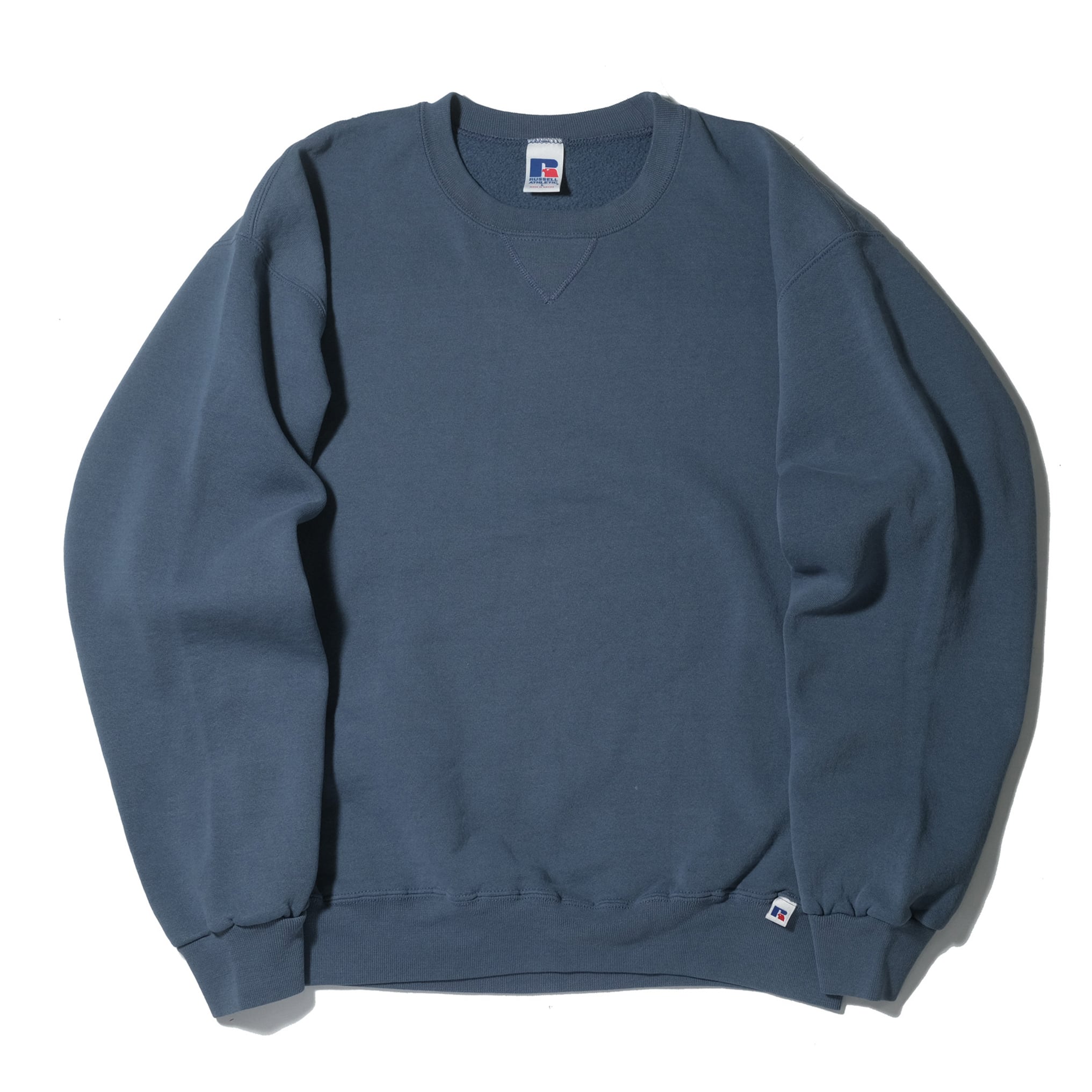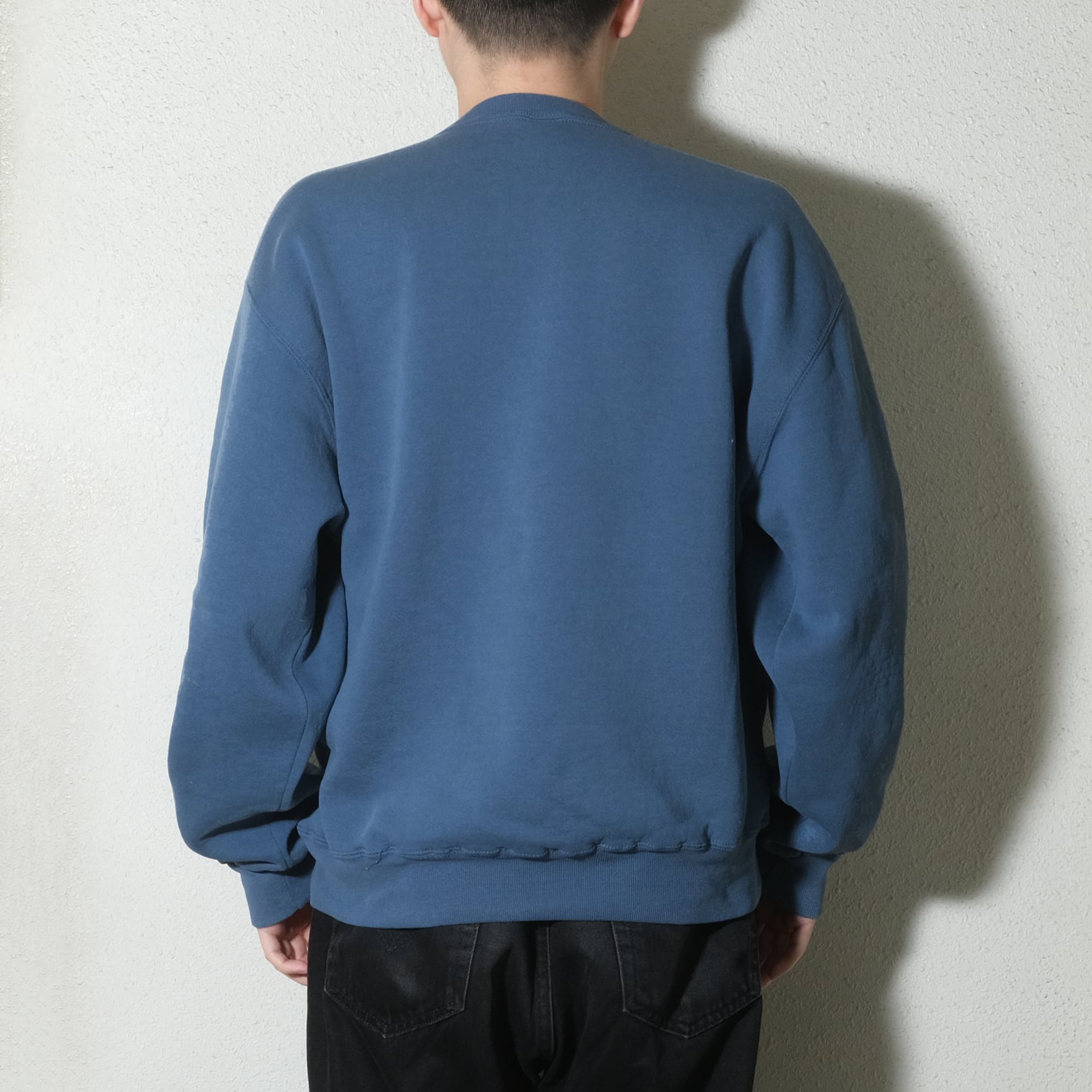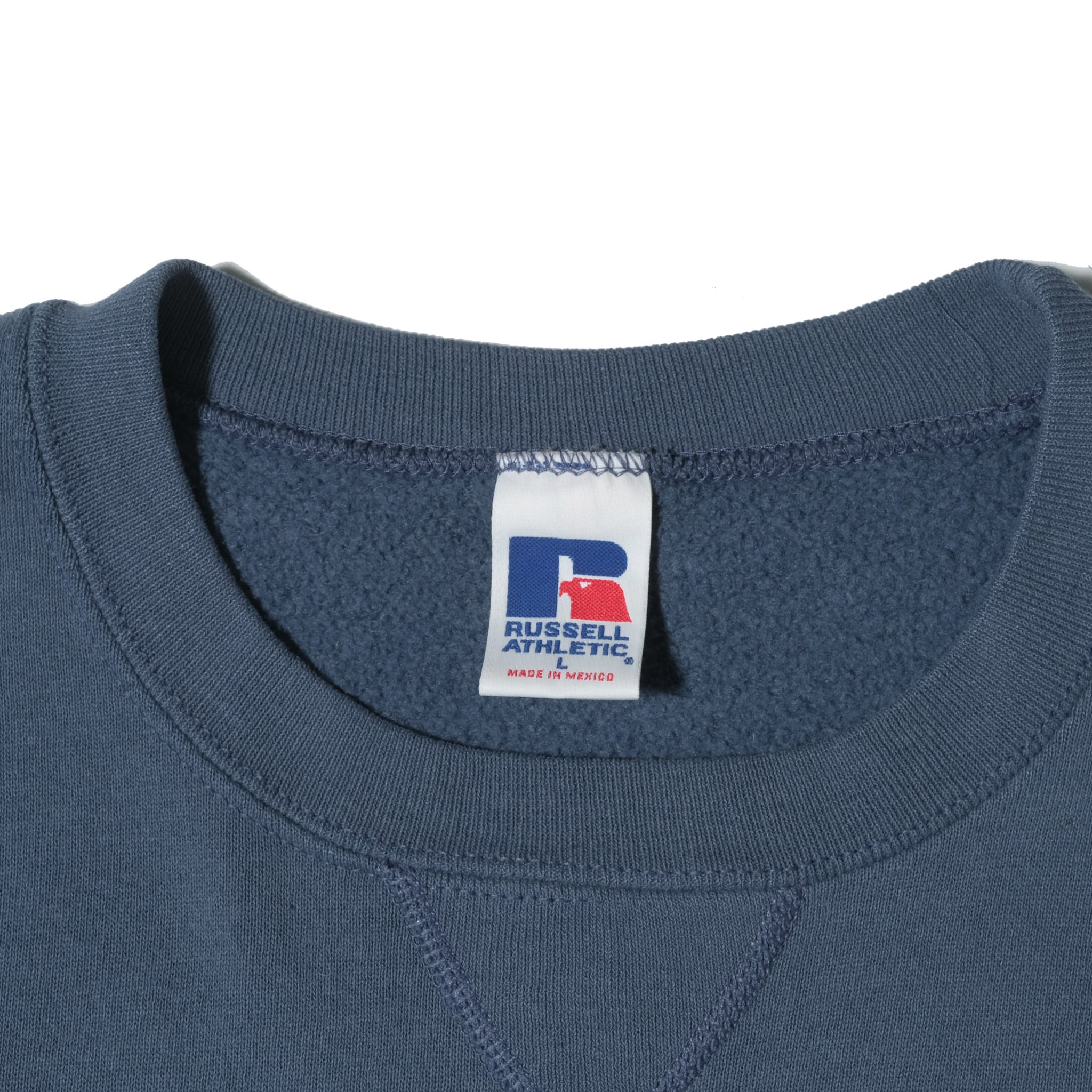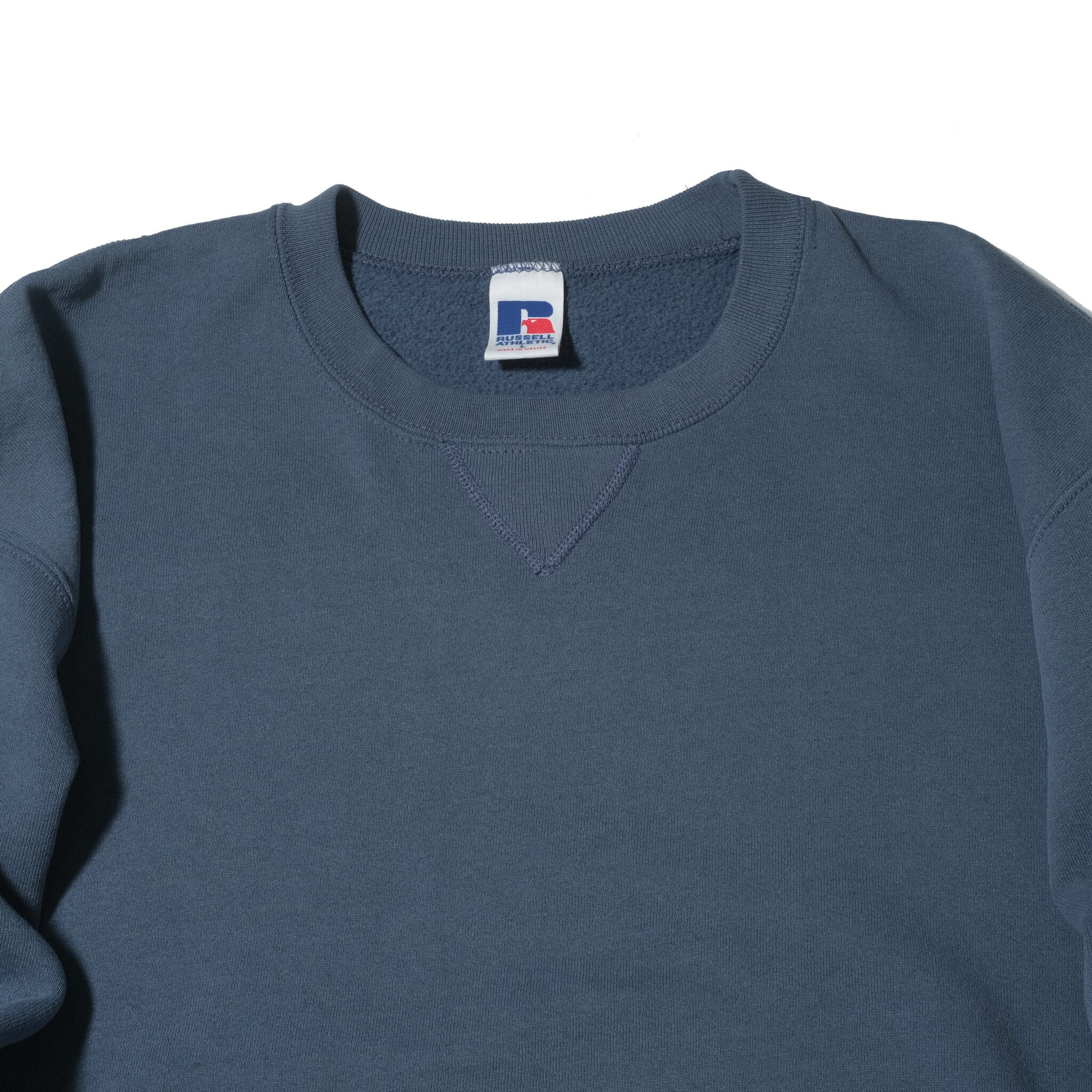 90's~のメキシコ製。インディゴのデニムなどに相性の良い、落ち着いたブルーグレーカラーのもの。ラッセルのUSA製のものでは前期型が身幅細め、後期型が身幅広めという特徴がありますが、メキシコ製のものは後期型と同じく丸っこいシルエットが特徴です。