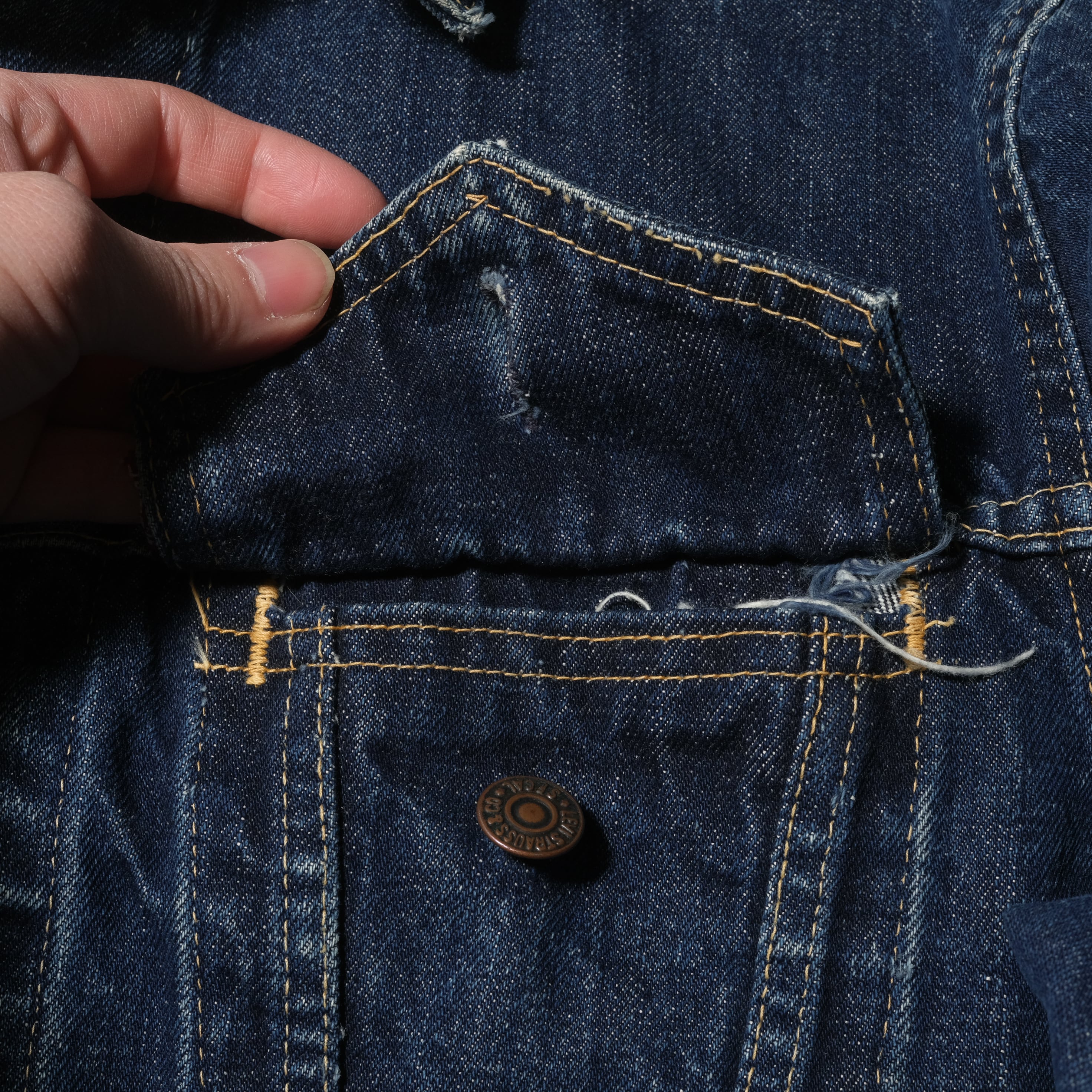 ボタン裏刻印はO、大きいパッチの形跡のある個体、フラップ裏は通常の生地ですので、557XXとは断定できませんがオールイエローのステッチで最高です。