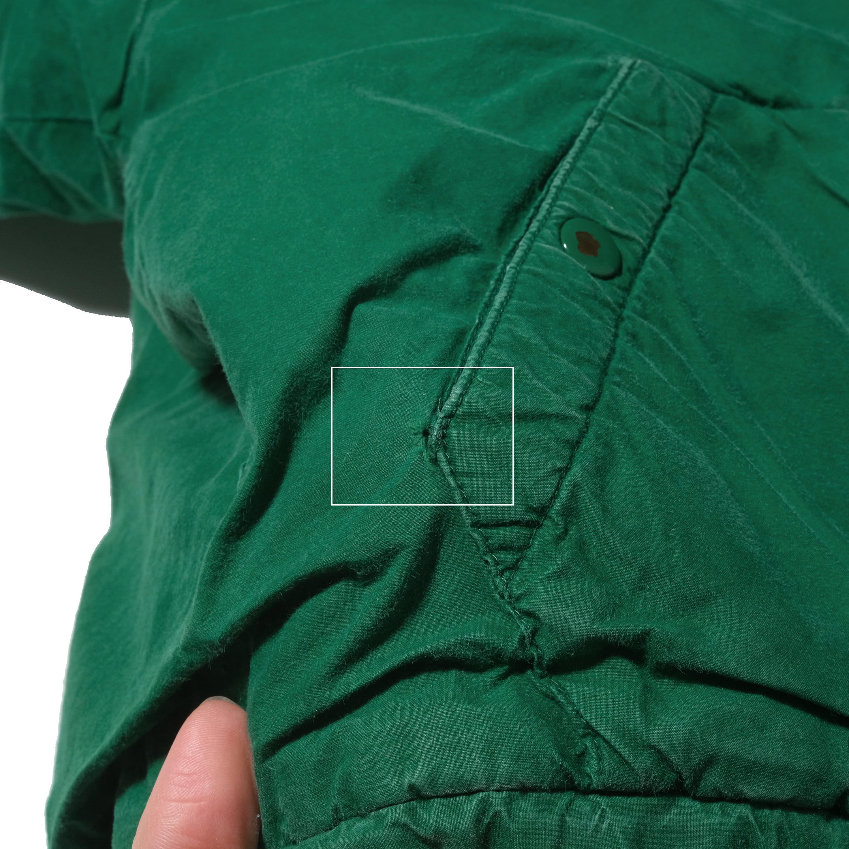 【状態】全体的に着用感、アタリ、スレ、フェード。フロント左のポケットに手縫いによるリペア。袖口、裾、ポケットの付け根など経年による劣化。着用に支障のある目立つダメージなどは見られません。フード欠損。