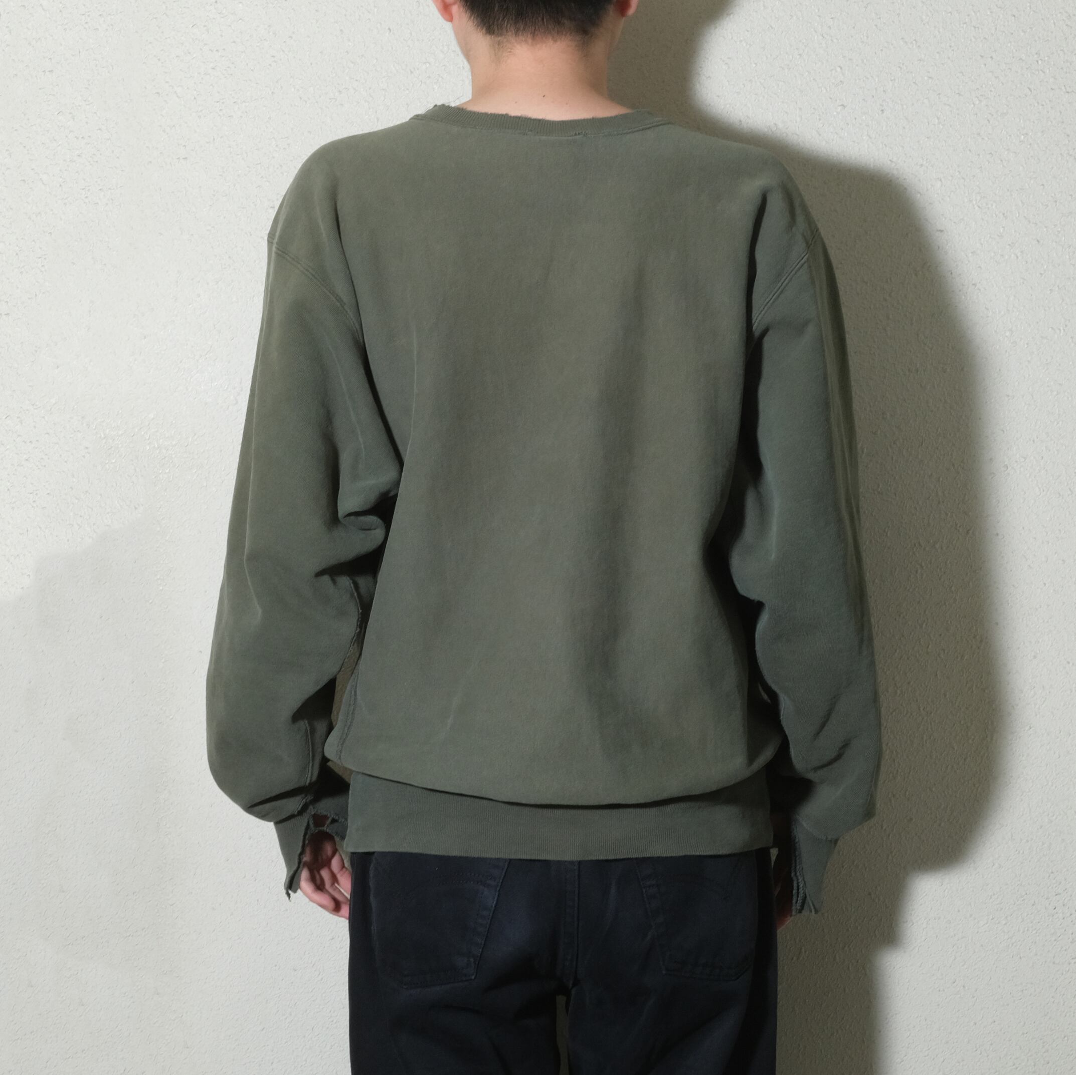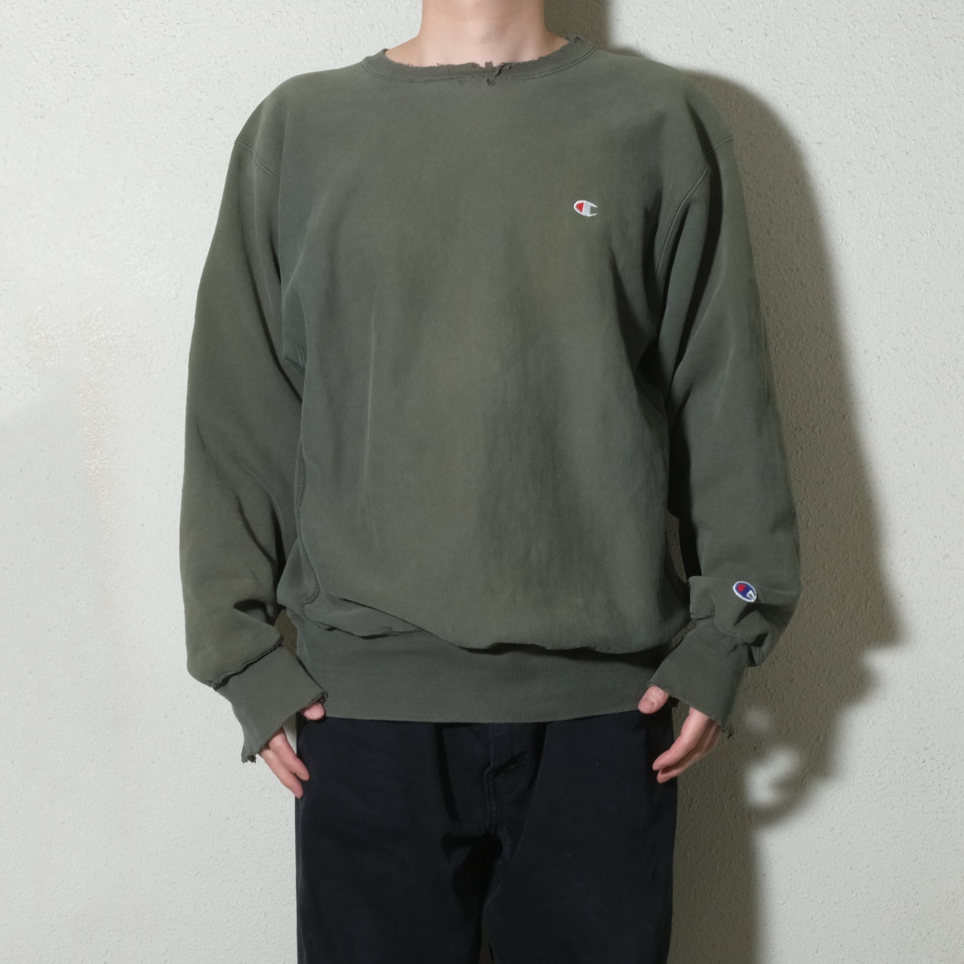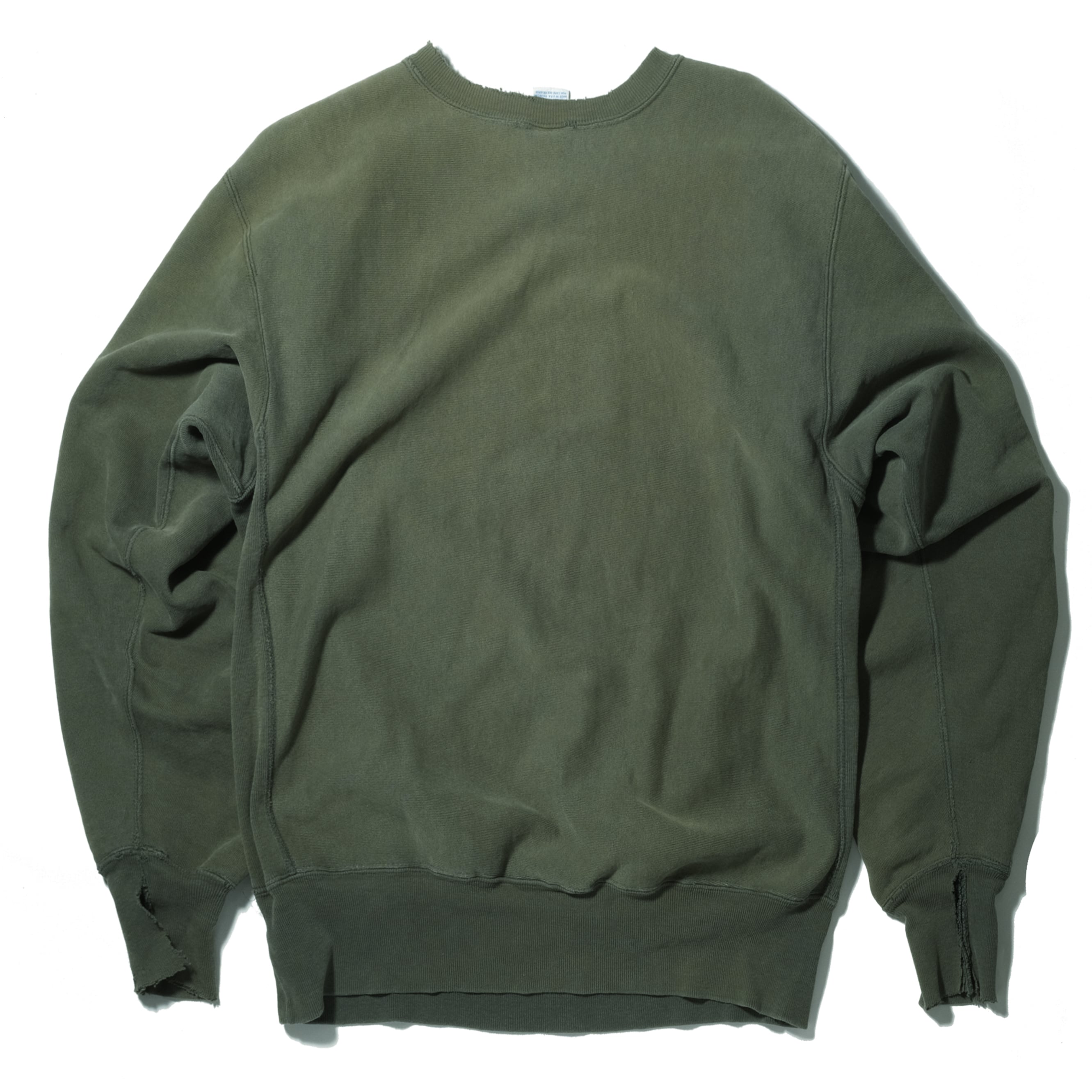 90'sのUSA製、グリーンカラーのもの。かなり着こまれておりリブにもダメージ、そしてかなりフェードして黄色っぽいカラーになっております。