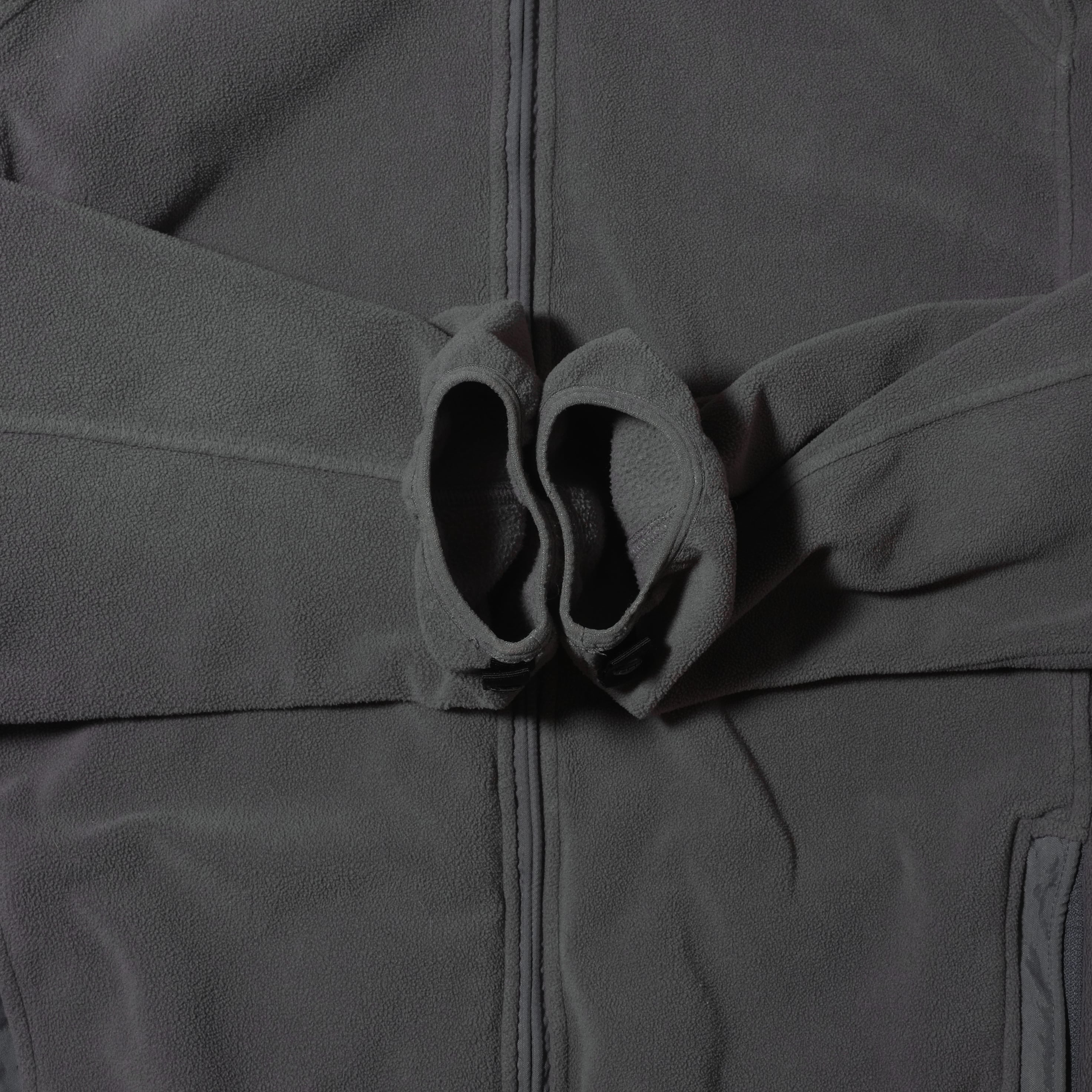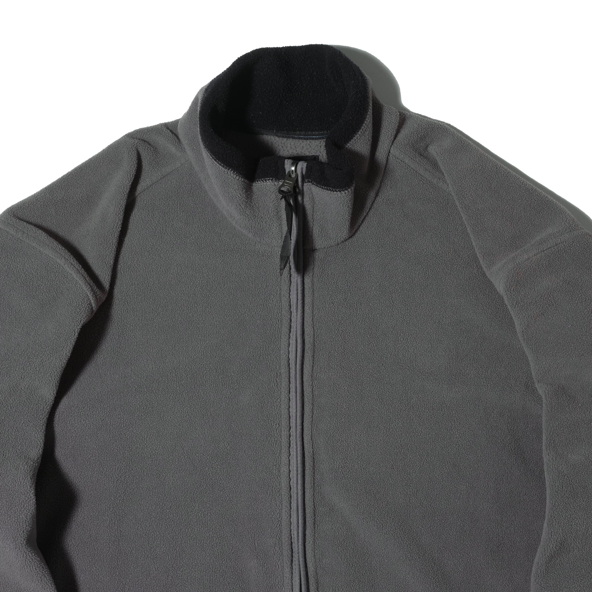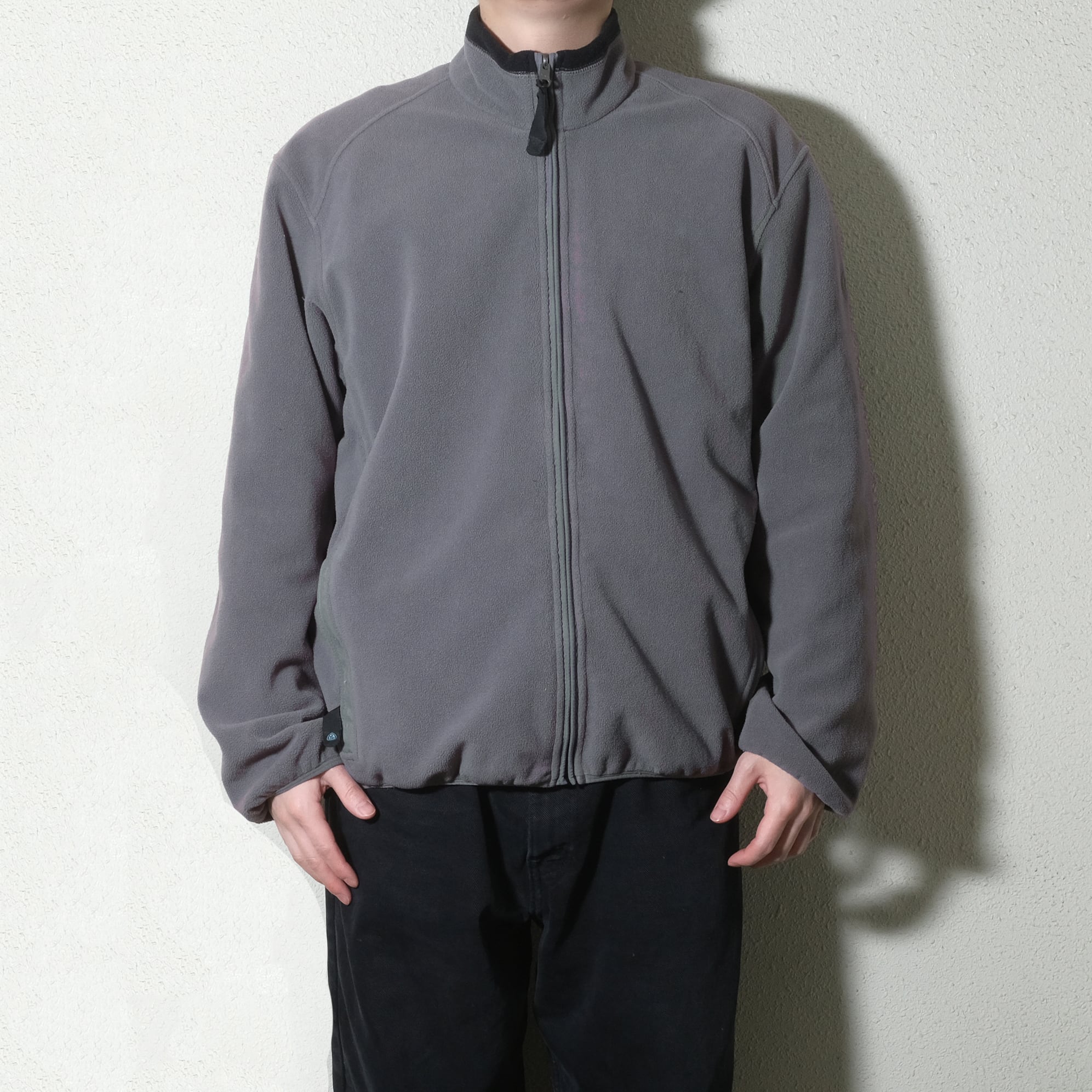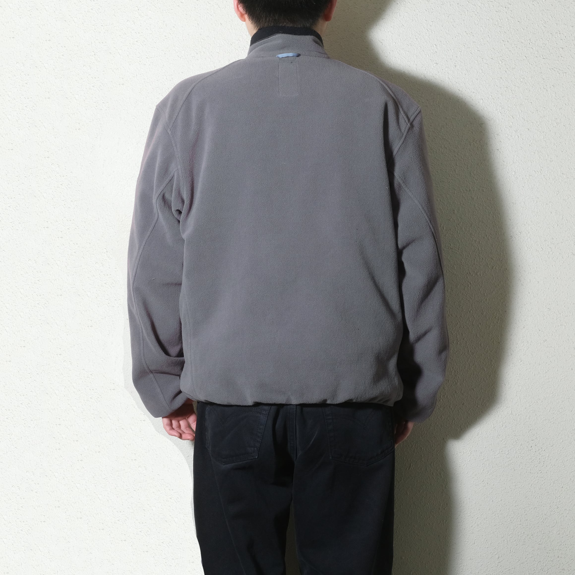腰の絞りがしっかり効いたシルエット、グレーでしっかりしたフリースで使いやすいかと思います。街着としてはアウターとしても、もちろんインナーにも使える良いフリースです。