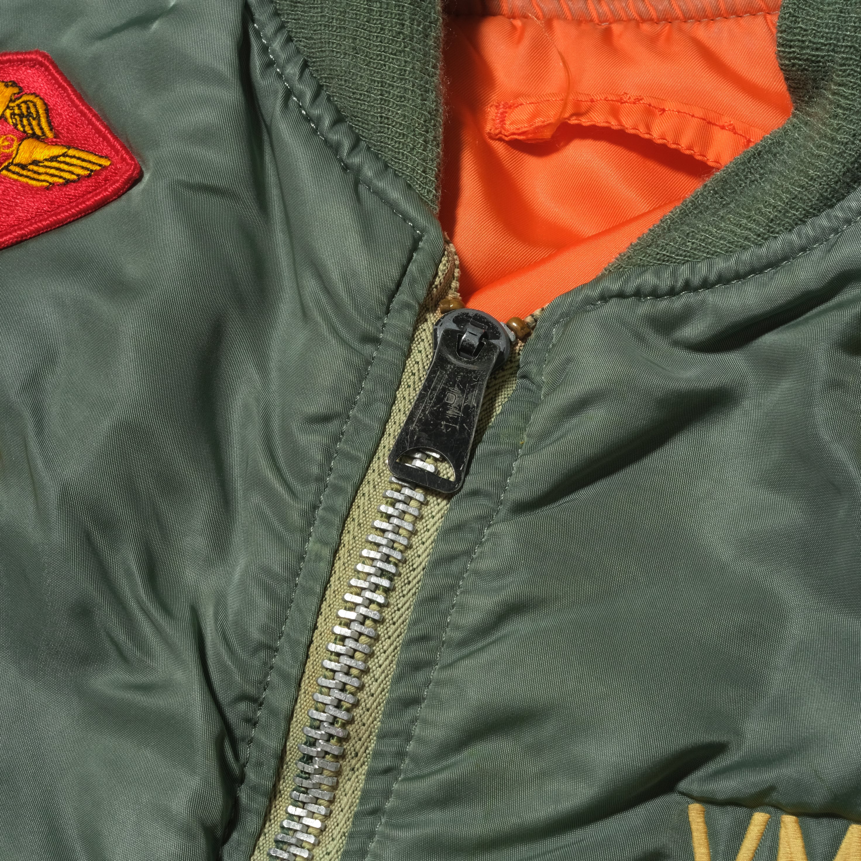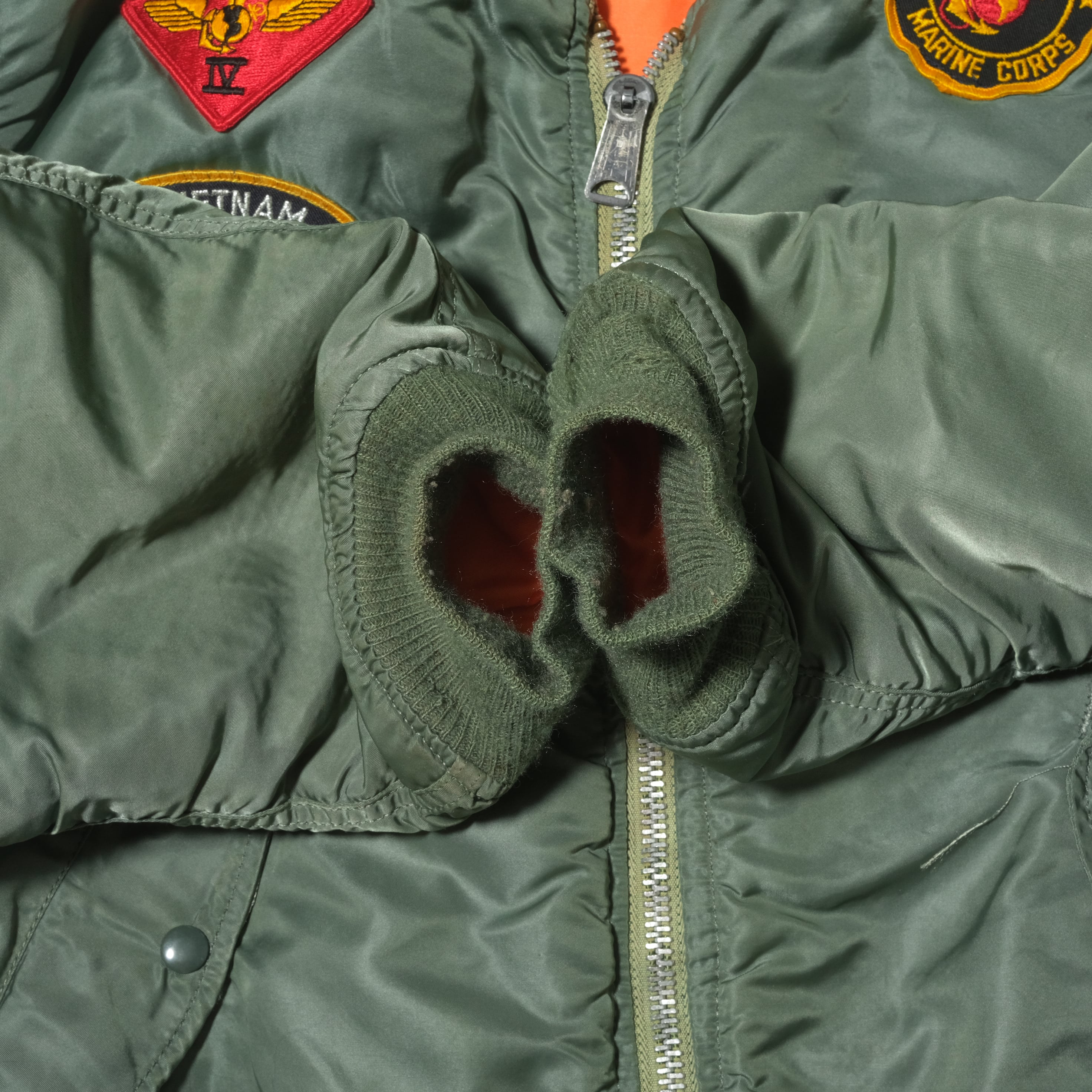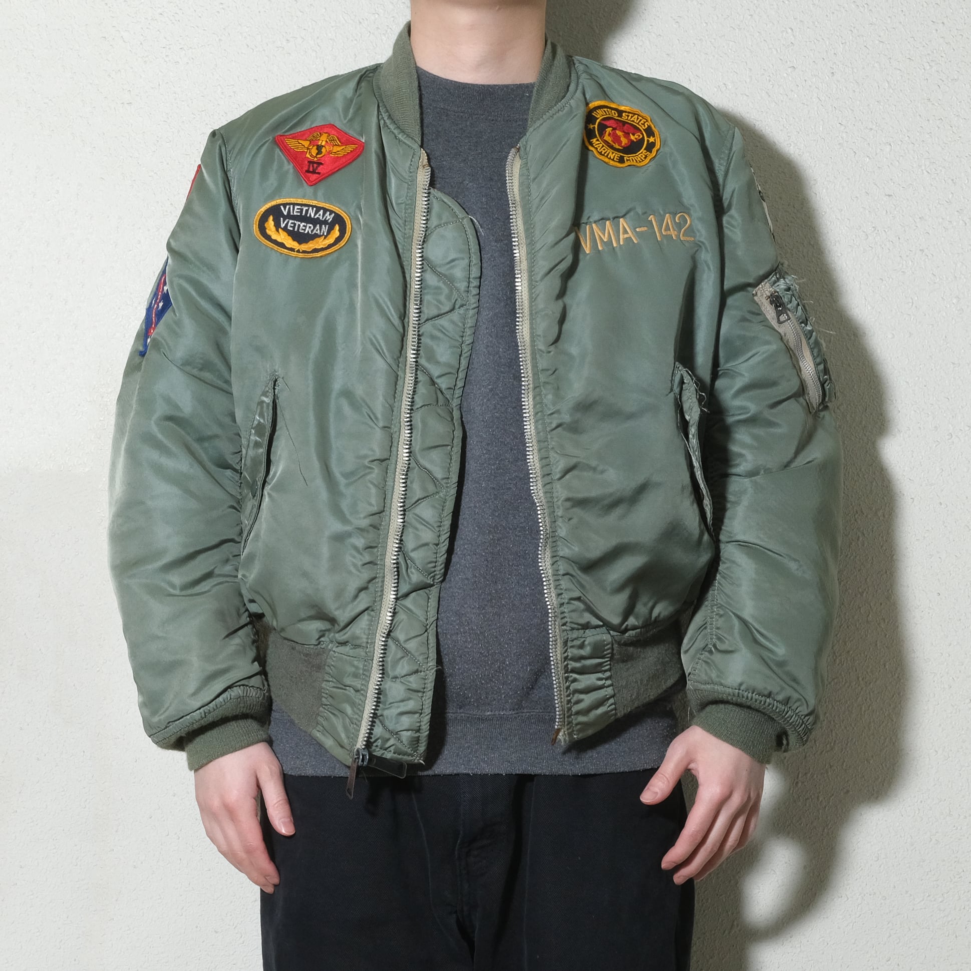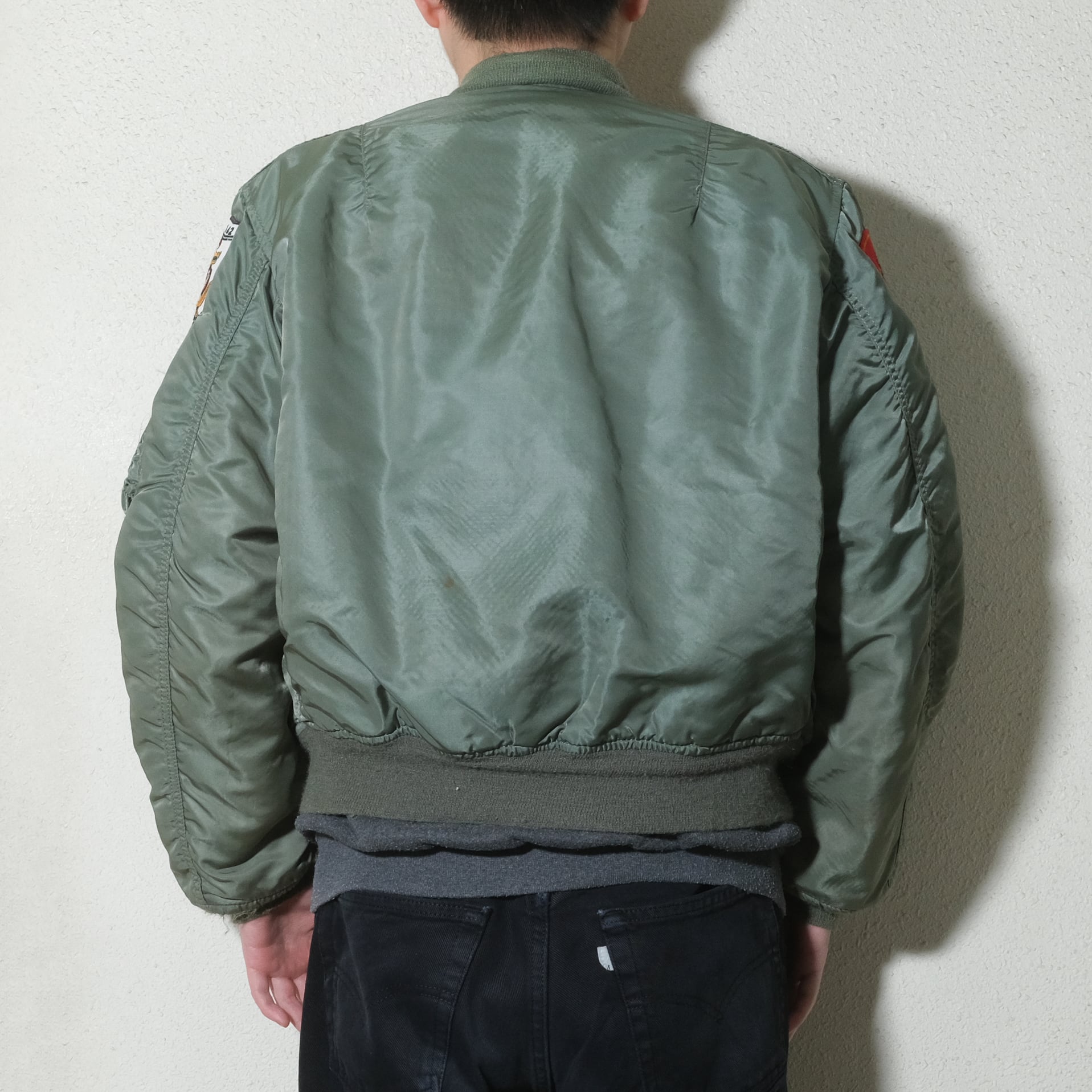 タグ欠損しておりますがIDEALジップなどのディテールから80'sのALPHAボディになるかと思います。それに退役軍人のものなどのパッチ、刺繍がカスタムされた一着。