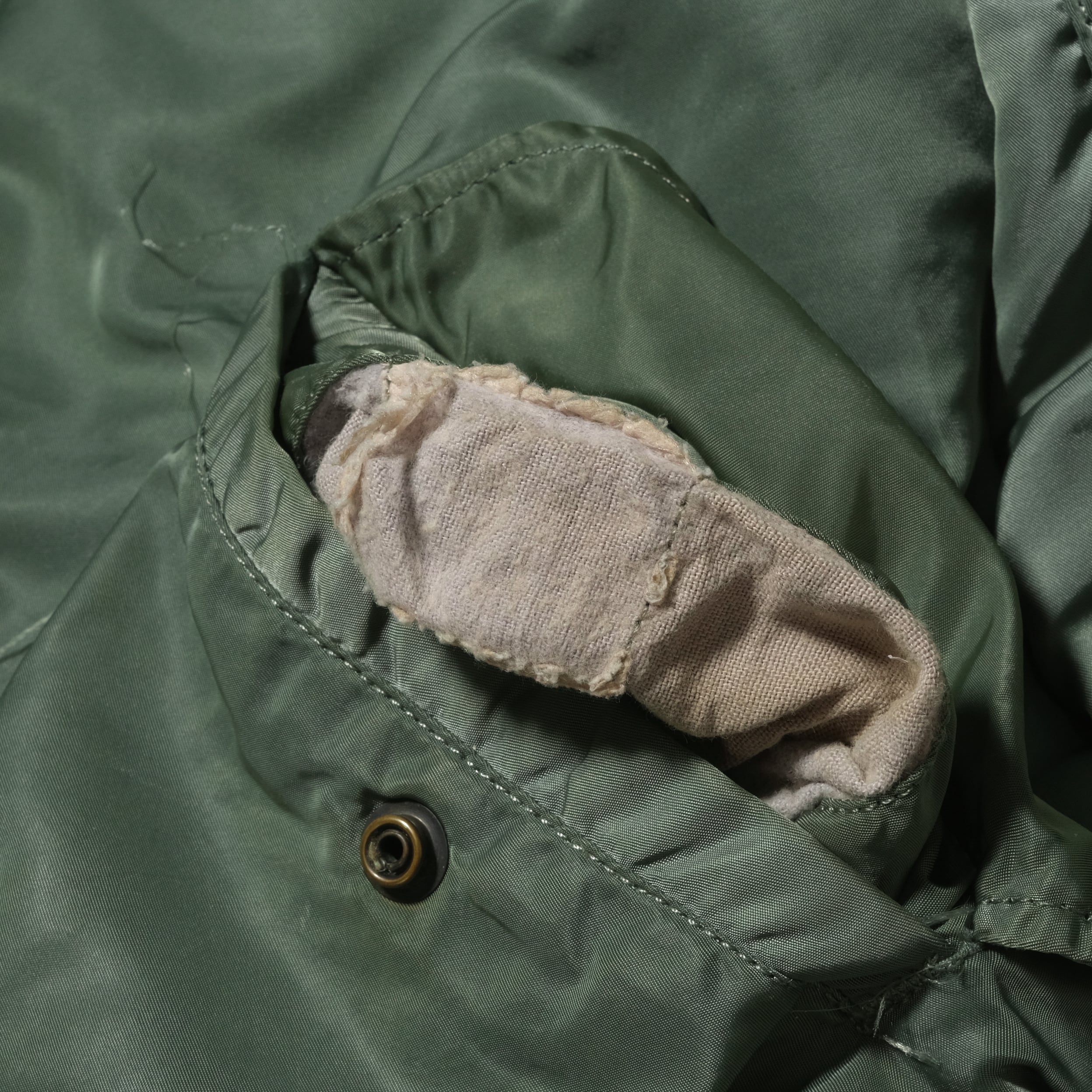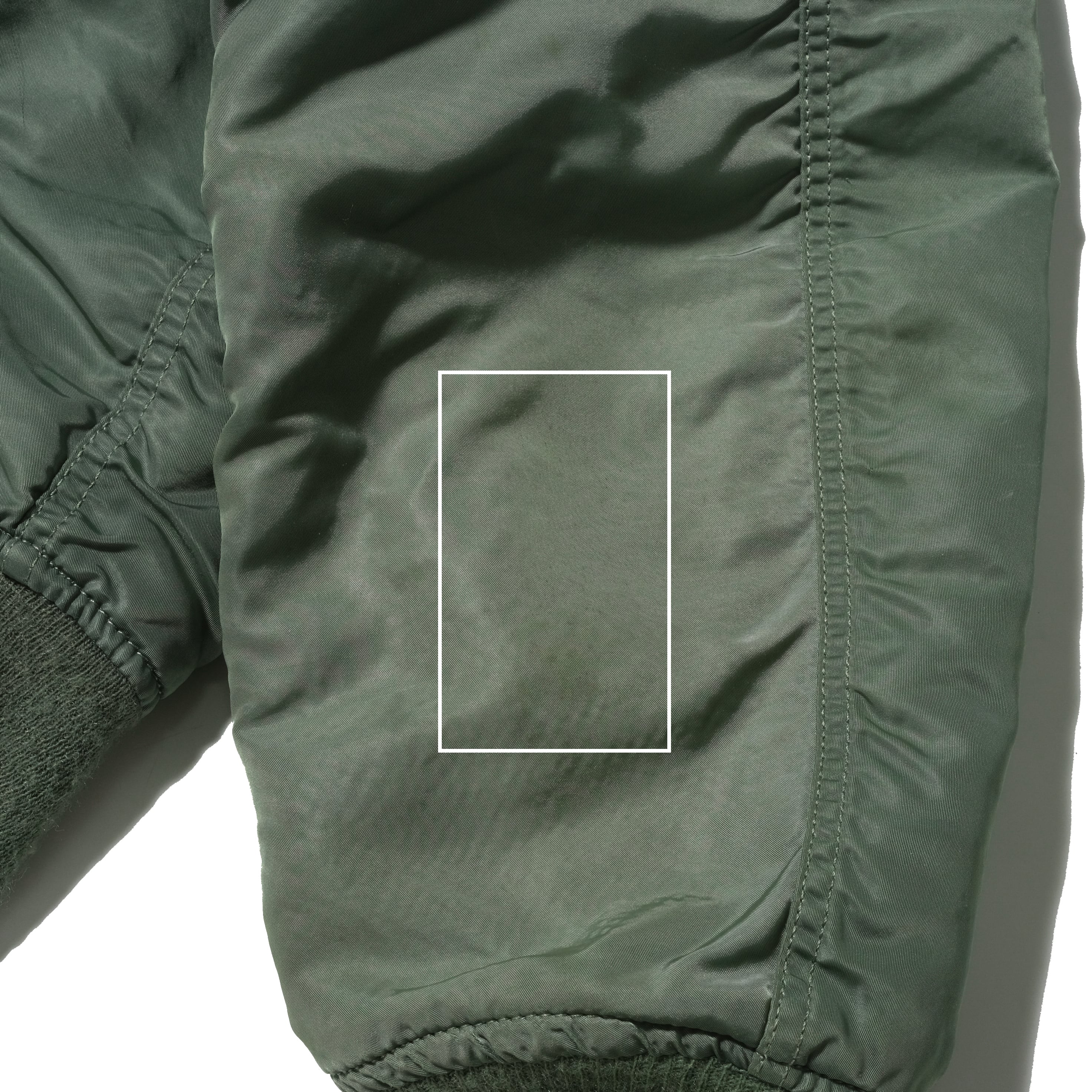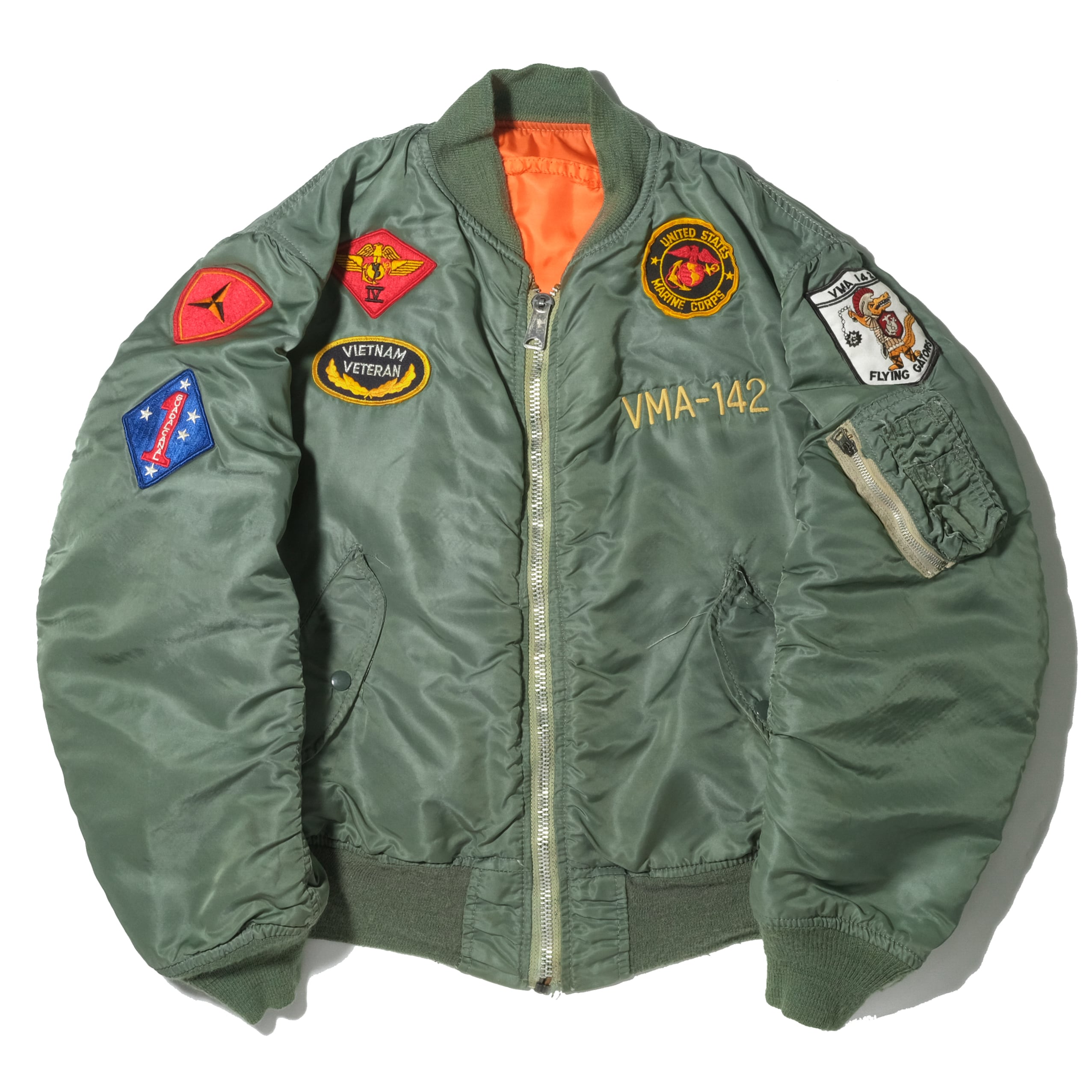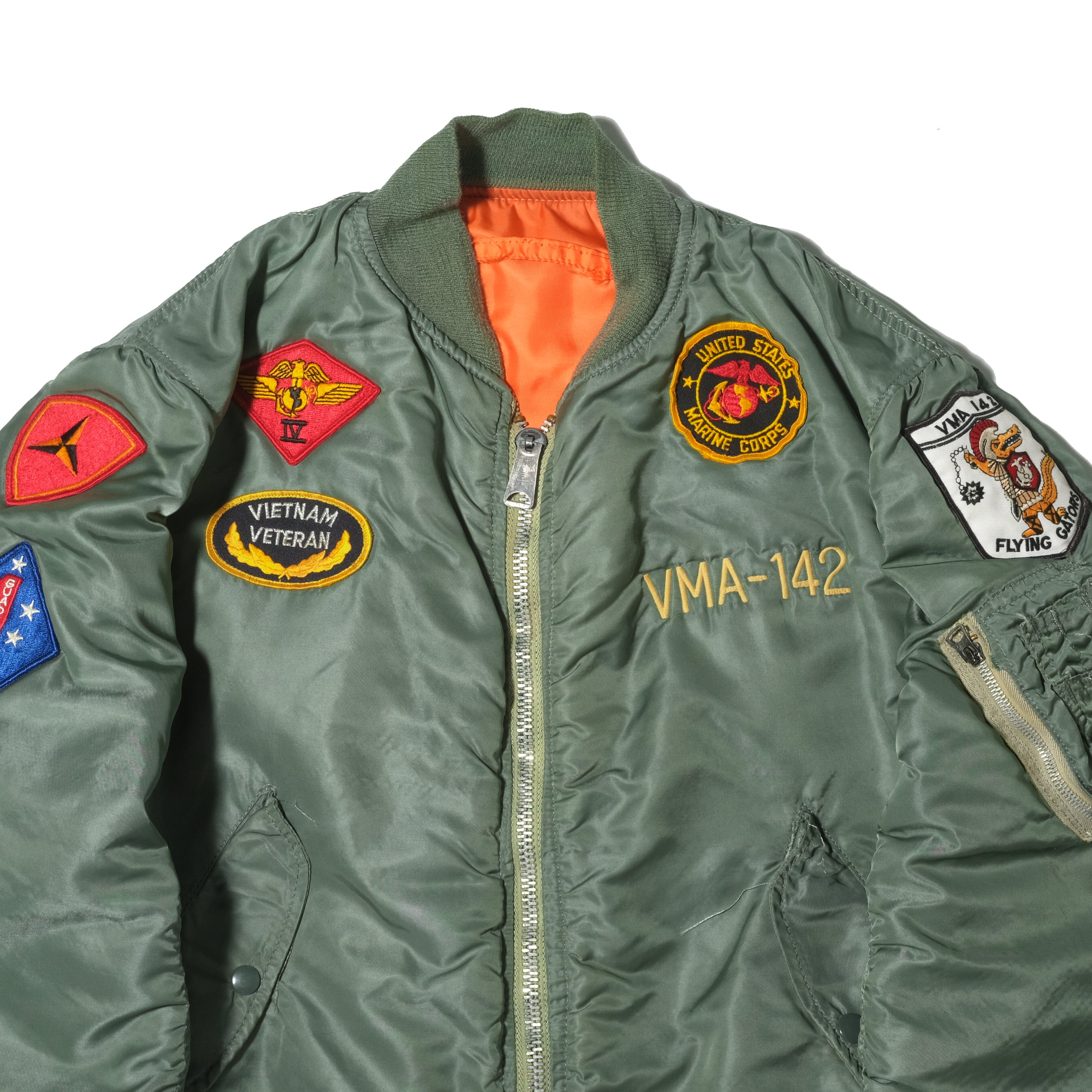 タグ欠損しておりますがIDEALジップなどのディテールから80'sのALPHAボディになるかと思います。それに退役軍人のものなどのパッチ、刺繍がカスタムされた一着。