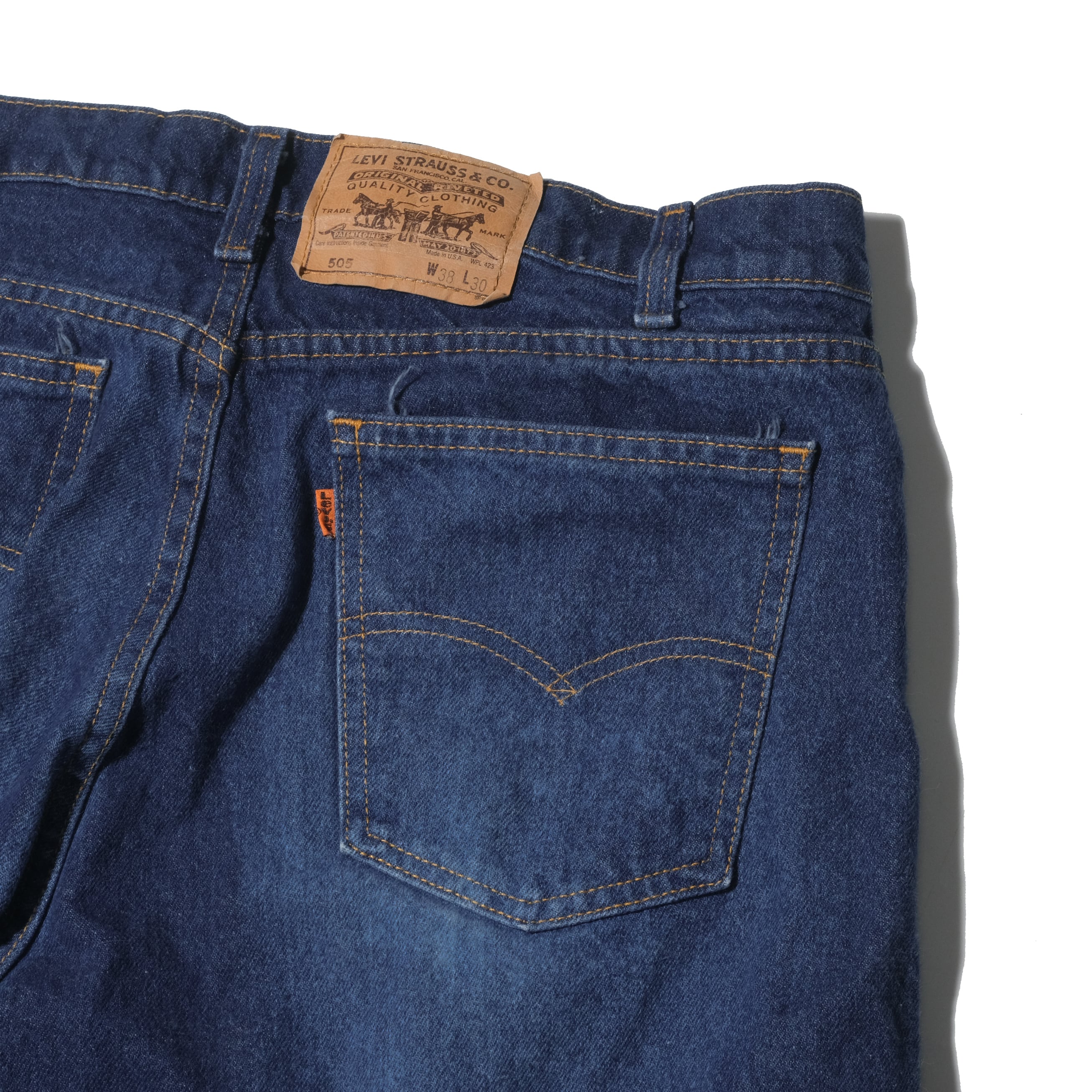 38x30の表記サイズはシュリンクして実寸が36x29.5。この年代の505はやや細めですのでこのくらいウエストをあげて着用するのがかっこいいと思います。