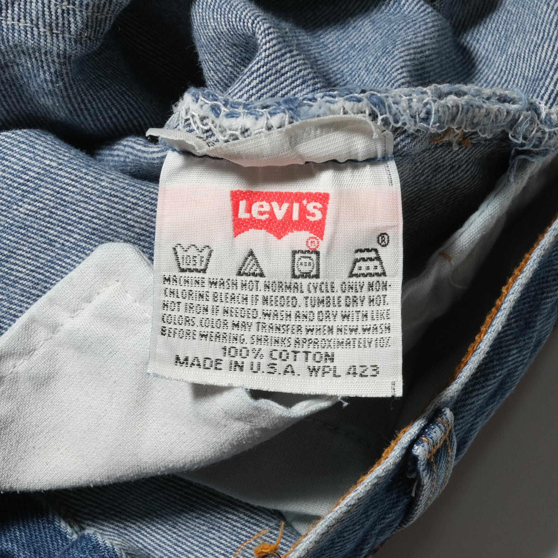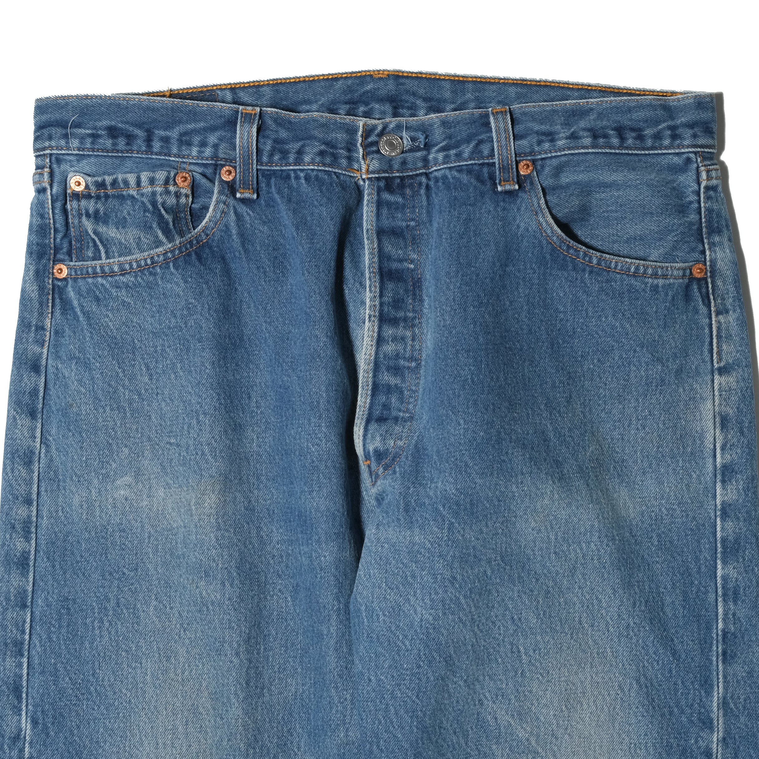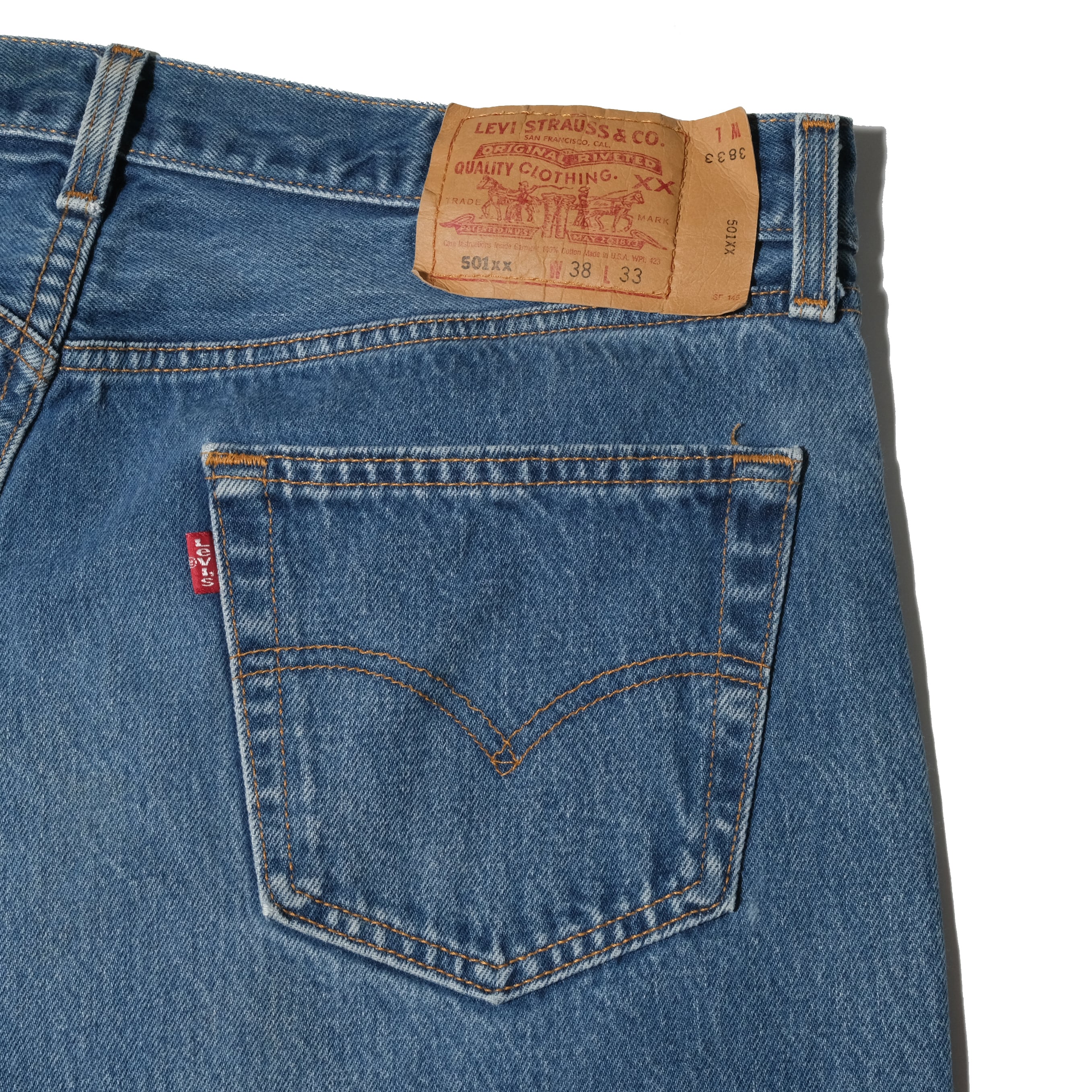 99年、USA製の個体。表記サイズは38x33。501-0000品番ですのでリジッドの状態で販売されていたもの。このタイプはかなりしっかりとシュリンクしますので実寸は36x30.5となっております。