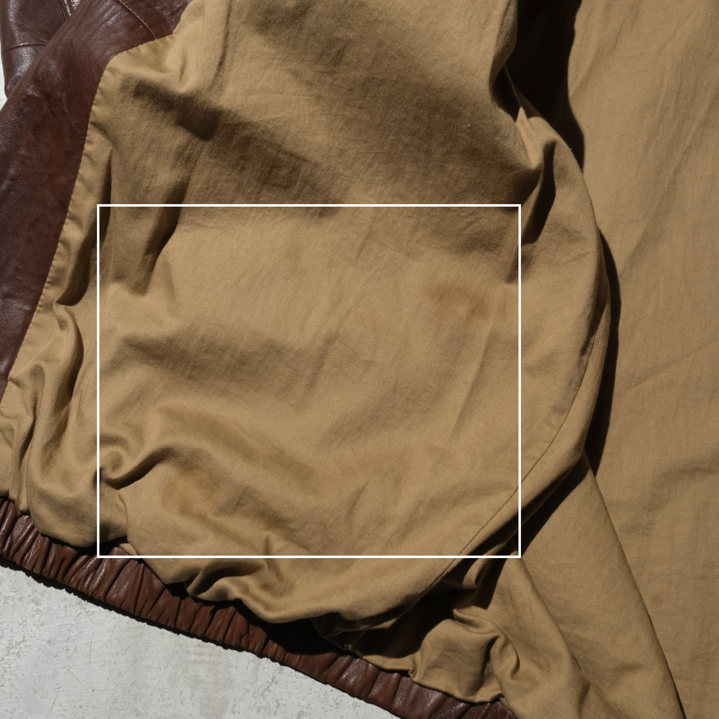 【状態】全体的に着用感、スレ。汚れ。ところどころレザーの若干のはげ、スレなど見られます。袖部、ライニングにダメージ。ライニングに薄汚れ。その他目立つダメージやヨゴレなど見当たりません。