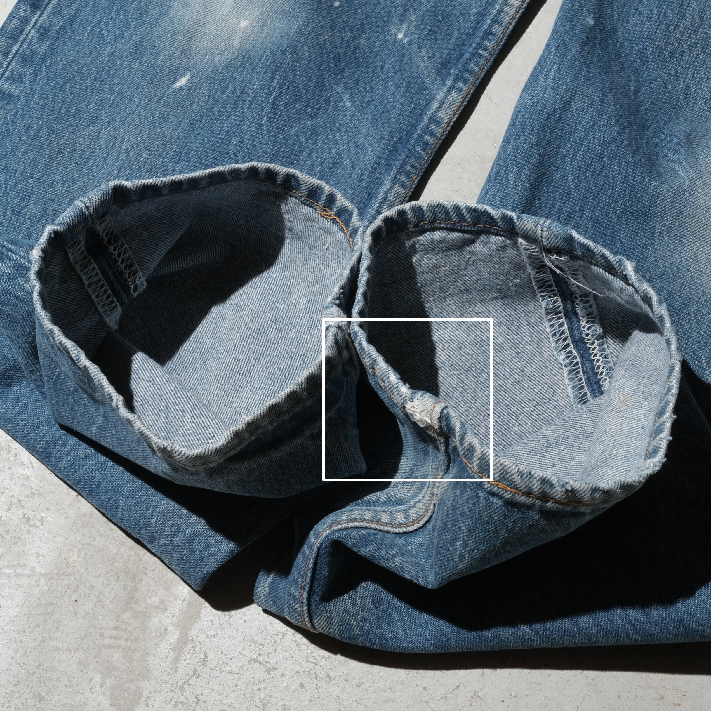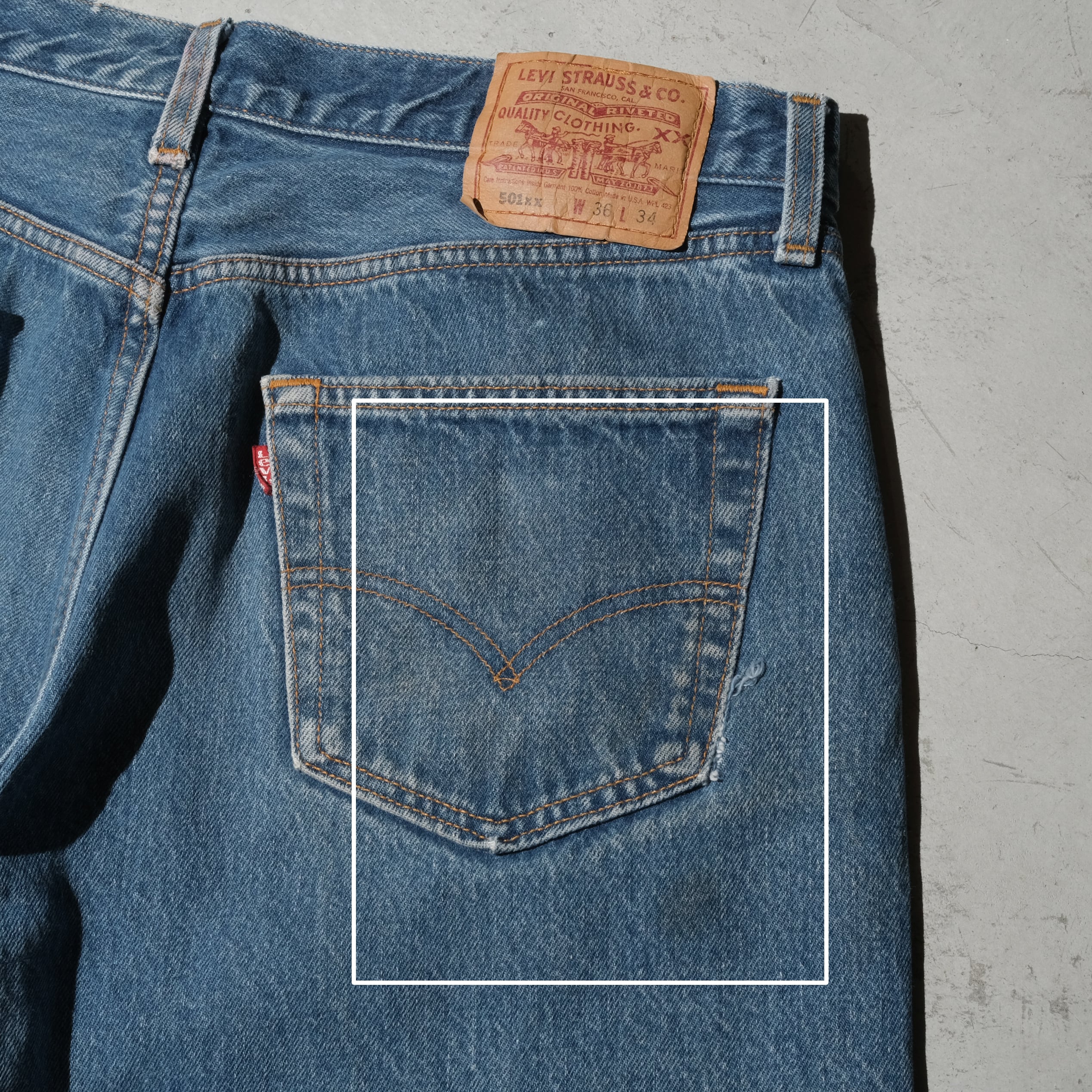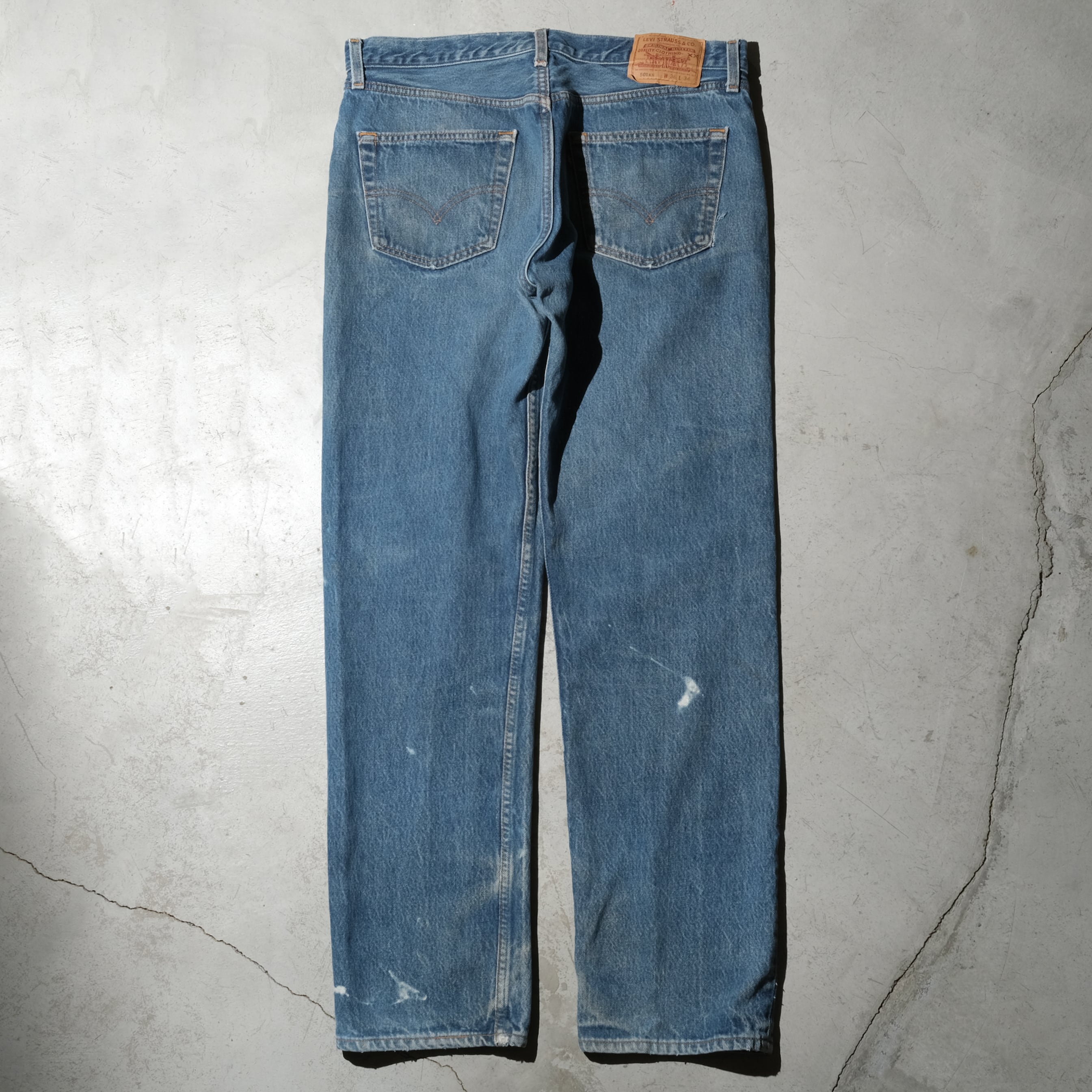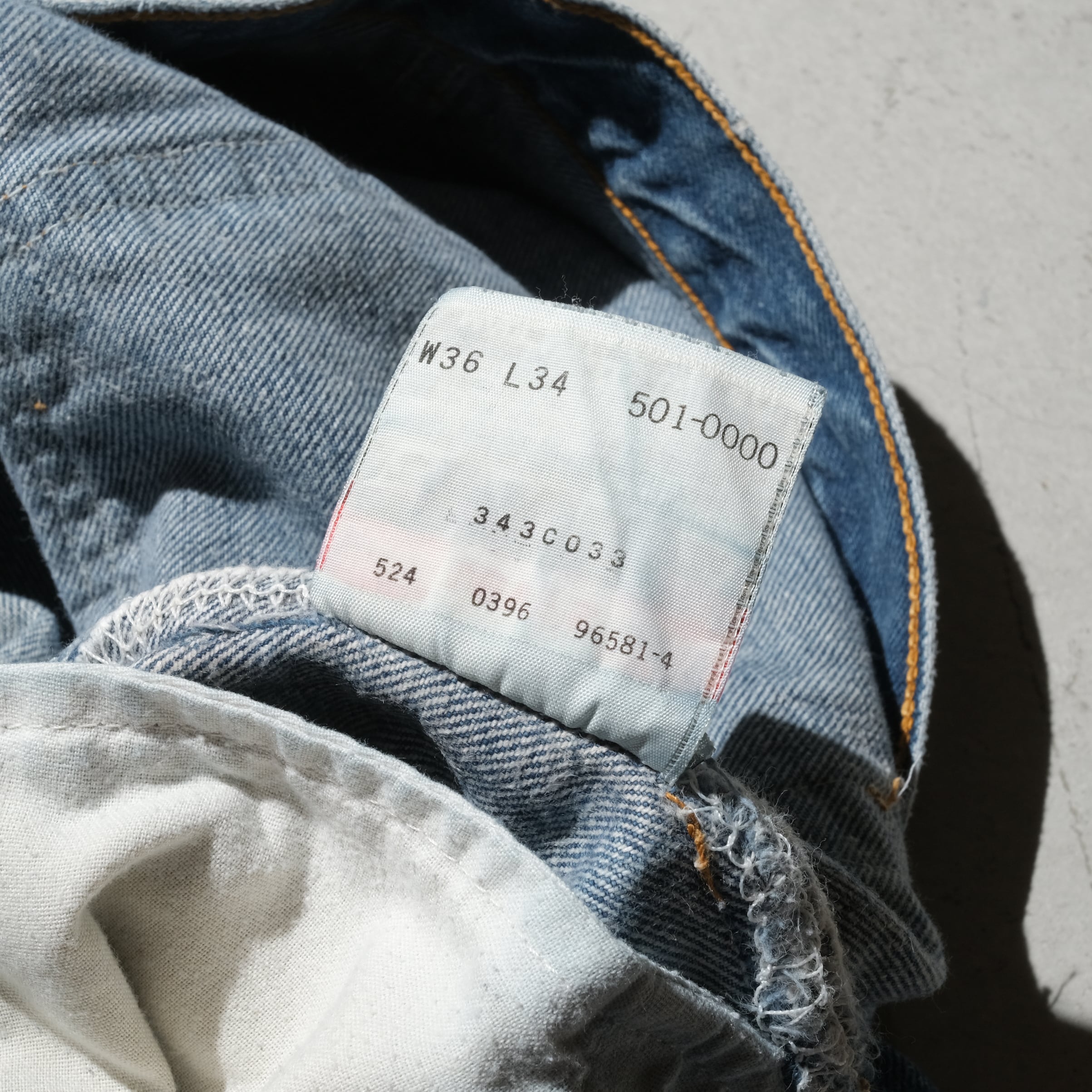96年、USA製の個体。36x34の表記サイズですが501-0000のリジッドで売られていた個体ですのでしっかりとシュリンクが入って実寸は35.5×31.5相当のいいバランスに仕上がっております。