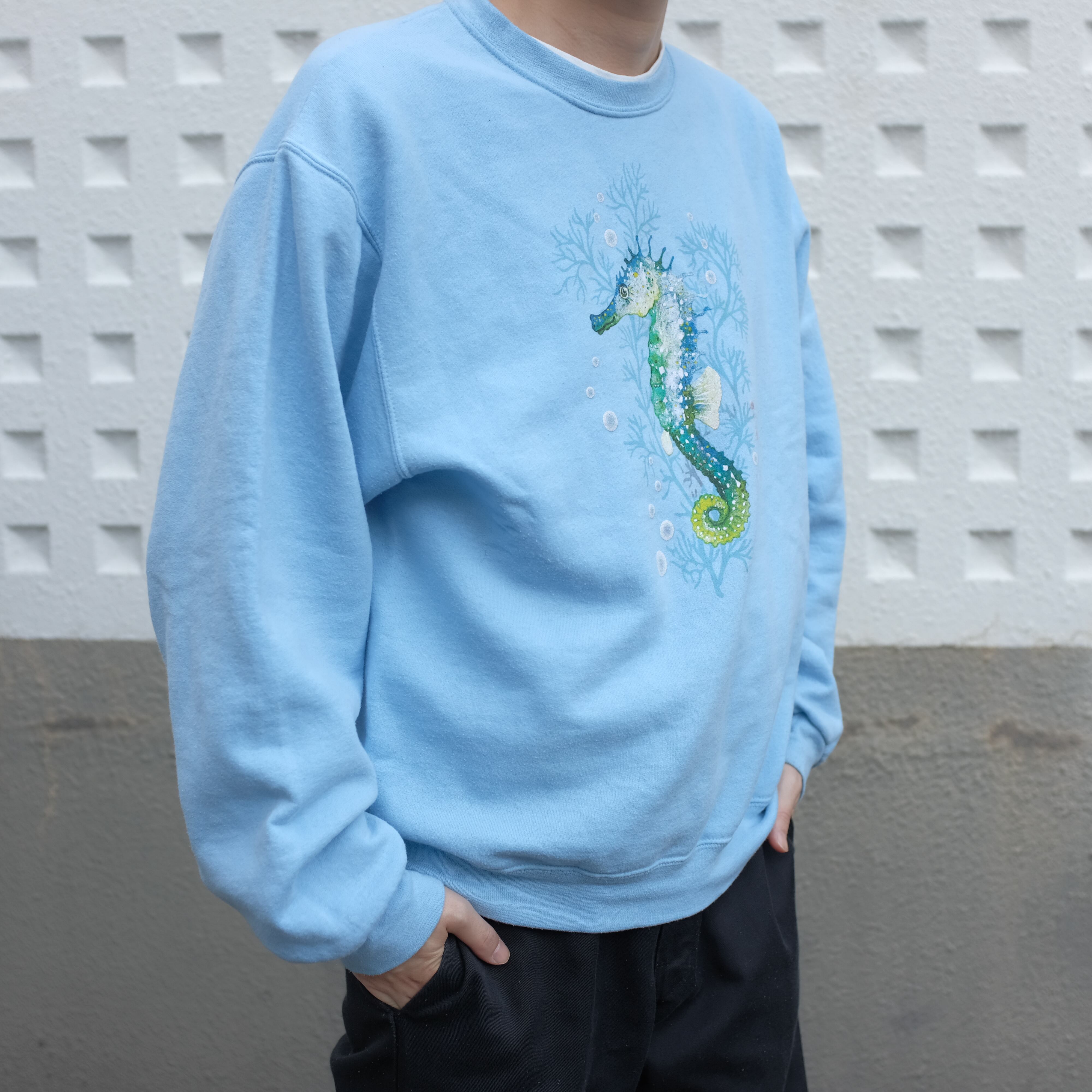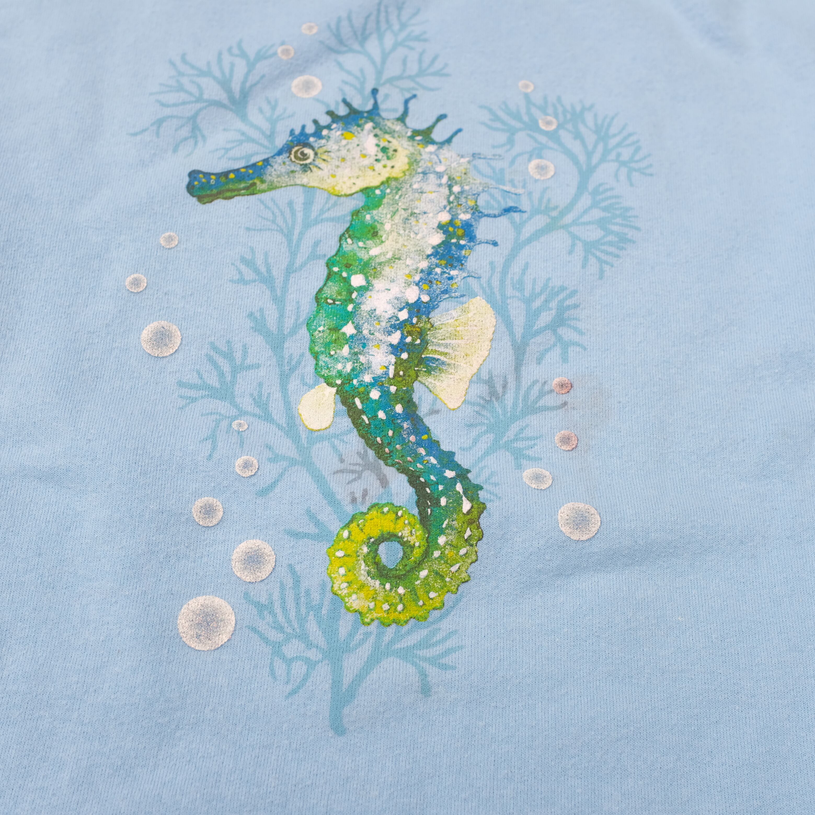 タツノオトシゴのプリントに、サックスブルーのボディが可愛らしい一枚。
