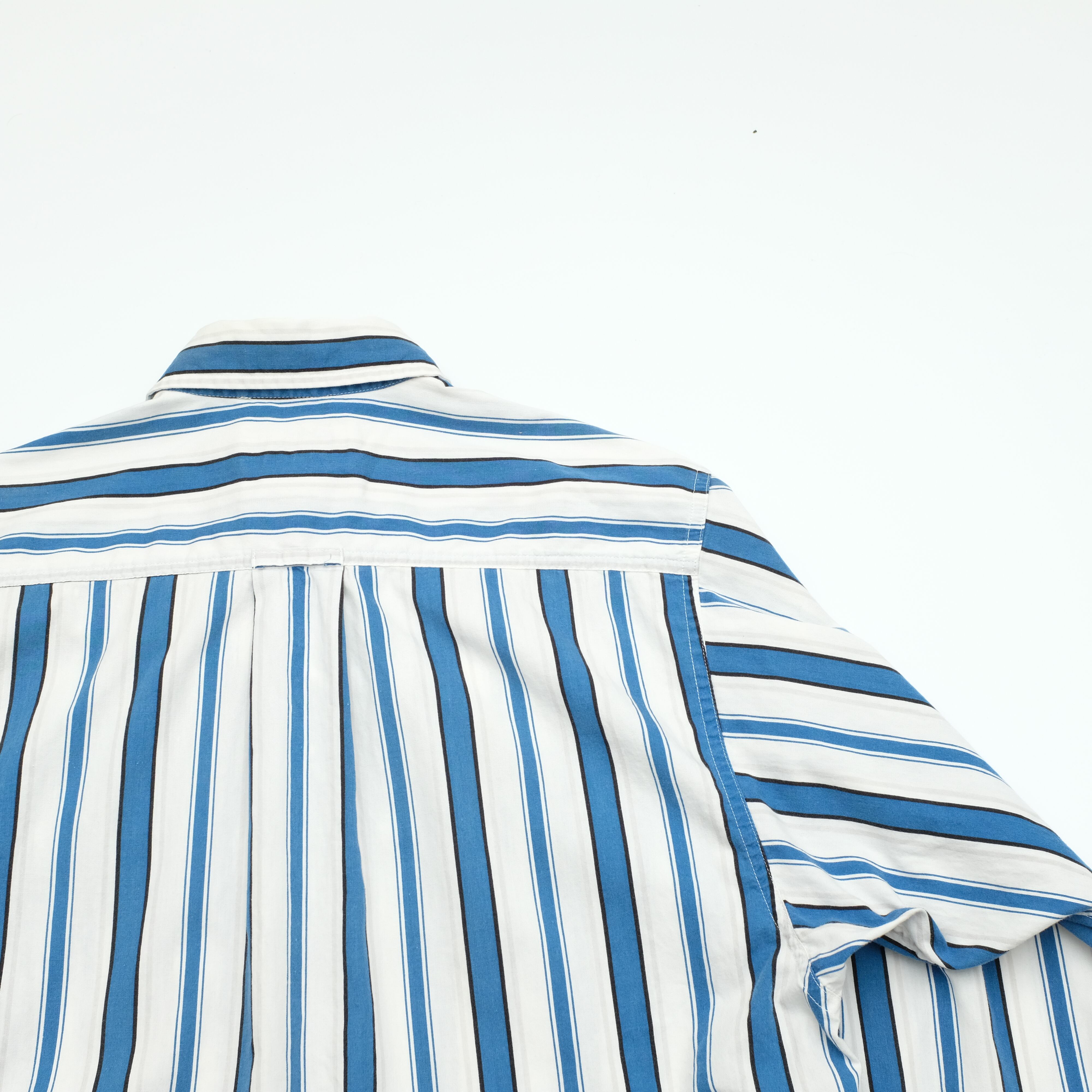 シンプルなデザインが特徴の同ブランド。こちらのシャツもスタンダードながらも気の利いたピッチのストライプが印象的です。また、腕部の幅が広く取られており、小さめのサイズながらもややゆとりのあるシルエットに見える印象です。