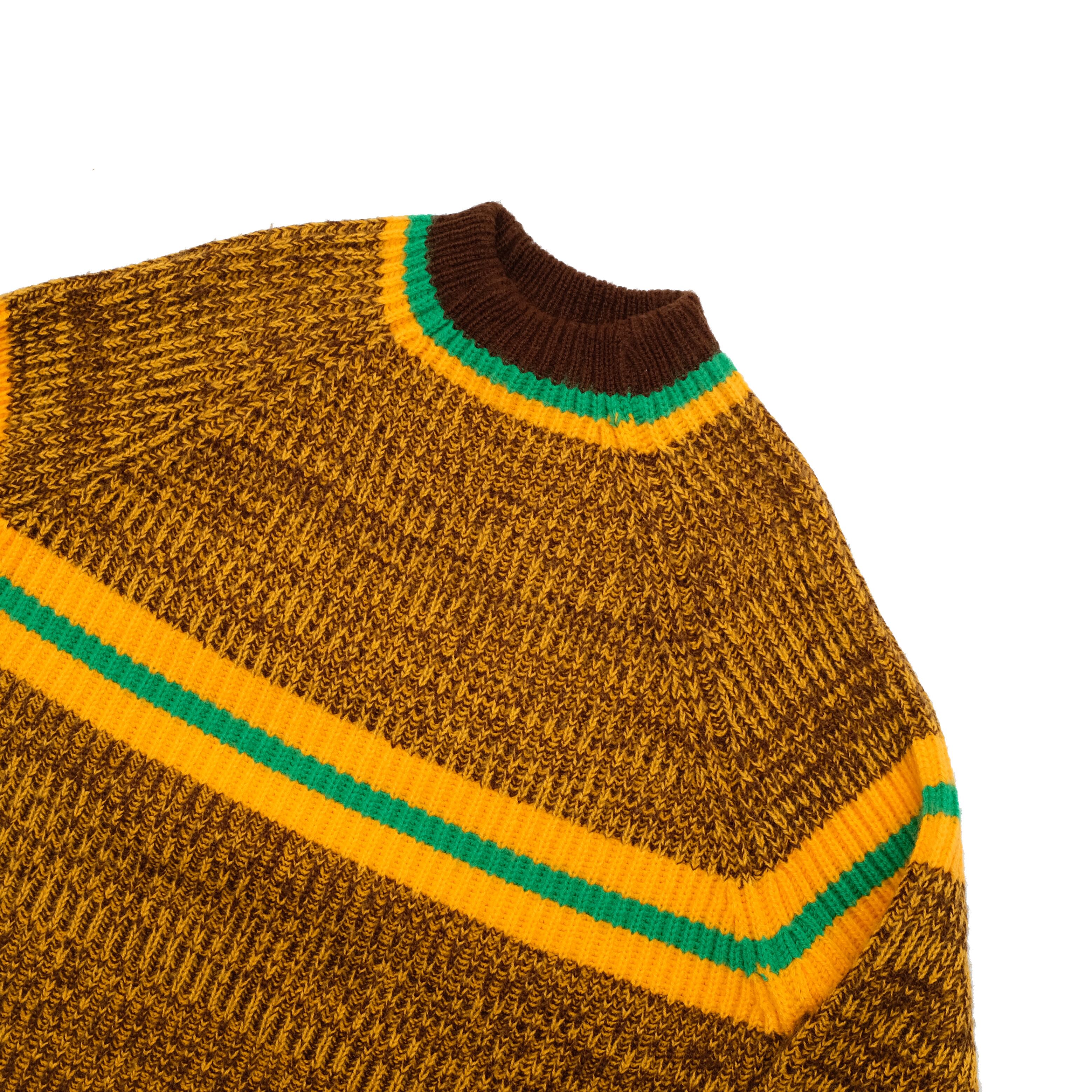 タグから得られる詳細が不明な一枚ですが、当店で洗いにかけた際にチヂミ、ノビもなく、アクリル製のニットです。やはりこの配色と色目がすばらしい一枚。長めの着丈が細めのパンツやレイヤードに合いそうです。一枚で着ていただくだけで街の中で映える、古着らしいいいニットです。