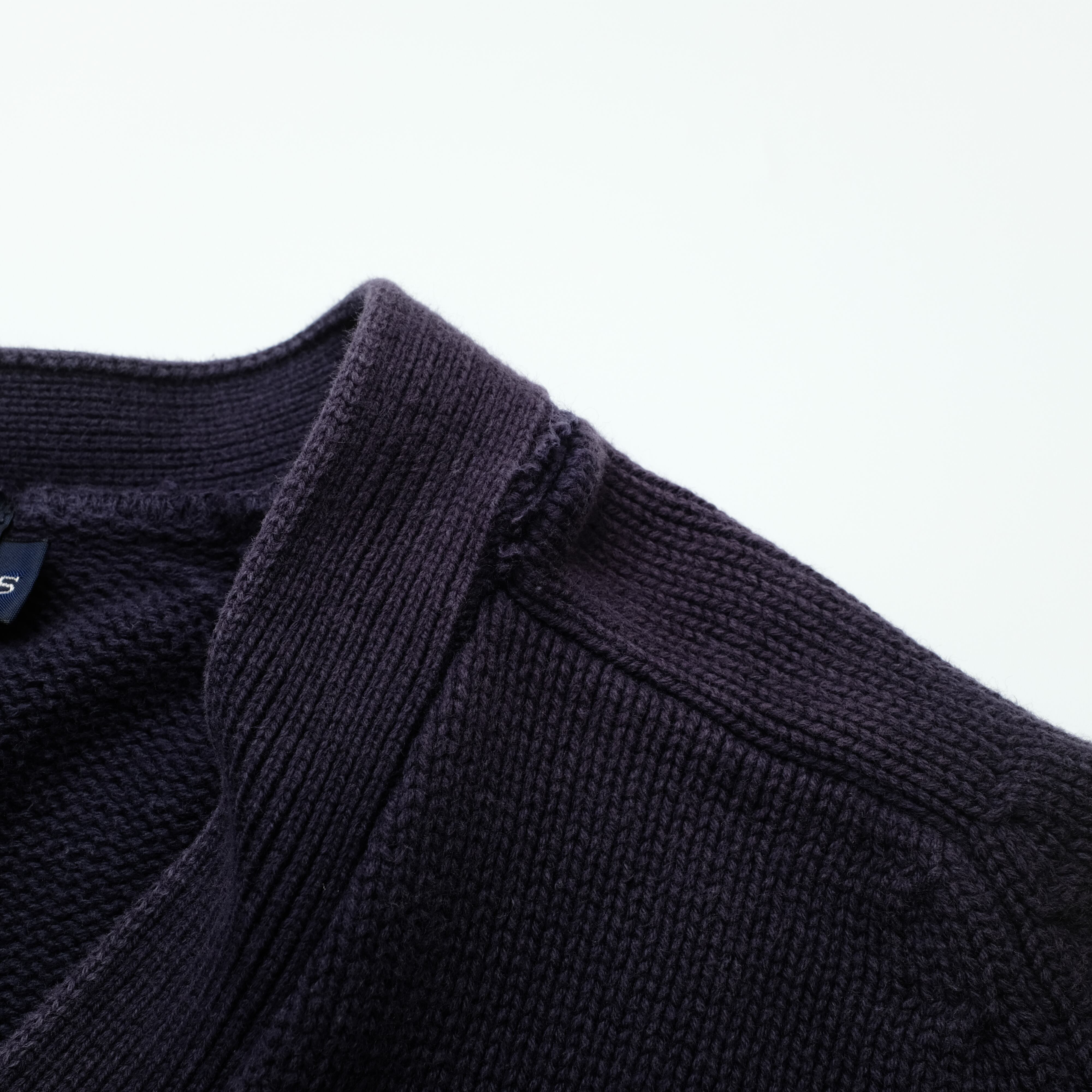 カラーは定番のネイビー。サイズはS表記ですが若干大きめの作りです。やはりコットンニットは頑丈で洗いやすいこと、そして着込むごとに良くなっていく生地感が魅力的ですね。この冬、気兼ねなく着れる洒落た一枚ではないでしょうか。