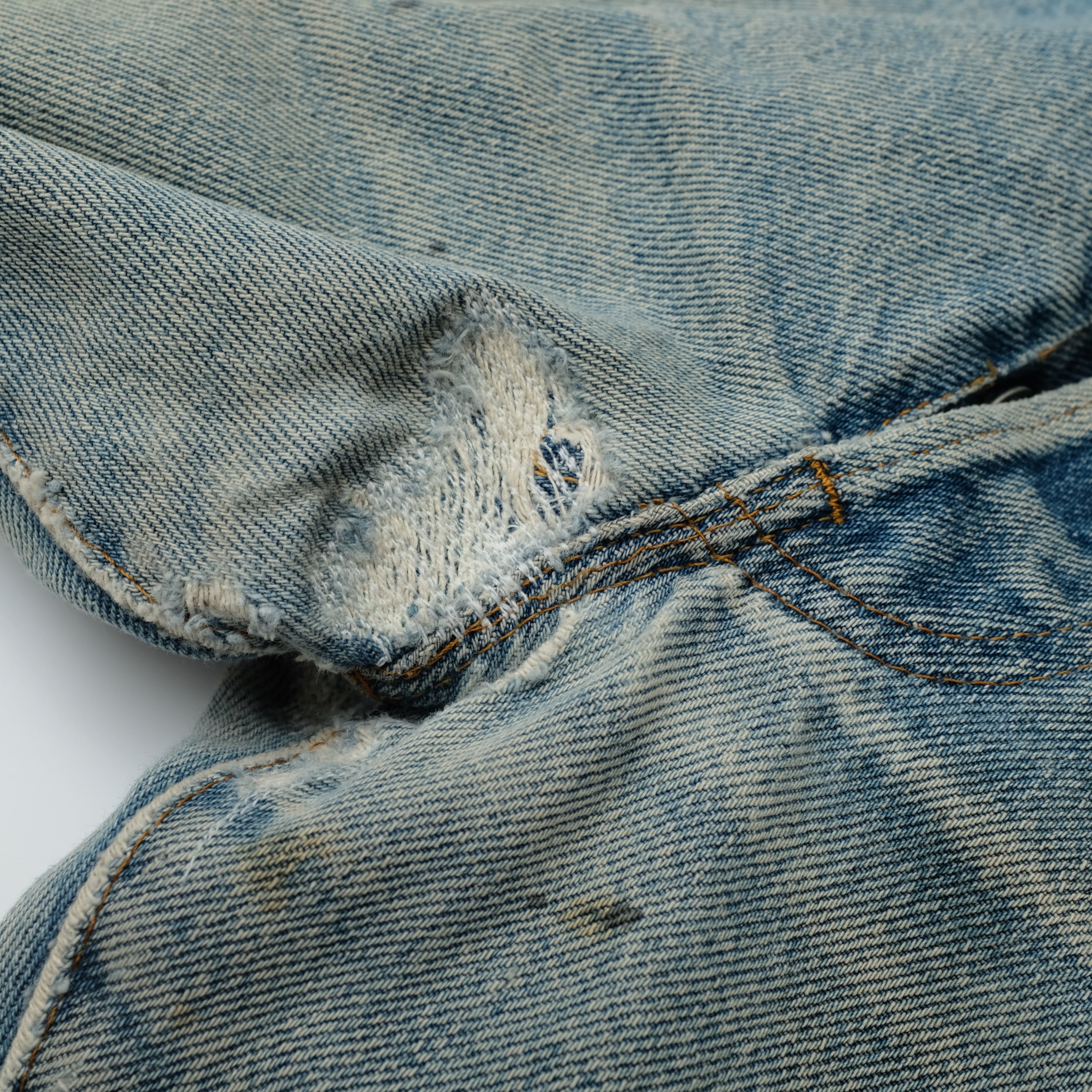 いわゆる"黒カンヌキモデル"の一本。66後期の直後、赤耳のついたレッドラインモデルと同年代に並行して製造されたモデルとなります。写真の通りの素晴らしい色落ち。さすがこちらの年代といったところでしょうか。66前期以前の縦落ちではありませんが、インディゴの深い色味が魅力的です。クラッシュしたコンディションだと心配な股部もリペア済みですので、永く穿いていただけそうです