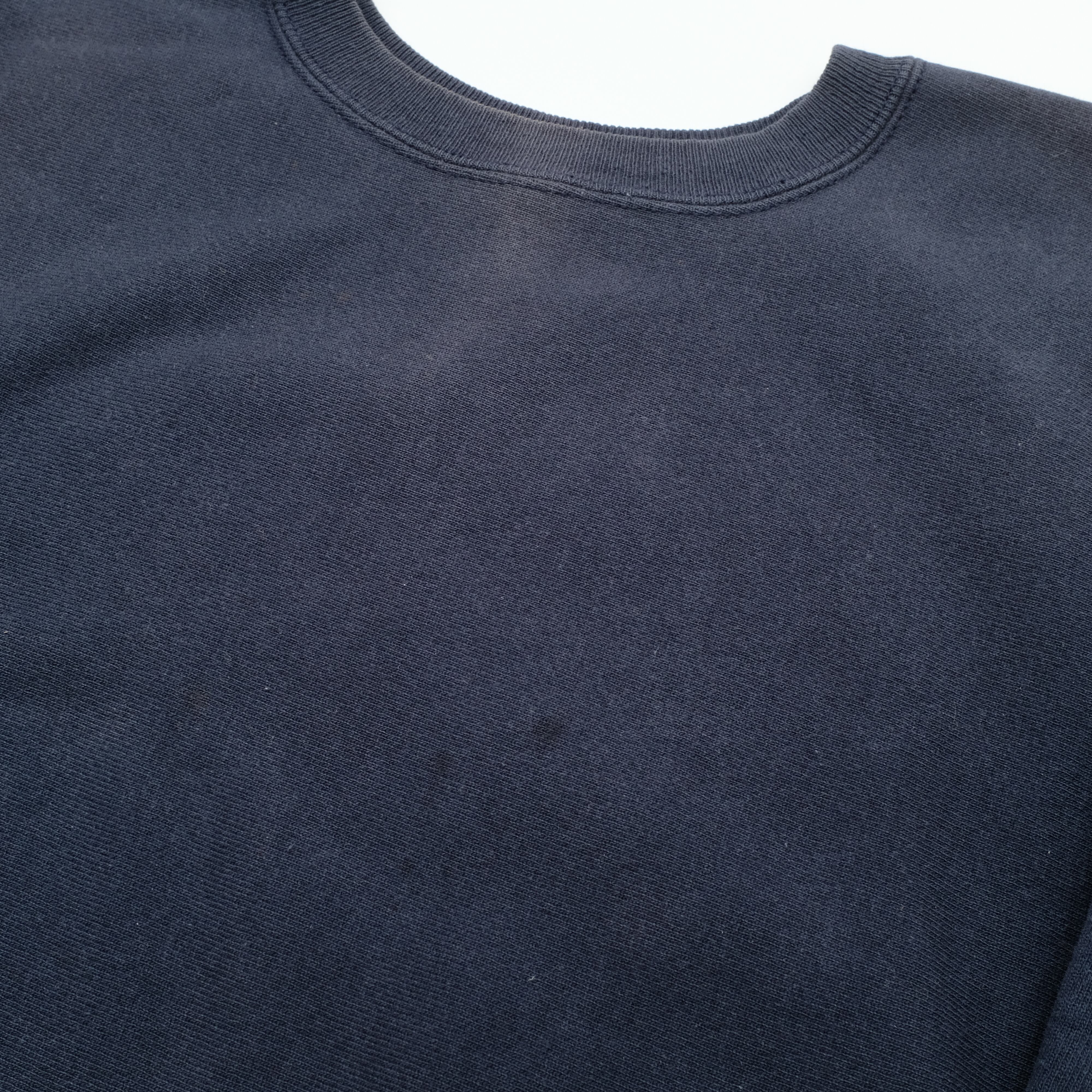 首元、左肩にフェードはございますが、ネイビーはやはりフェードの雰囲気も素晴らしいですね。また、ストロボを焚いて撮影しておりますので、写真よりフェードは気にならないかと思われます。XLのサイズ、90's刺繍タグ、目無しと、言うことのない好条件の一枚かと思われます。流行に左右されない万能の一枚、是非ご検討ください。