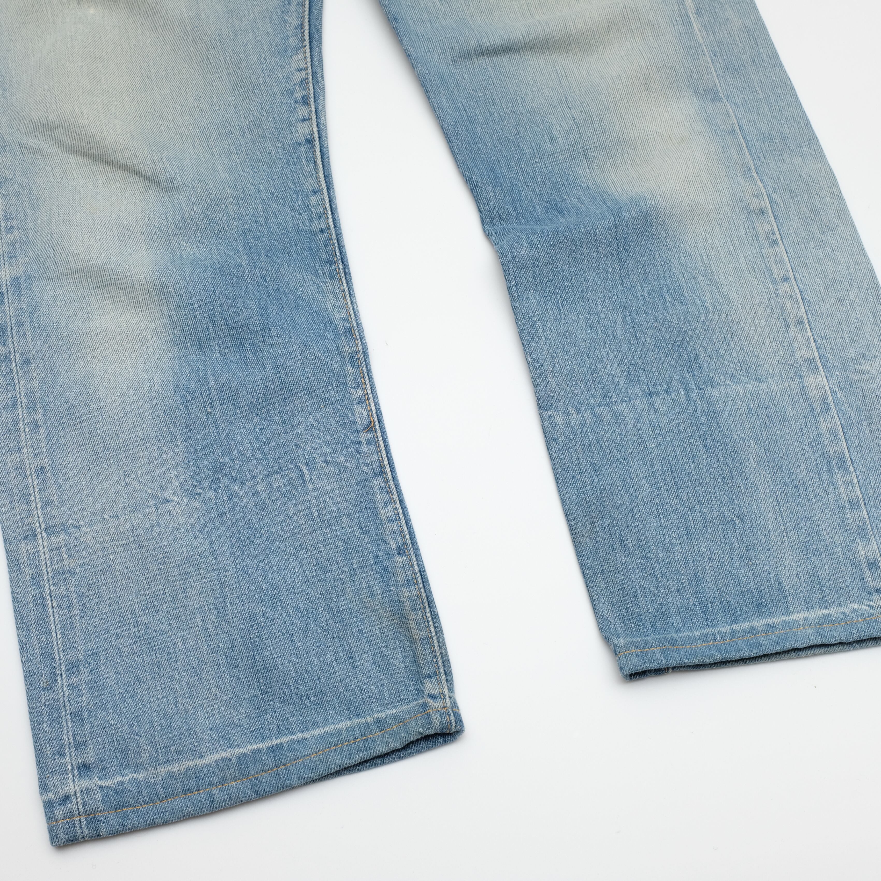 【状態】全体的に着用感、スレ、フェード、裾上げ。左ベルトループにダメージ。右膝部ダメージ。裾部折り返し跡。裾から20cmほど上の部分に織りキズのような若干のフェード。バックポケットに若干のヨゴレ。