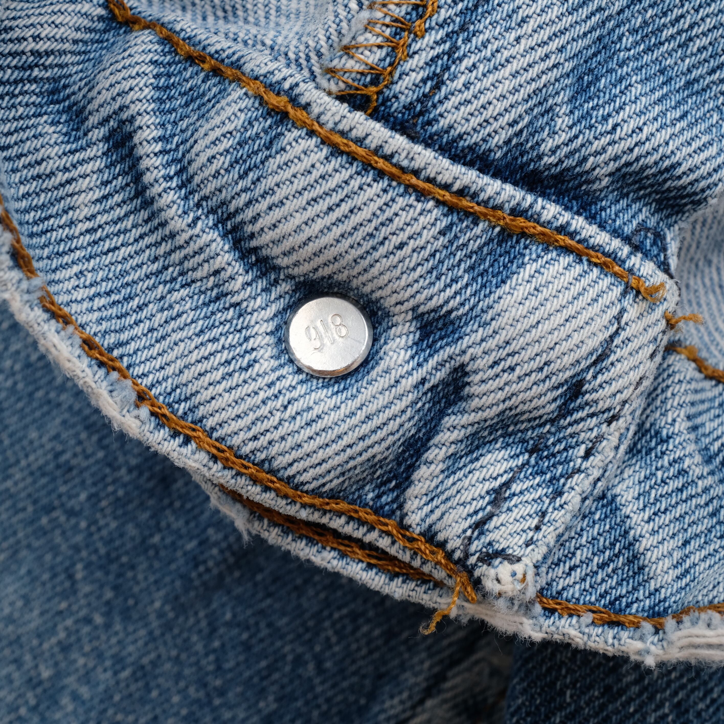 【状態】全体的に着用感、スレ、キズ、フェード。右側バックポケットにダメージ。両裾部にダメージ。両裾部内側にダメージ。右膝部にヨゴレ。ボタン裏918。