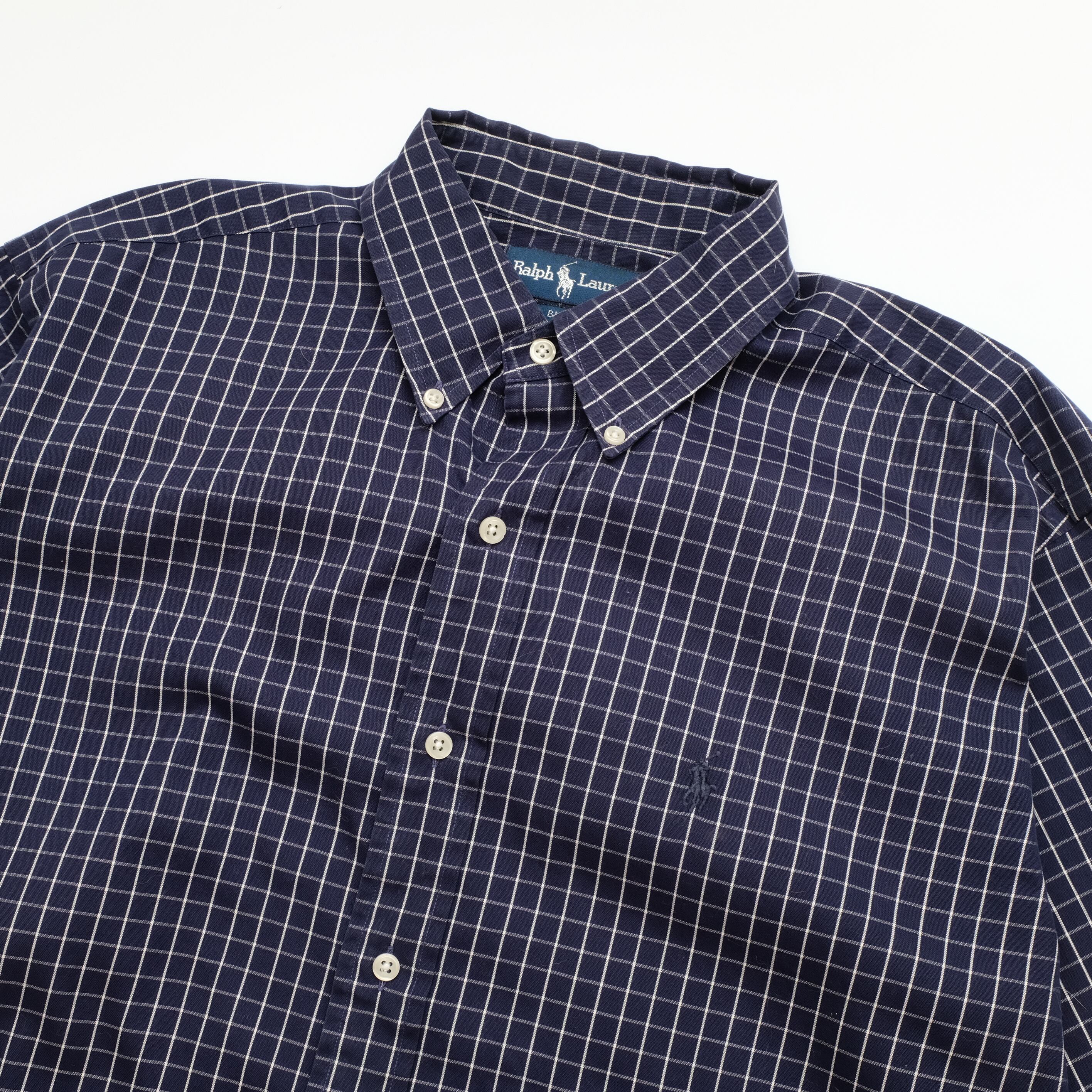 ネイビーにホワイトの格子柄が目を引く良い配色のこちら。生地にはハリが残り、目立つダメージなどもないグッドコンディションの一枚です。ポロラルフローレンではない本家ラルフローレン。やはりクオリティが高いです。加えて人気のBLAKE。今の時代に着たい古着ですね。言うことなしのいいシャツです。