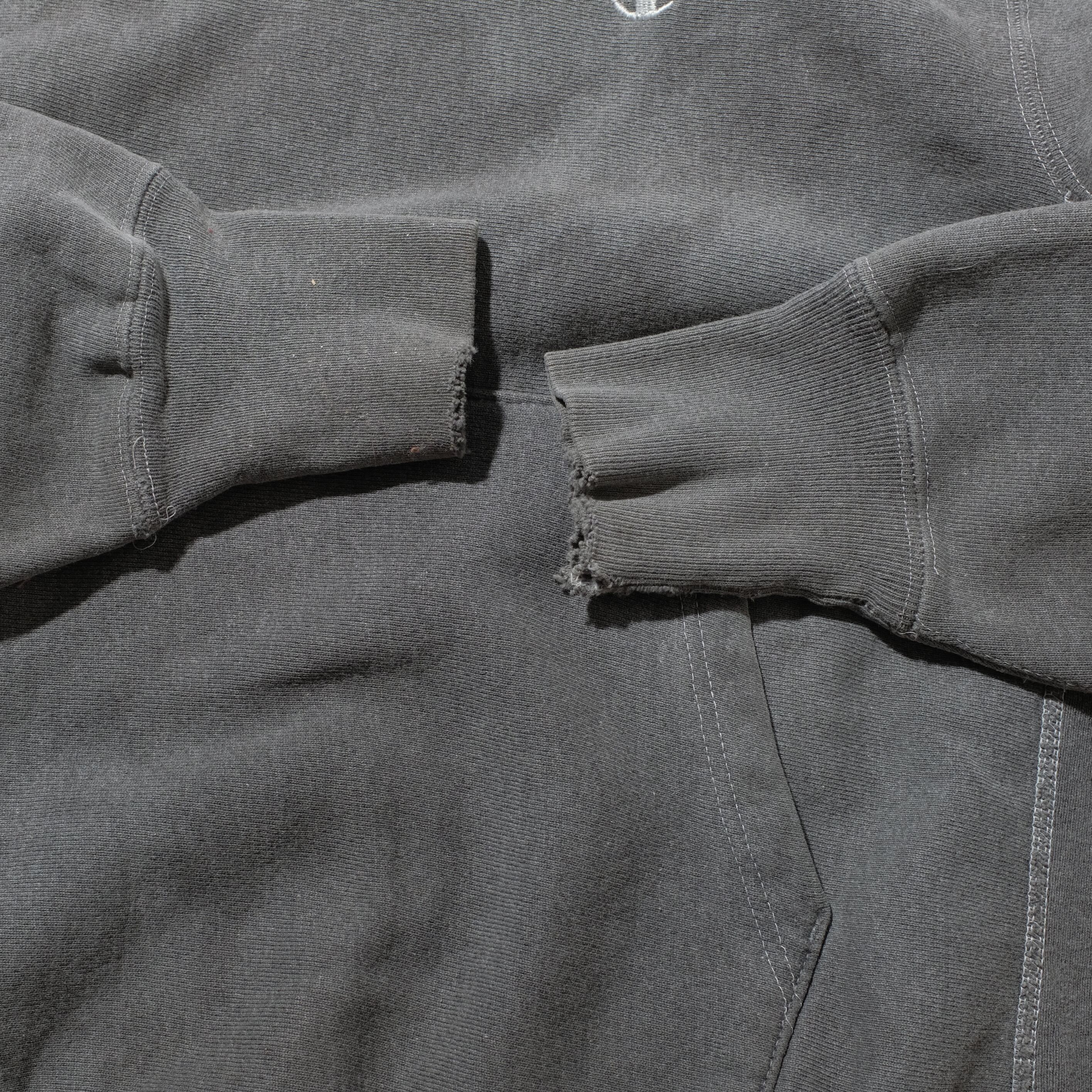 アスファルトグレー、チャコールグレーなどと称されるこのカラー。やはりダークなトーンに表記Lのサイズがファッション的に合わせやすいということで重宝しそうですね。袖のリブにダメージ、ところどころにヨゴレもあるコンディションですが、最も気になる首元にはダメージもなく、まだ生地にもまだハリの残る良好なコンディションです。なかなか次に用意することの難しいであろうこのカラーにLというサイズ感。是非ご検討ください。