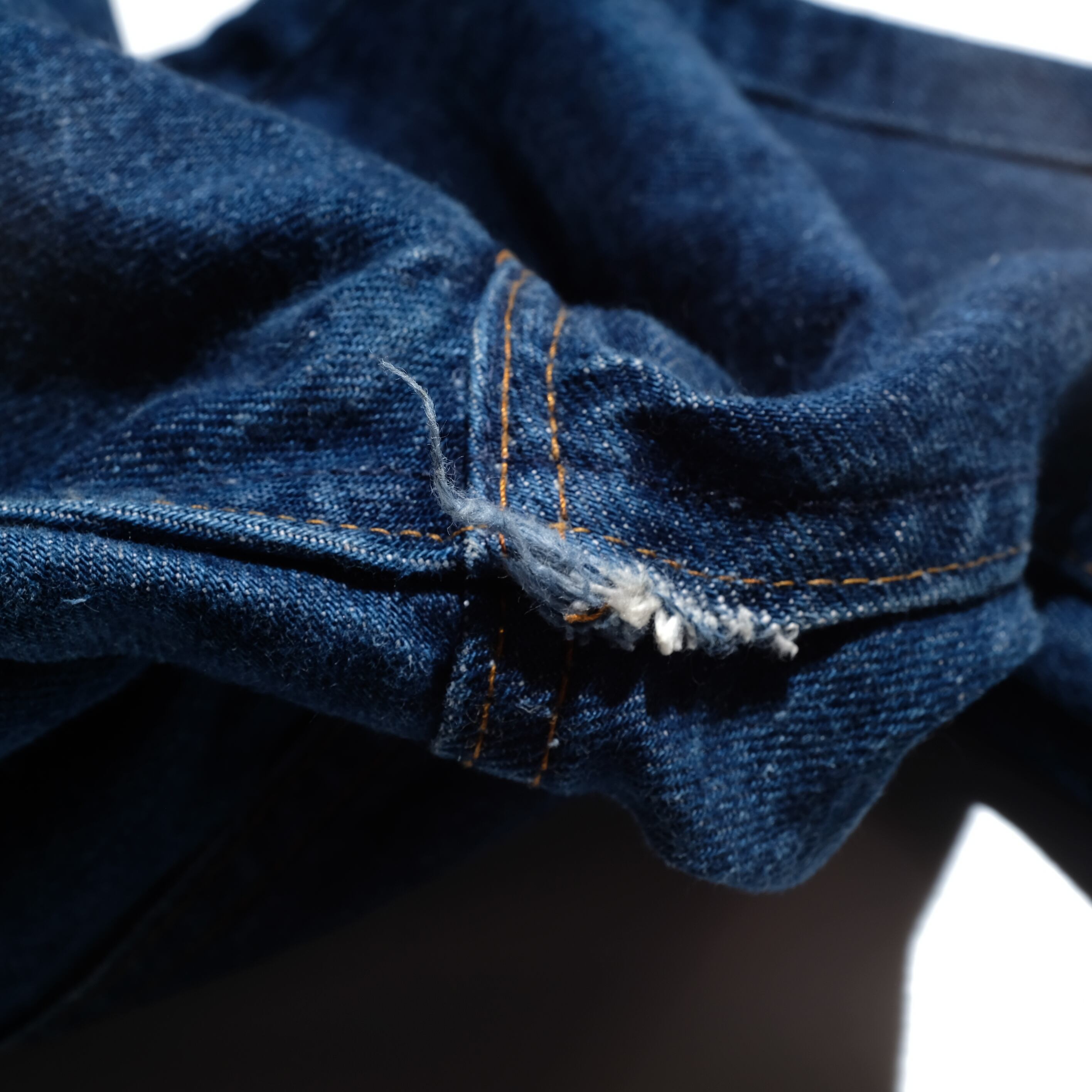 【状態】全体的に着用感、スレ、フェード。裾上げ。インディゴの色濃く残る良い状態です。インシーム部分より、シルエットを細くするカスタムが施されています。それによって若干生地が股部よりほつれていますが現状着用に問題はございません。