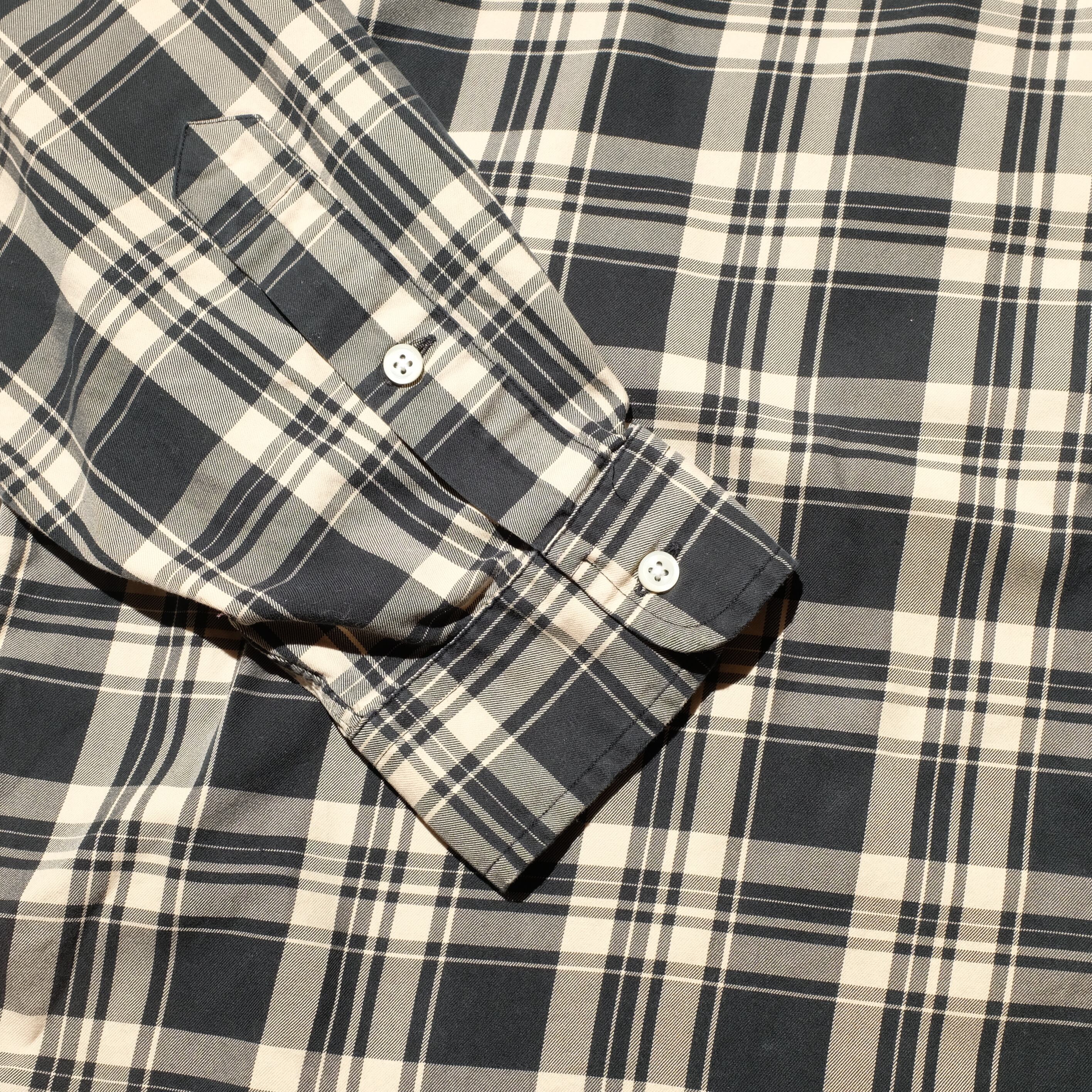 大きめの作りが特徴のBLAKEの中でも、こちらは貴重なブラックベースのチェックが目を惹く一枚。一枚こちらを入れていただくだけでコーディネートをまとめてくれそうですね。表記XXLのBLAKEですのでかなり大きめなサイズ感ながらも綺麗なシルエットが抜群ですね。