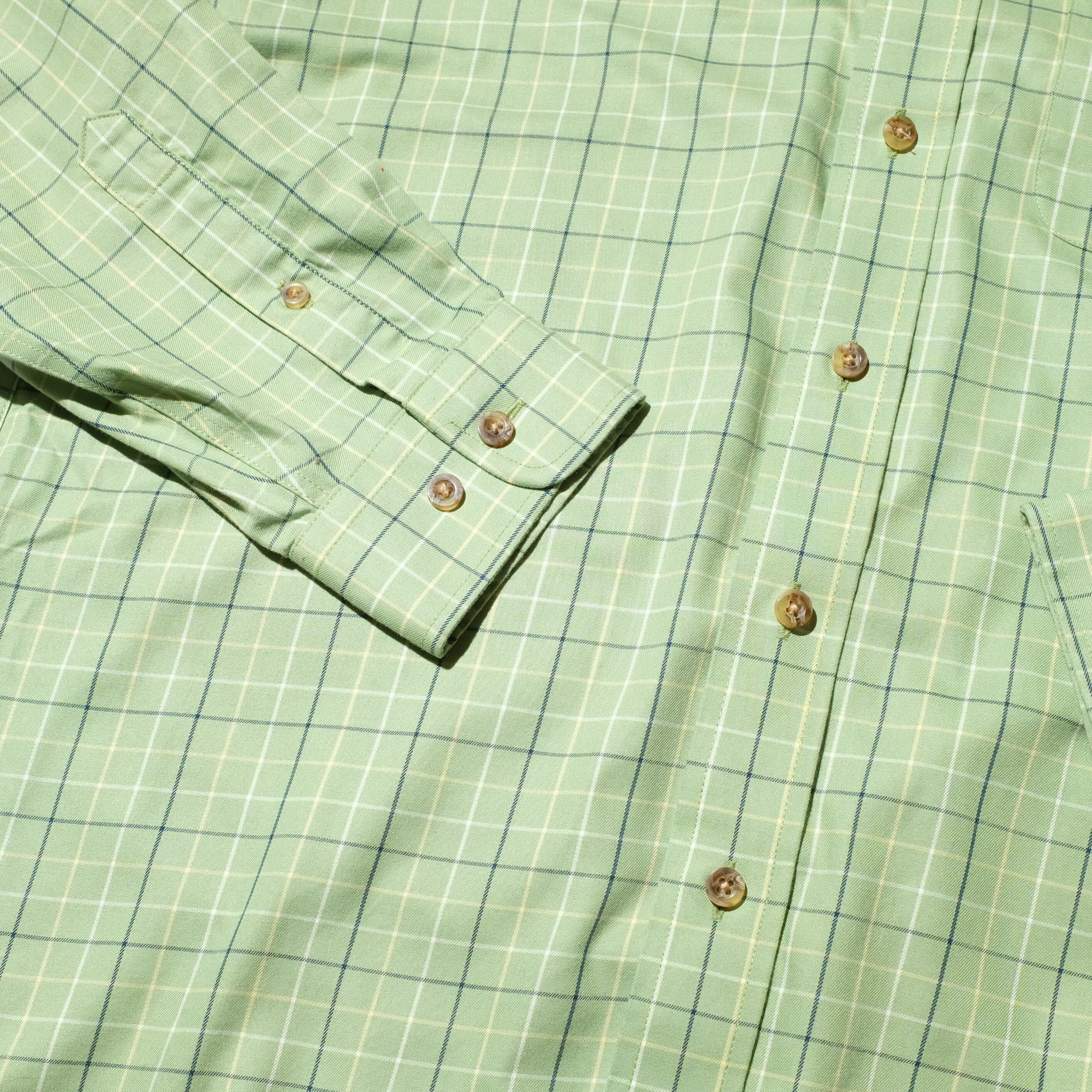 あまり見かけない、ライトグリーンのカラーが目を惹く一枚。こういったカラーのシャツは一枚持っておくと重宝します。格子柄のチェックも全体のコーディネートに清潔感を加えてくれます。コンディションも良い、コットン100%のボディは長く愛用していただけそうです。同ブランドらしい、ある種生真面目とも言える一枚。そんな一枚の中で、カラーで遊んでみるというのも良いのではないでしょうか。ぜひご検討ください。