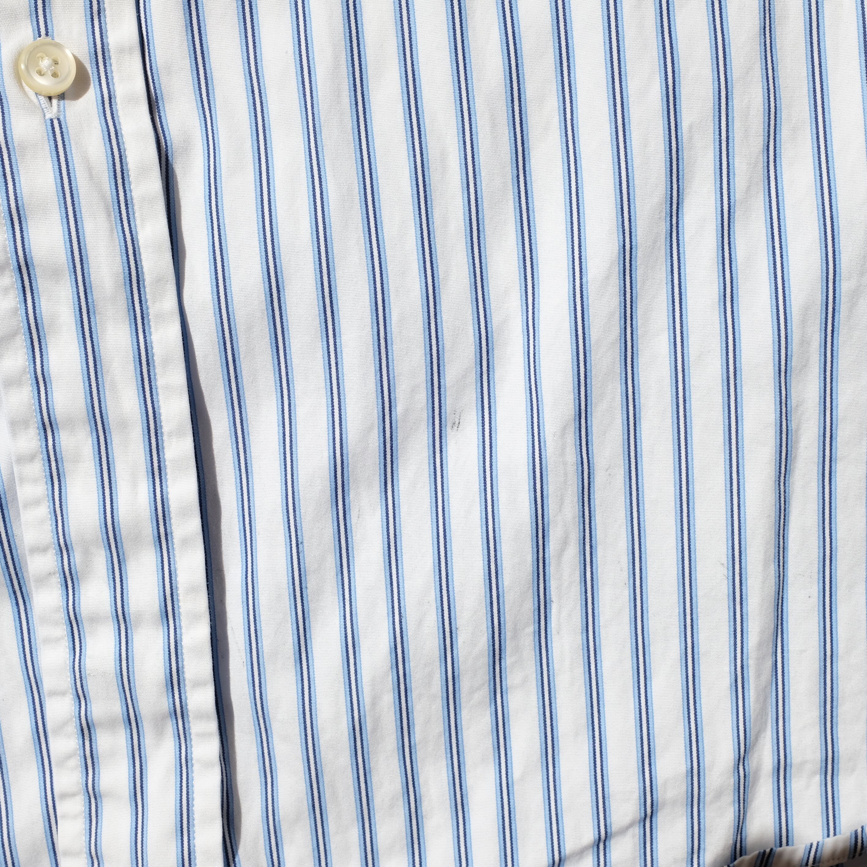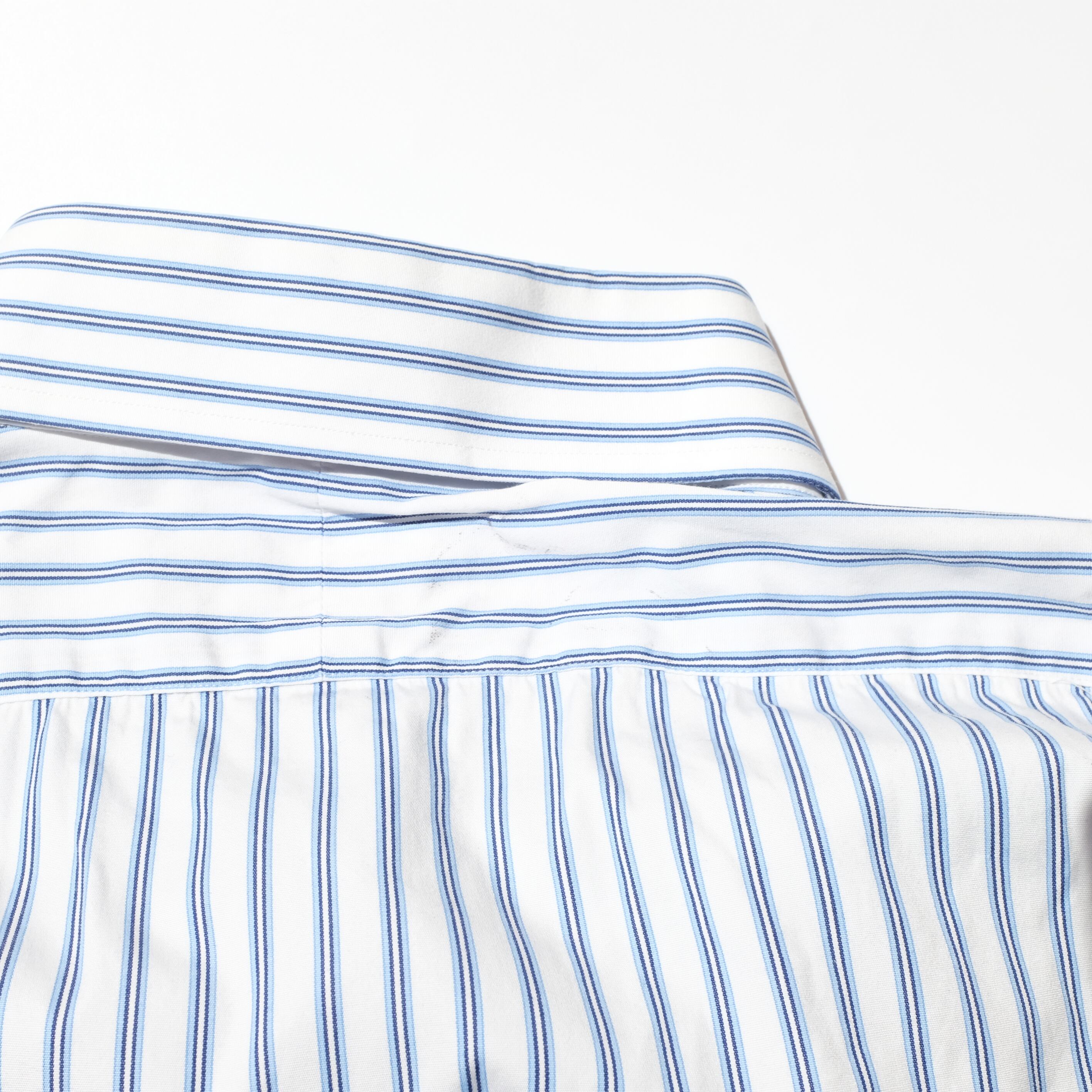 ブロードの生地感にストライプ柄が上品な1枚。胸にポニーがつかず、襟も小さめのややドレッシーなディテールが様々なコーディネートにハマってくれそうですね。17ハーフ表記、一般的なXL程度の大きめに着ていただけるサイズ感。ジャストよりは着崩す感じの出るこのサイズは多くの方に楽しんでいただけそうです。