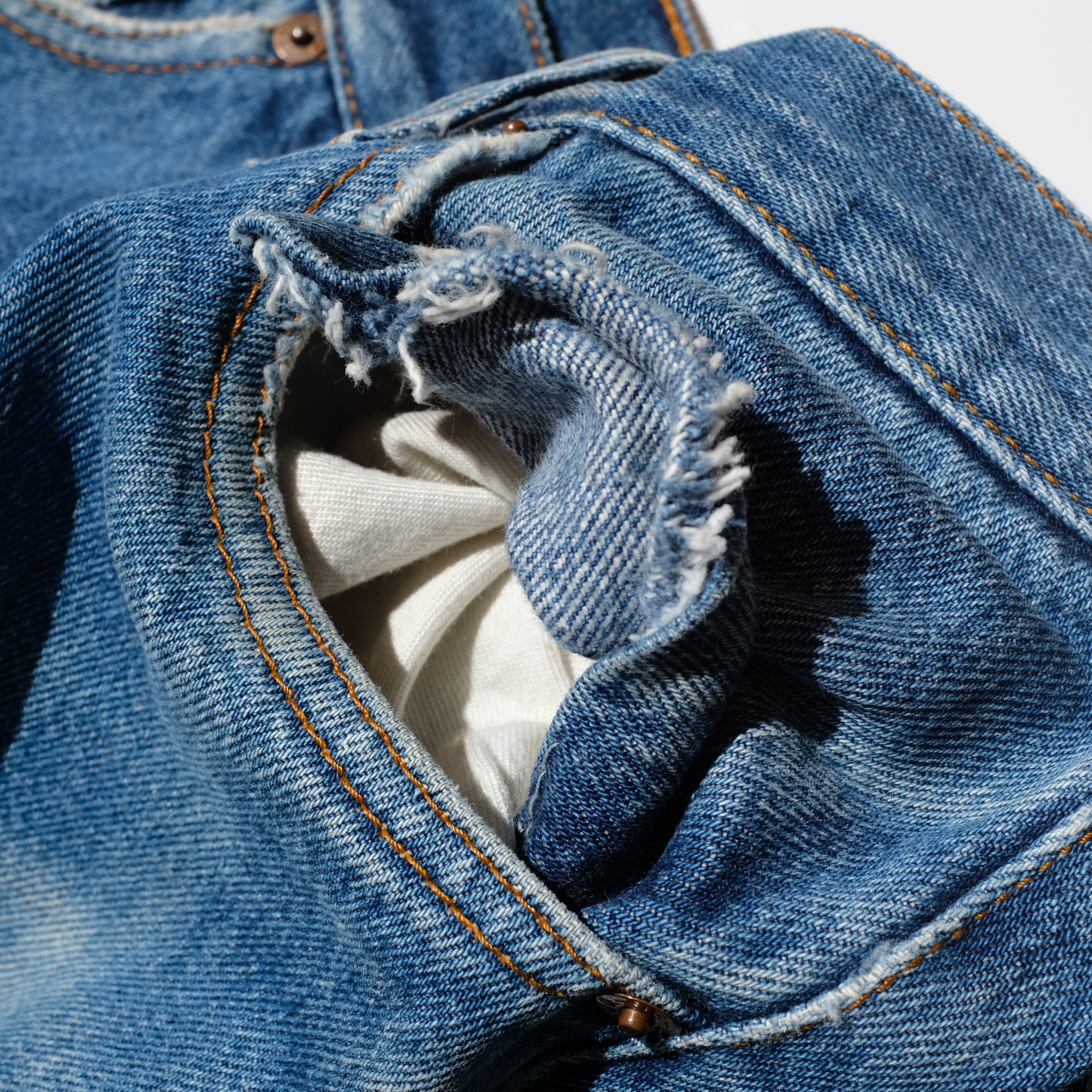 内股シングルモデルといわれる赤耳直後の個体。もはやこのあたりはヴィンテージと呼べるでしょうか。うっすらとついたヒゲやフロントのヨゴレなど、穿きこまれた雰囲気が魅力的です。やはりそれ以降の年代のものとは違ったインディゴのカラーに説得力を感じますね。お好きな方、是非ご検討ください。