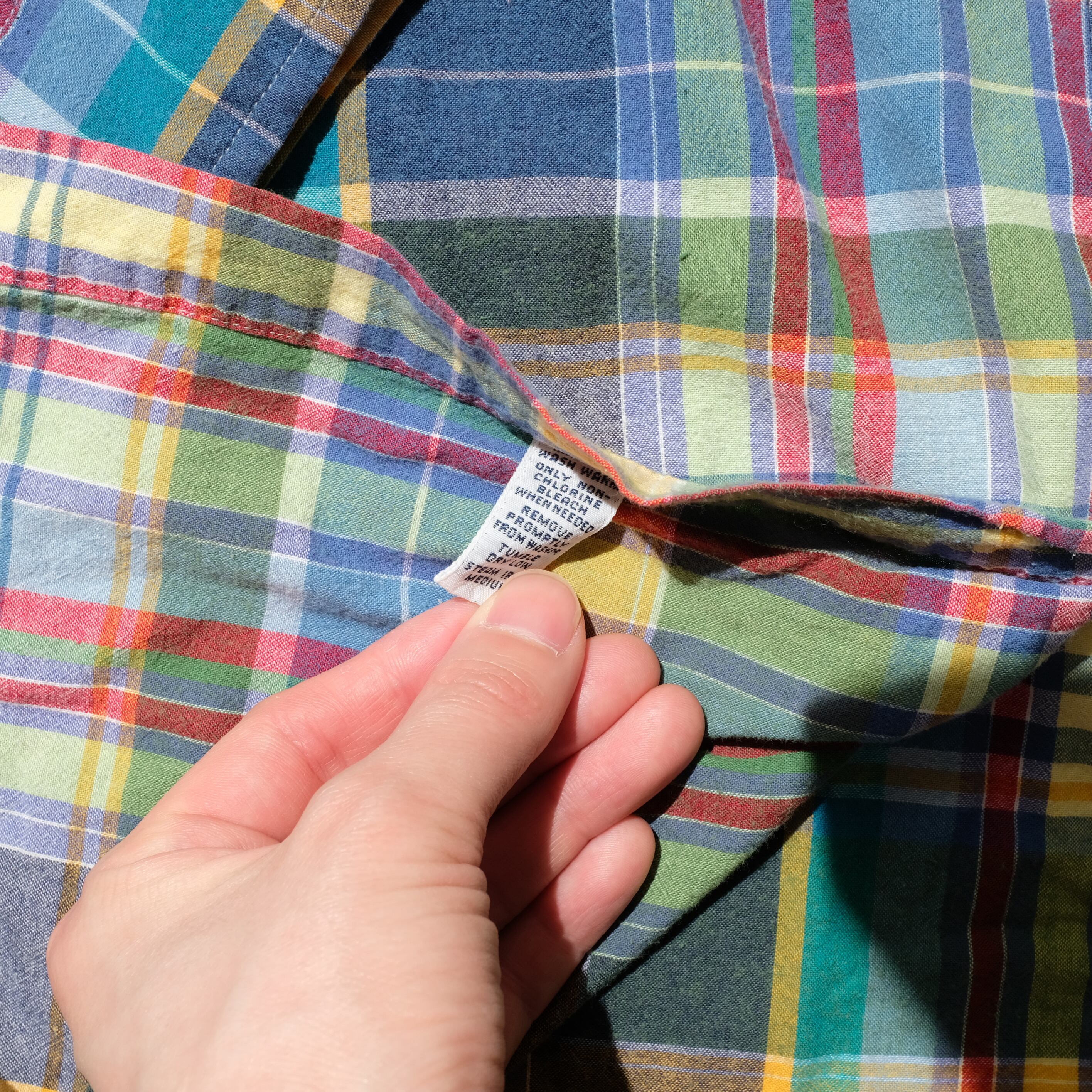 広めの身幅が現代のファッションにしっくりくることで探されている方も多い印象のこちら。カラフルなマドラスパターンも鮮やかながらも少し落ち着いた雰囲気で着ていただけそうですね。表記XL、そしてマドラスですと人気のインド製。大人っぽくスラックスなどに合わせていただきたいですね。