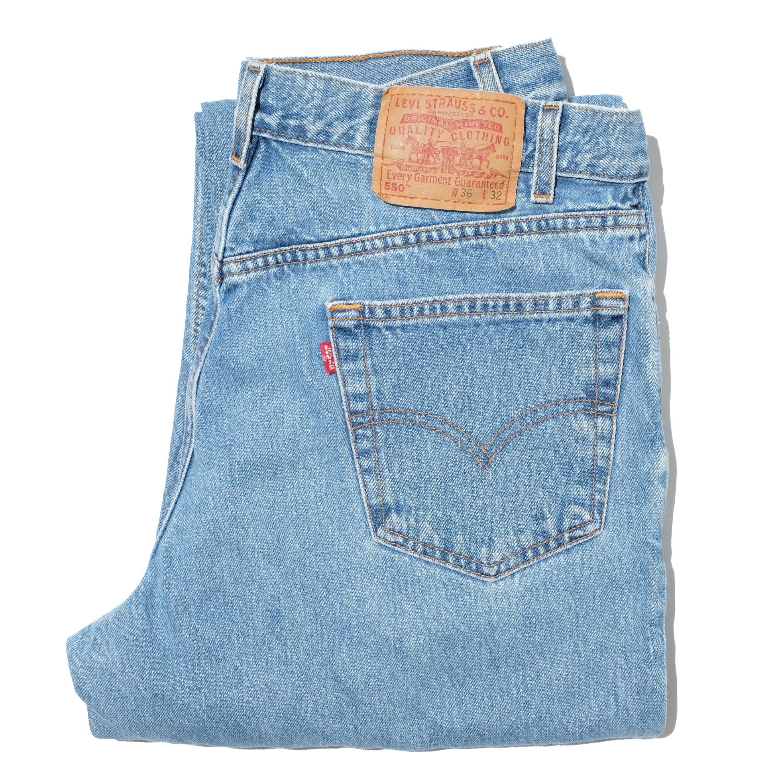 大きく穿いていただけるサイズにウォッシュのかかったインディゴブルーが穿きやすそうな一本。550特有の太めのシルエットは一本持っておくと重宝します。やはりこれ以降の年代のものになるとアーキュエイとステッチの形やインディゴの色などオールド感が減っていきます。あえて古着を選ぶのであれば、やはりこちらの年代。定番として、是非ご検討ください。