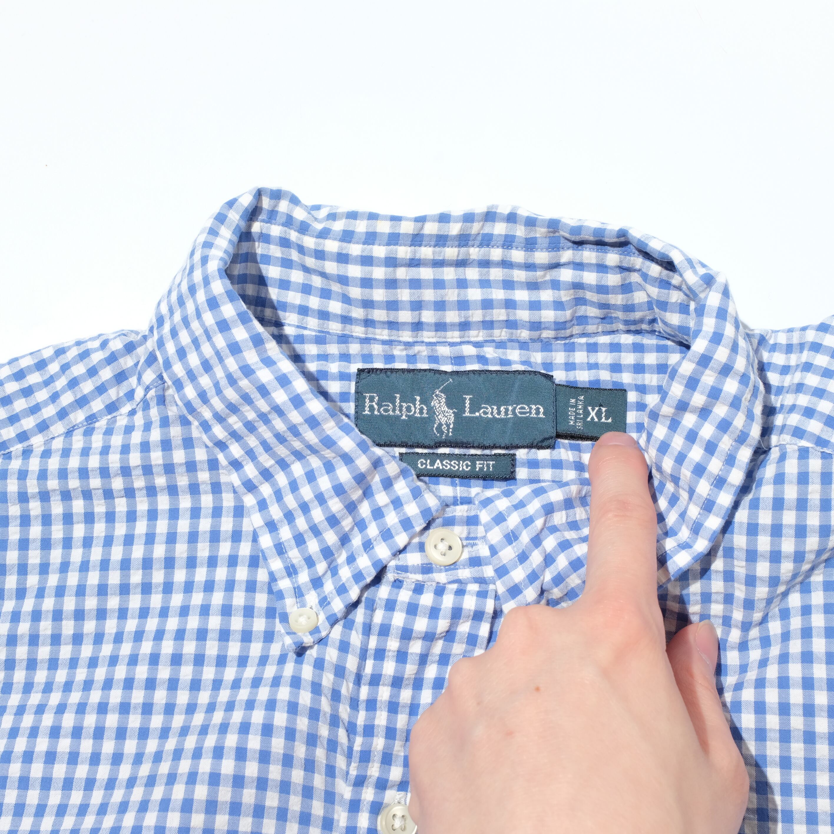 夏らしいシアサッカー生地に爽やかなギンガムが魅力的な一枚。サイズがゆとりを持ってきていただけるXLですので、かわいらしくなりすぎずハマってくれそうです。胸元のポニーがイエローというのも印象を明るくしてくれますね。残念ながらフロントにヨゴレがございますので、プライスに反映しております。