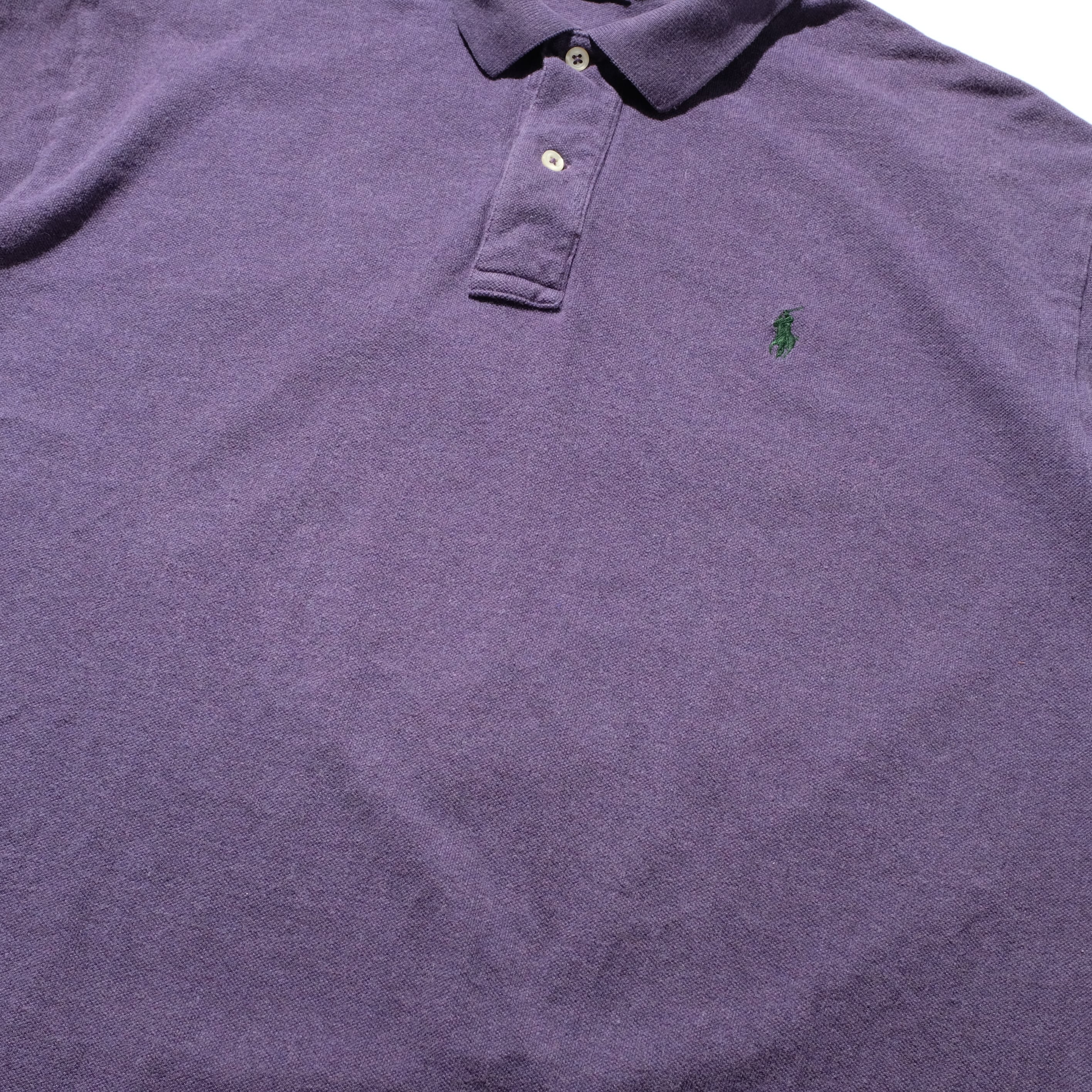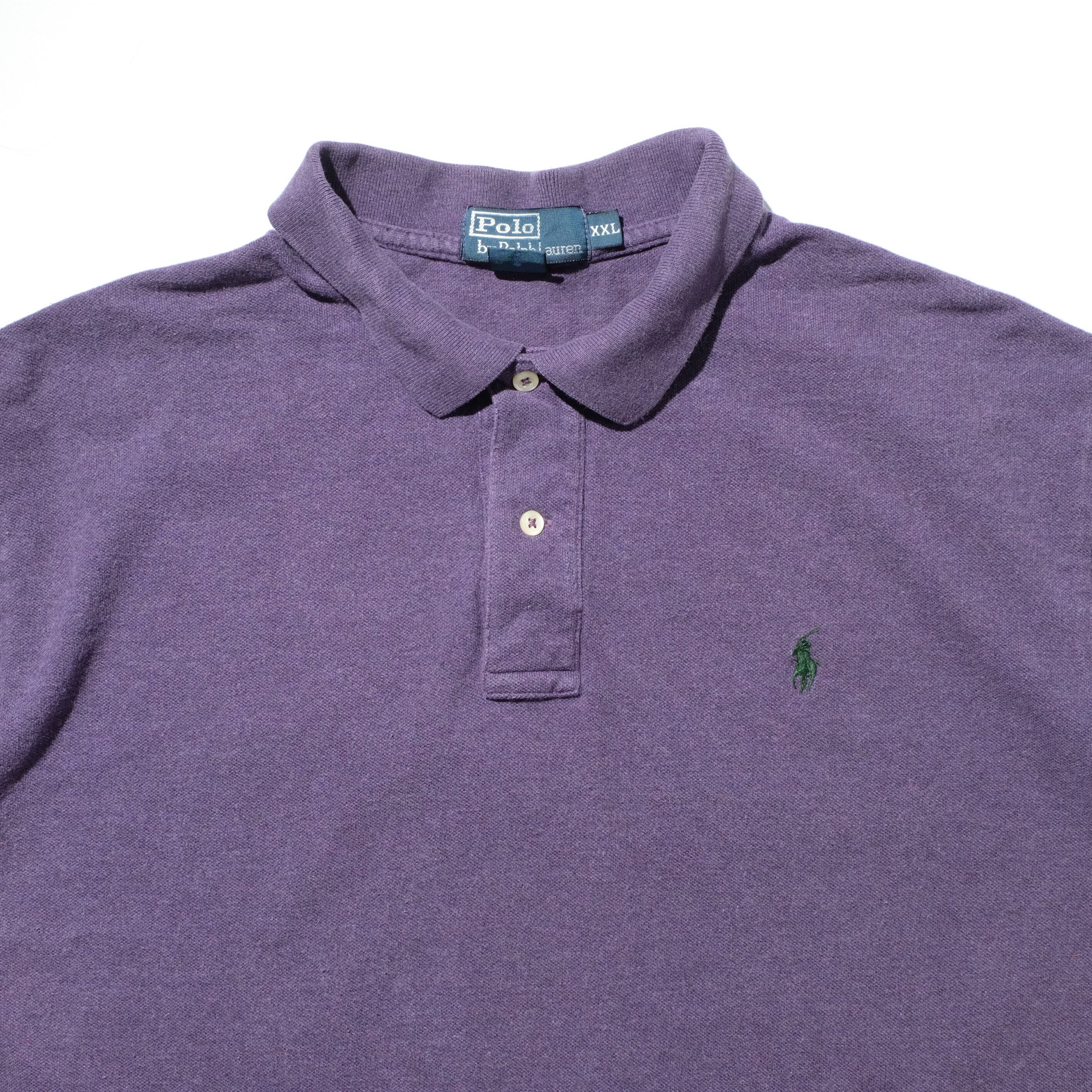 poloの中でも定番の商品、鹿の子のポロシャツ。ボタンダウンと並ぶ永遠のクラシックアイテムです。なかでもこちらはゆったりとしたシルエットのXXLサイズの個体。実寸から、着丈というよりは身幅がワイドになったという印象のこのサイズ。このくらいのサイズ感ですと肩を落として袖丈を長く着れるのでおすすめです。カラーもパープルのボディにグリーンの刺繍とかなり気の利いた一枚です。