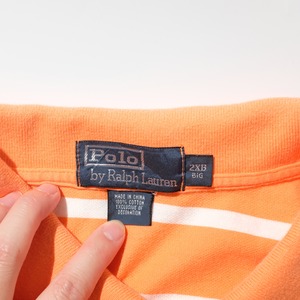 夏らしいオレンジとホワイトのコンビネーション抜群の配色。胸のブルーのカラーのポニーも品が良いです。表記で2XBという2XLより若干ゆったりとした形の個体。ビッグシルエットがお好きな方には絶好のサイズといえるでしょう。オススメの一枚、是非ご検討ください。