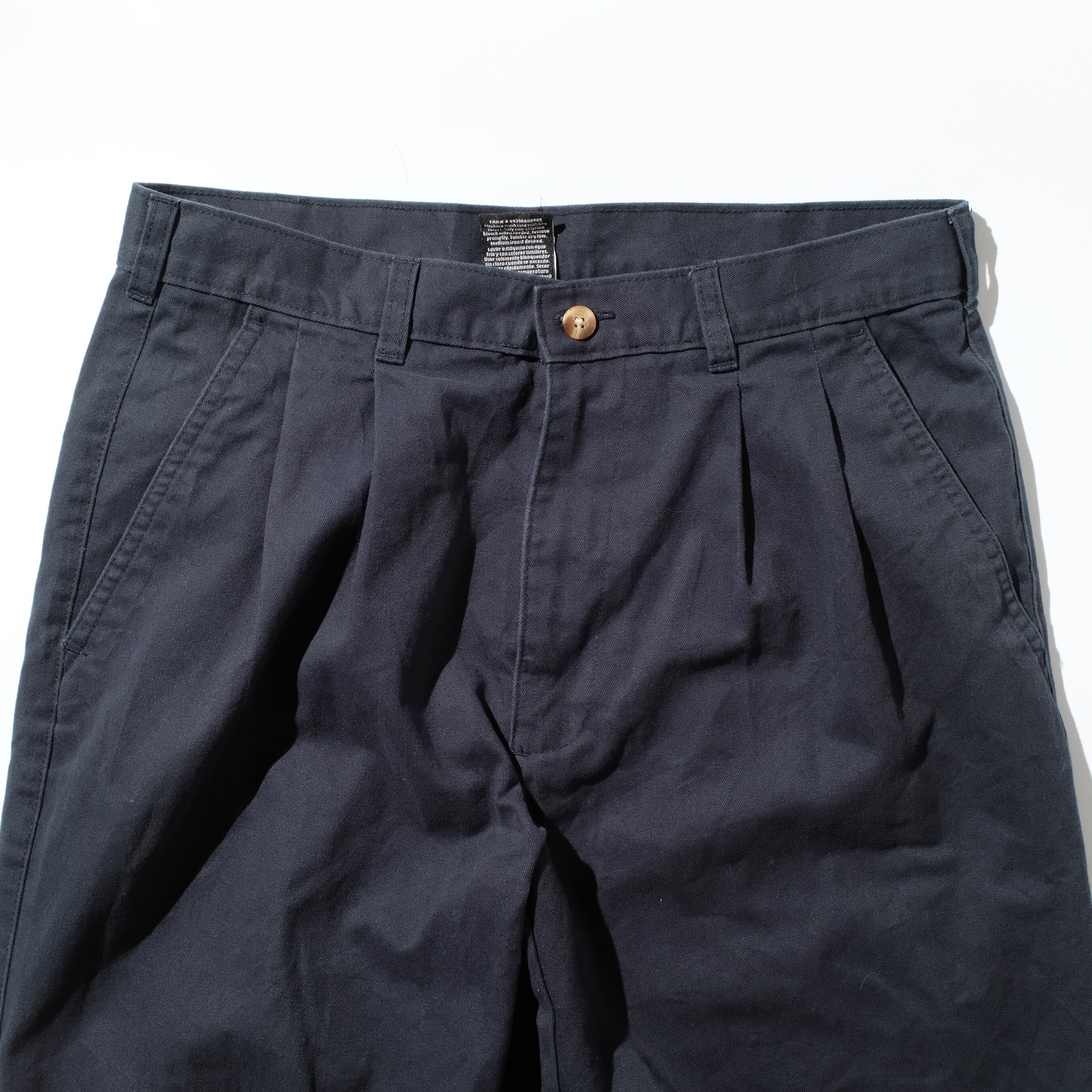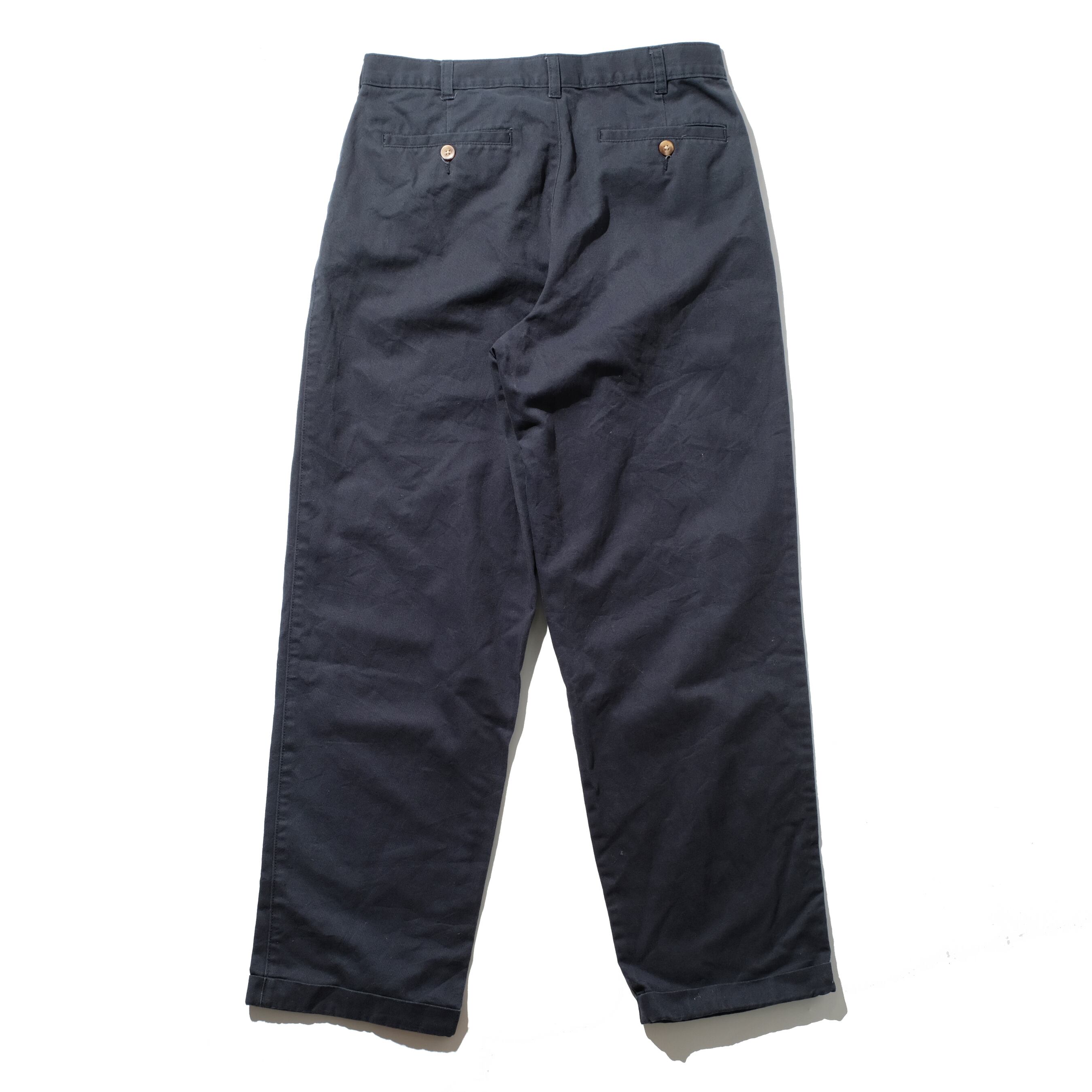 ブランドはイギリスのGEORGE。90's~00's初頭までの年代でよく見かけるブランドで、気の利いたデザインのものが多い印象です。こちらはベーシックな2タックチノトラウザーズですが、コットンとポリエステル混紡の若干光沢感のある生地感。日常着としては使いやすそうです。シルエットも太め、裾もダブルで多くの方のスタイルにハマるであろう一枚。是非ご検討ください。