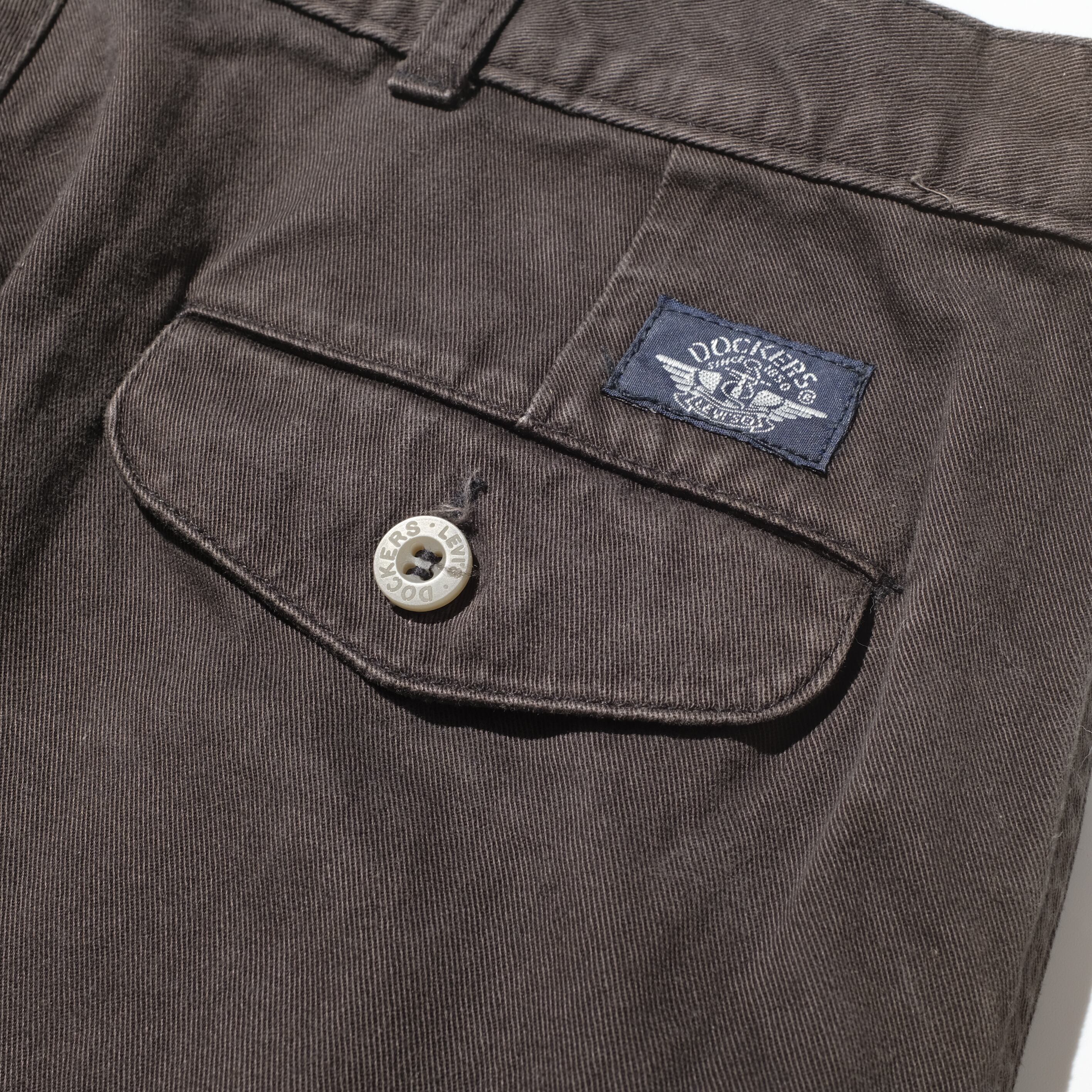 穿きこまれたブラウンのカラーが目を惹く一本。ドッカーズの中ですととりわけ初期に当たる、90's初頭の個体です。その証拠にジッパーはなんと42talon。古着好きにはたまらないディテールですね。古めのドッカーズのバックポケットにフラップのつくこのデザイン、そしてこの太めのシルエットが抜群です。