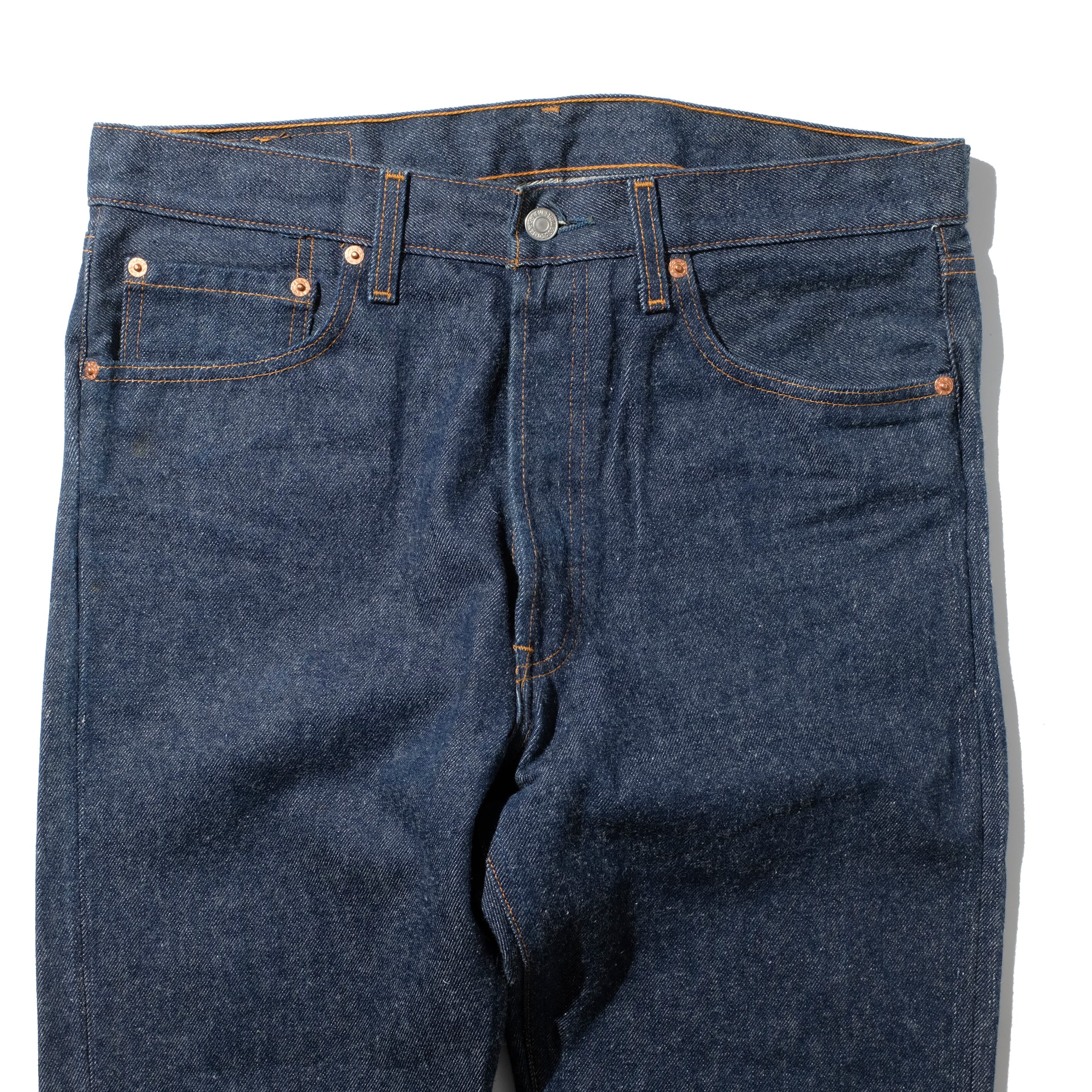 【状態】未使用のデッドストックの商品となりますが、入手時に前オーナーによってアウトシームが縫い付けられ細いシルエットにカスタムされていましたので、一度解いて当店でオリジナルのシルエットに近づくよう手直しいたしました。アウトシーム側の生地を切断してありましたのでオリジナルの501よりやや細身のシルエットとなっております。